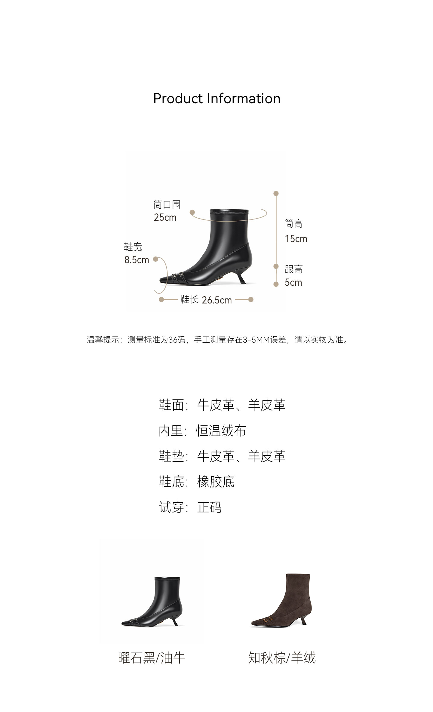 | 鞋底材质:橡胶底 | 靴筒内里材质:绒布 | 鞋面材质:羊皮革 | 闭合方式:侧拉链 | 靴筒口围:25CM |