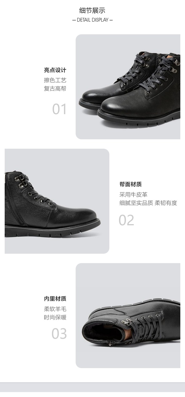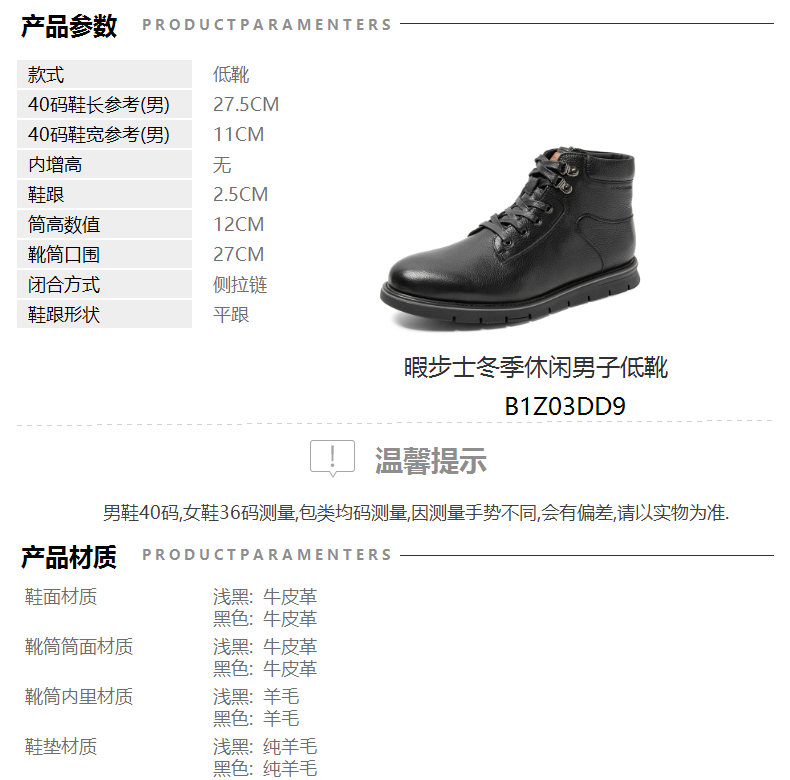 | 鞋垫材质:纯羊毛 | 款式季节:冬季 | 皮质特征:摔纹皮 | 渠道划分:线下同步 | 销售季:19年冬季 |