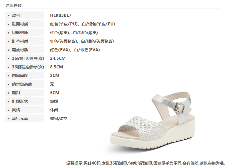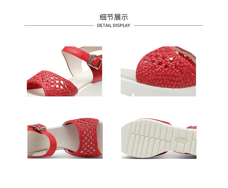 | 鞋底材质:EVA | 面料图案:拼色 | 鞋跟形状:坡跟 | 鞋面材质:羊皮革PU | 流行元素:编织镂空 |