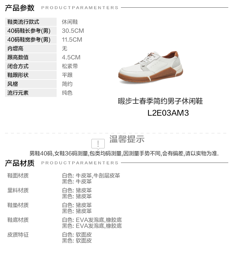 | 风格:简约 | 色系:白色 | 跟高数值:4.5CM | 40码鞋宽参考(男):11.5CM | 性别:男子 |