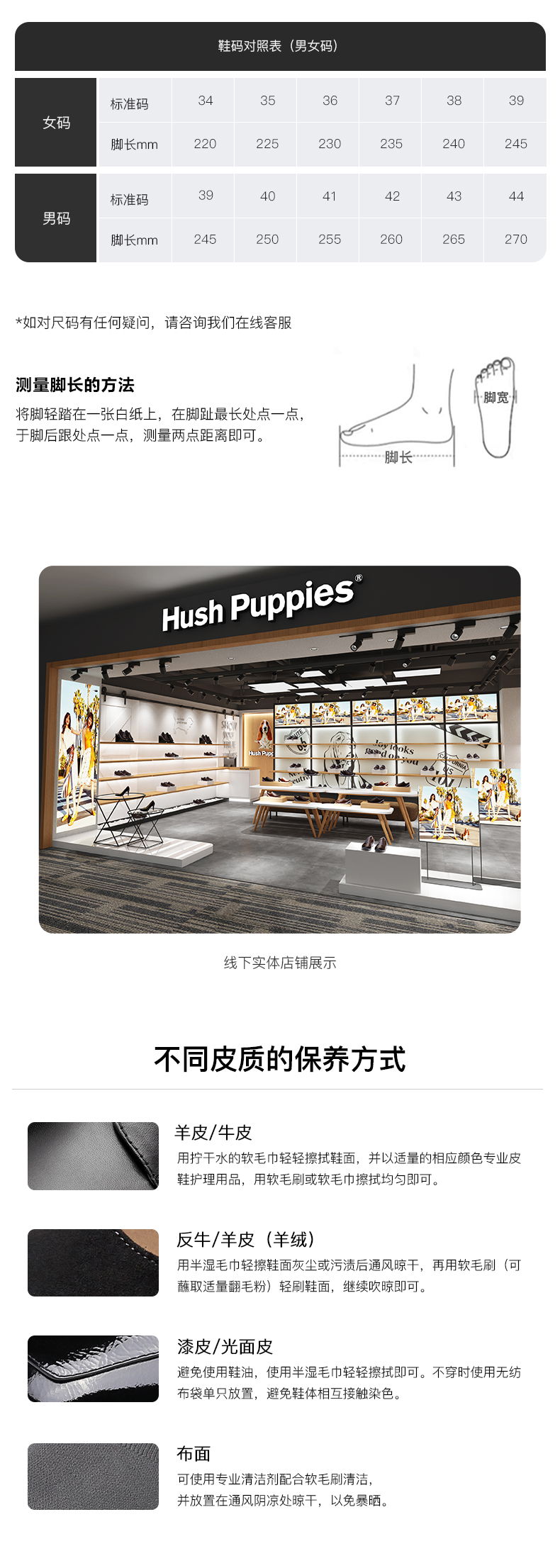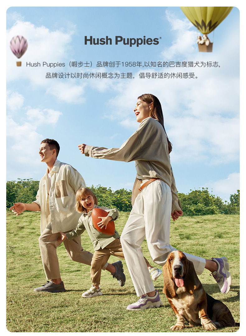 Hush Puppies(暇步士),品牌创立于1958年,以巴吉度猎犬为标志。品牌设计理念以时尚休闲为主,倡导舒适的休闲感受。其不断革新的科技工艺,令鞋品舒适耐穿,树立了令人喜爱的休闲品牌形象。舒适材质与内里,营造舒畅自在的穿着空间,尽情释放随性不羁的年轻姿态;以时尚简约的款型,性感干练的女性特质,搭配舒适粗跟设计,时尚美观给予舒适体验;时尚新潮的设计,配以清新炫目色泽,带来耳目一新的时尚魅力!