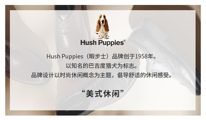 Hush Puppies(暇步士),品牌创立于1958年,以巴吉度猎犬为标志。品牌设计理念以时尚休闲为主,倡导舒适的休闲感受。其不断革新的科技工艺,令鞋品舒适耐穿,树立了令人喜爱的休闲品牌形象。舒适材质与内里,营造舒畅自在的穿着空间,尽情释放随性不羁的年轻姿态;以时尚简约的款型,性感干练的女性特质,搭配舒适粗跟设计,时尚美观给予舒适体验;时尚新潮的设计,配以清新炫目色泽,带来耳目一新的时尚魅力!