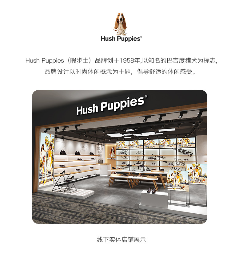 Hush Puppies(暇步士),品牌创立于1958年,以巴吉度猎犬为标志。品牌设计理念以时尚休闲为主,倡导舒适的休闲感受。其不断革新的科技工艺,令鞋品舒适耐穿,树立了令人喜爱的休闲品牌形象。舒适材质与内里,营造舒畅自在的穿着空间,尽情释放随性不羁的年轻姿态;以时尚简约的款型,性感干练的女性特质,搭配舒适粗跟设计,时尚美观给予舒适体验;时尚新潮的设计,配以清新炫目色泽,带来耳目一新的时尚魅力!