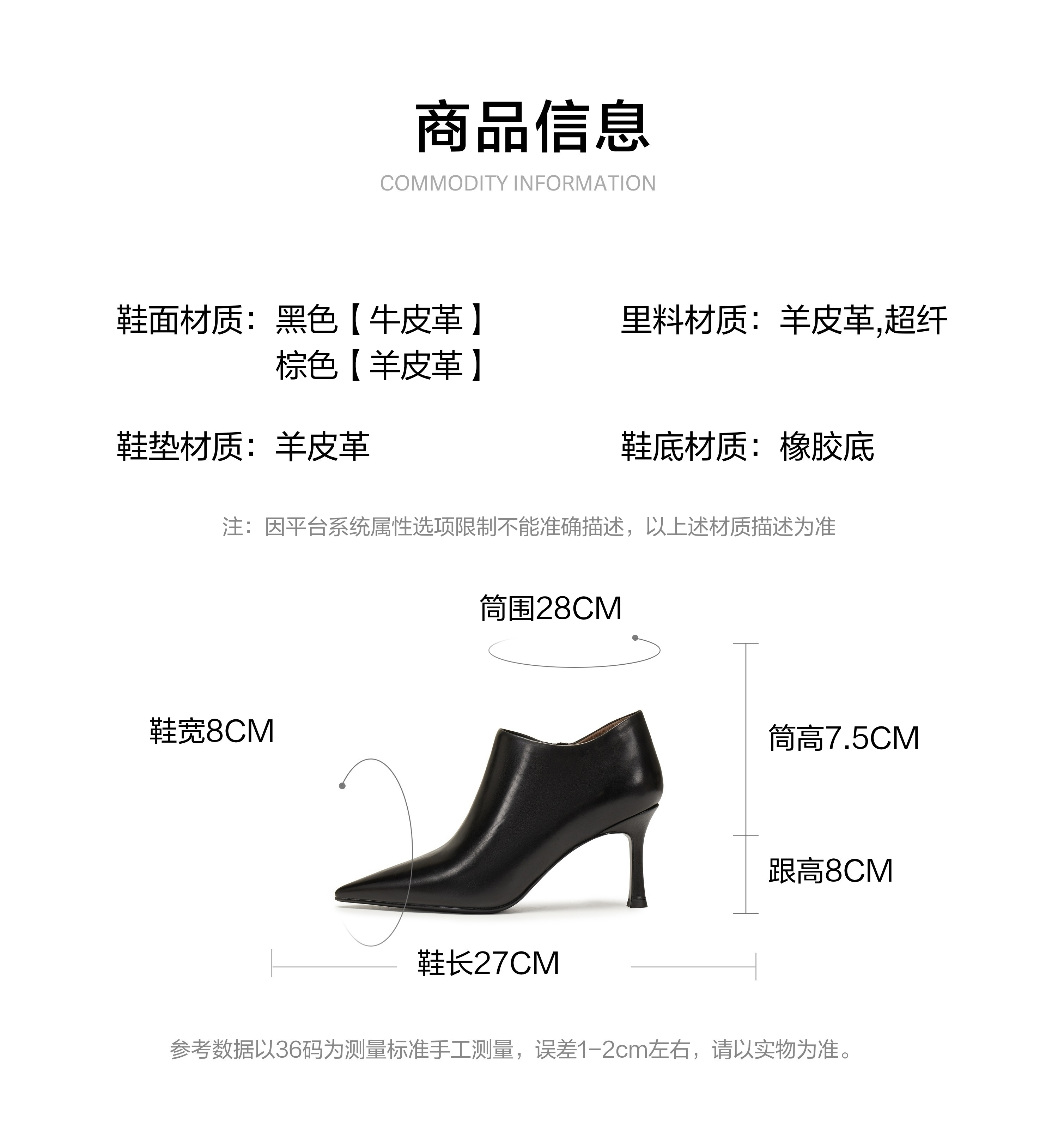 | 筒高数值:7.5CM | 性别:女子 | 靴筒筒面材质:羊皮革 | 里料材质:超纤羊皮革 | 制鞋工艺:车线胶粘 |