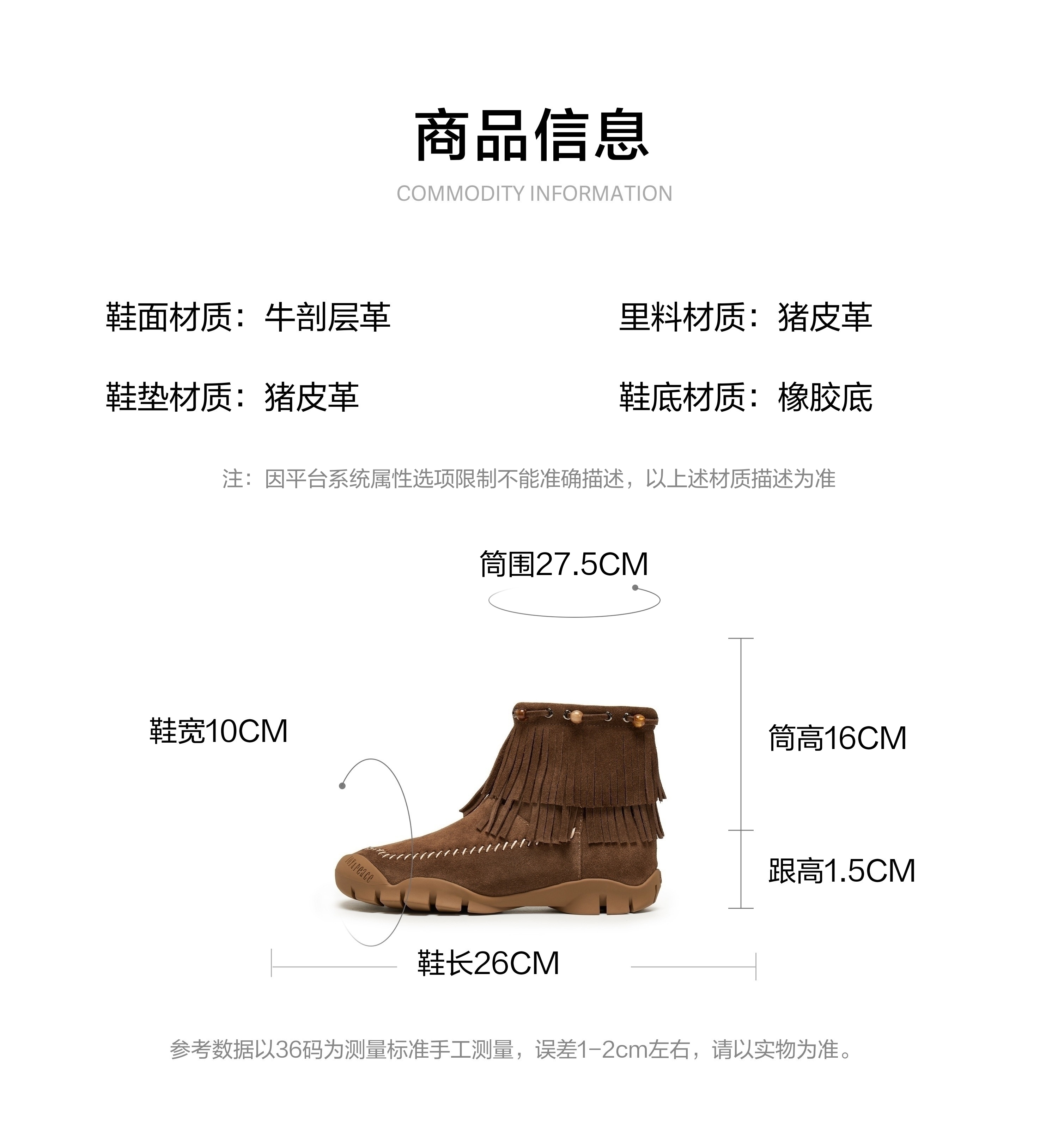 | 筒高数值:16CM | 性别:女子 | 靴筒筒面材质:牛剖层革 | 里料材质:猪皮革 | 制鞋工艺:车线胶粘 |