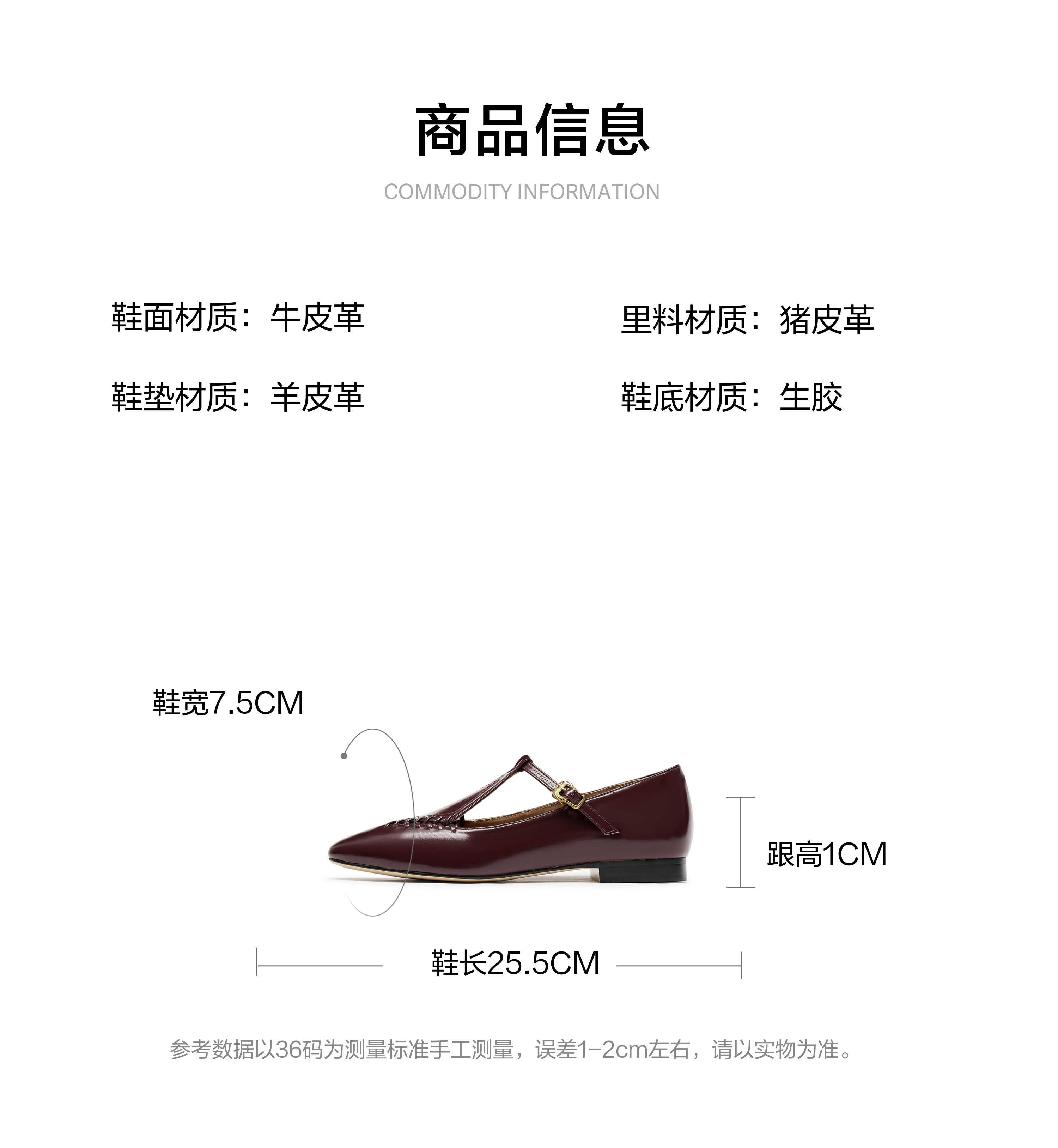 | 风格分类:玛丽珍鞋 | 上市时间:2025年春季 | 鞋类流行款式:玛丽珍鞋 | 鞋头款式:尖头 | 执行标准:皮鞋QB/T1002-2015 |
