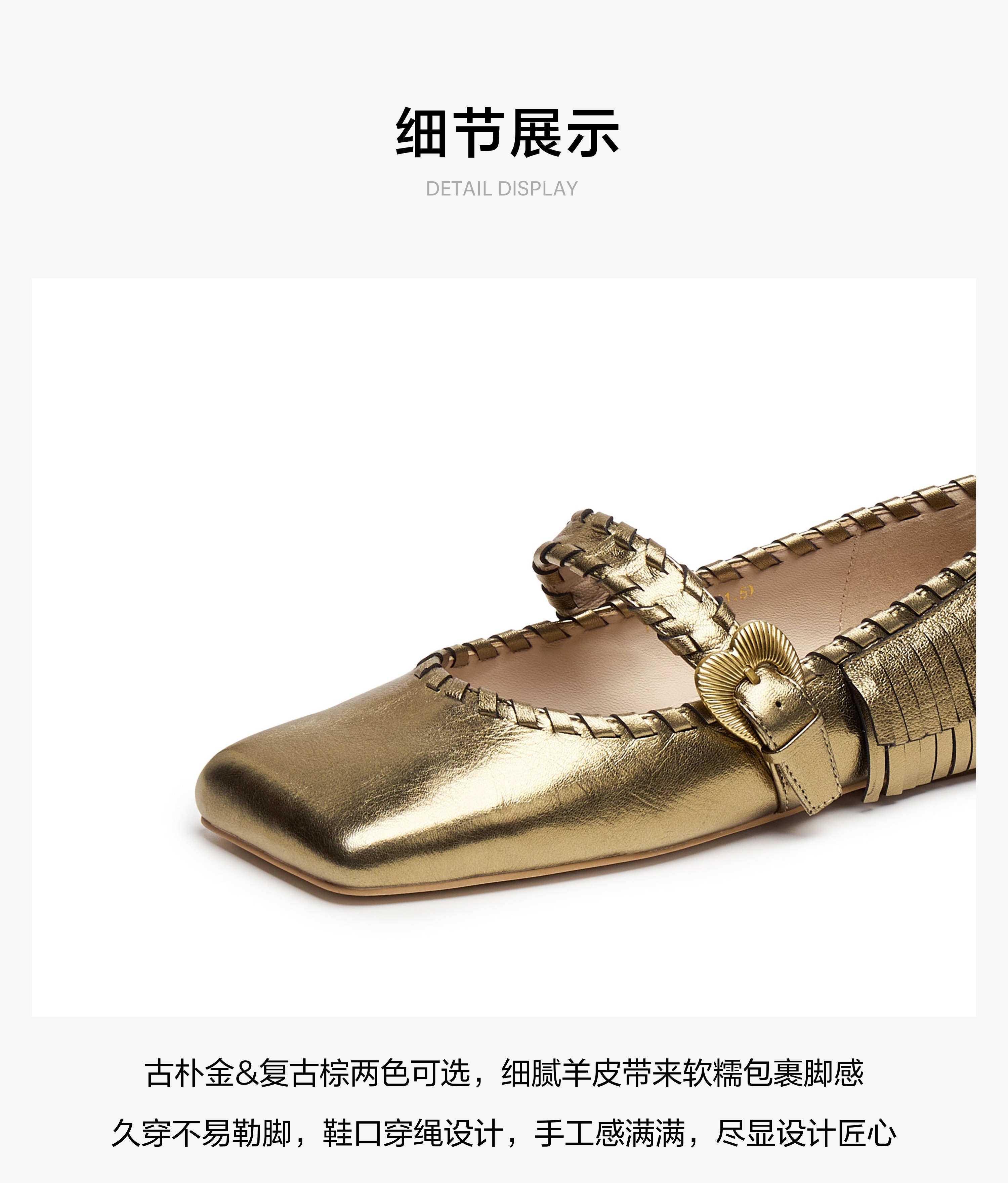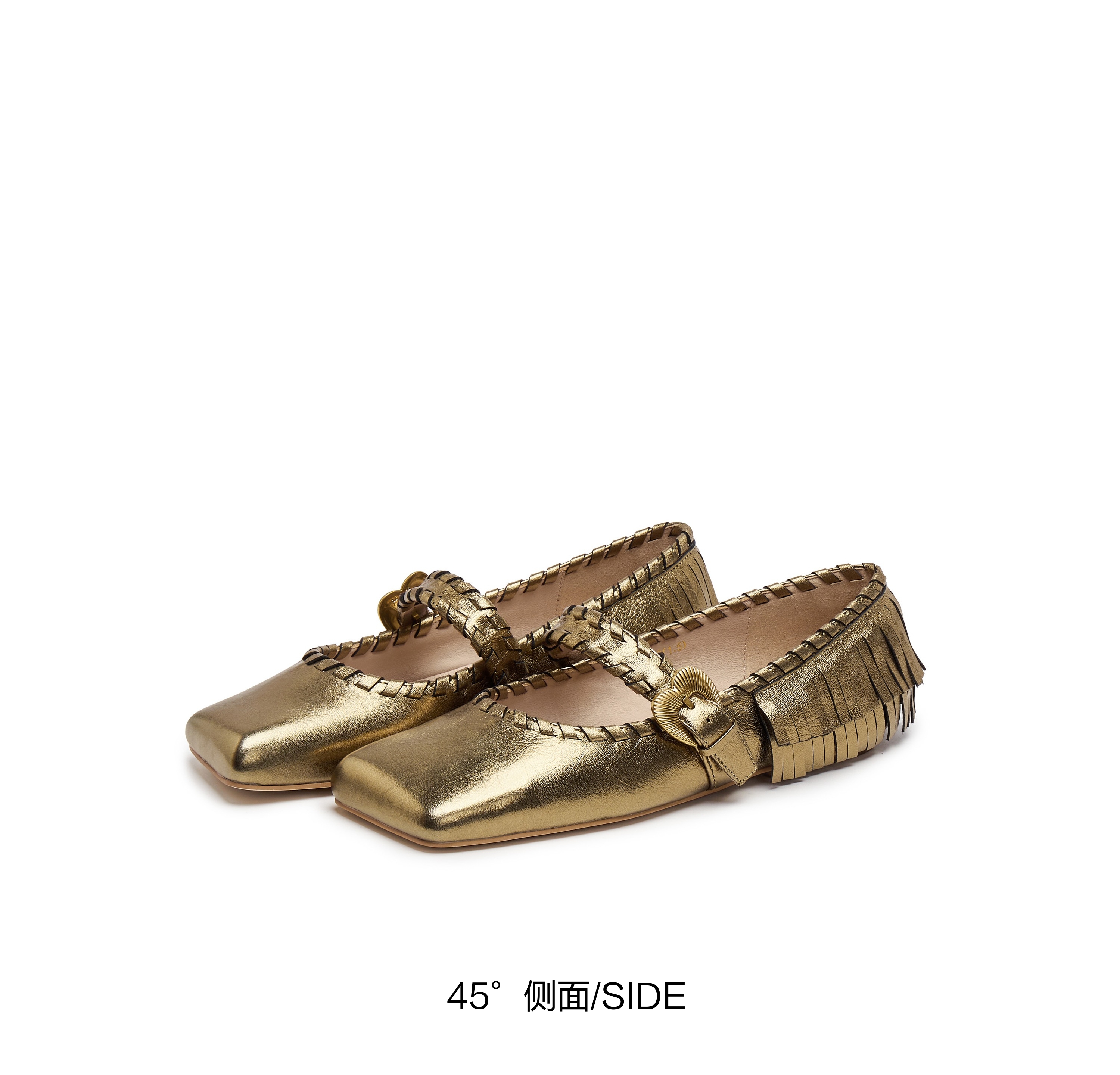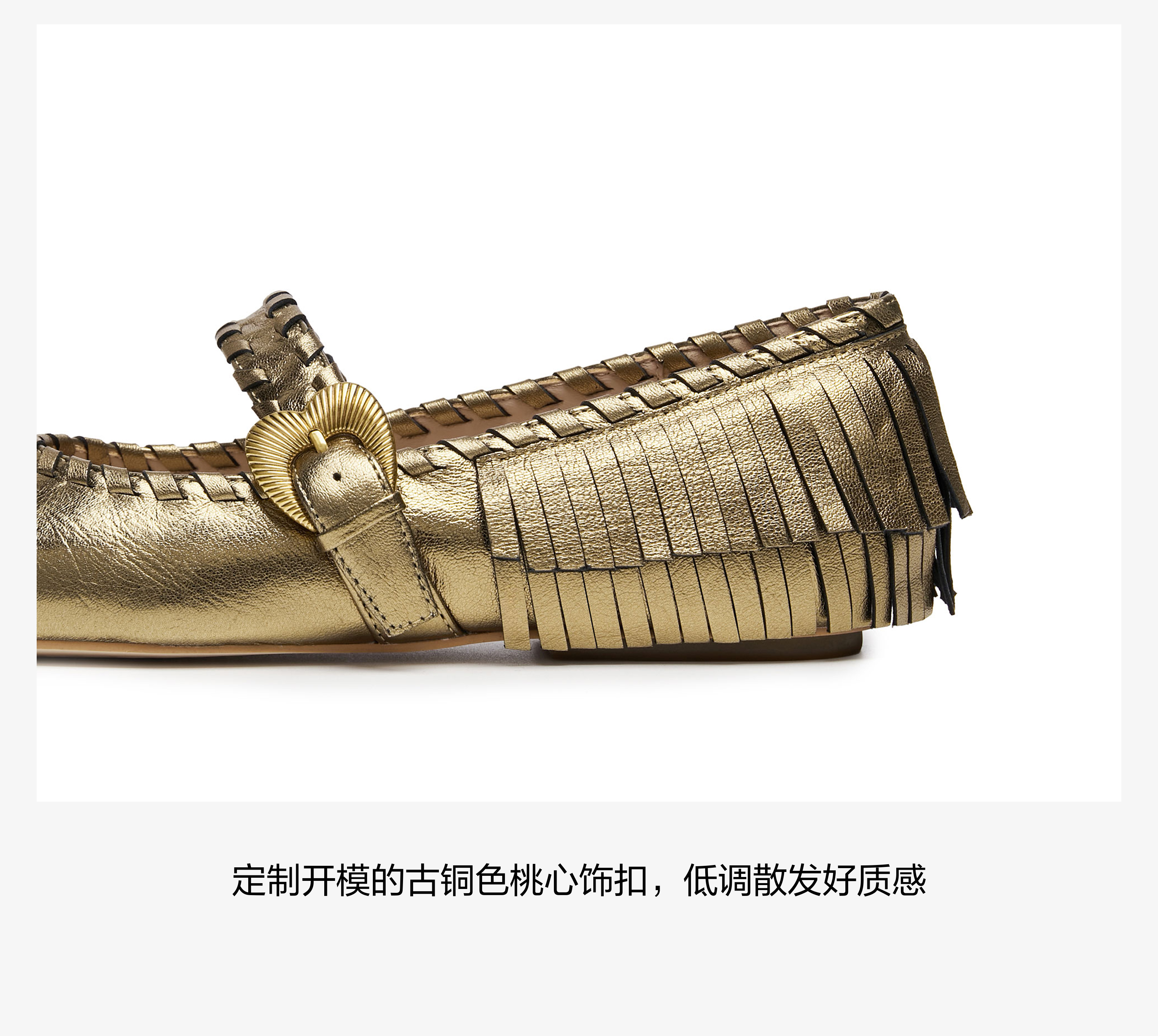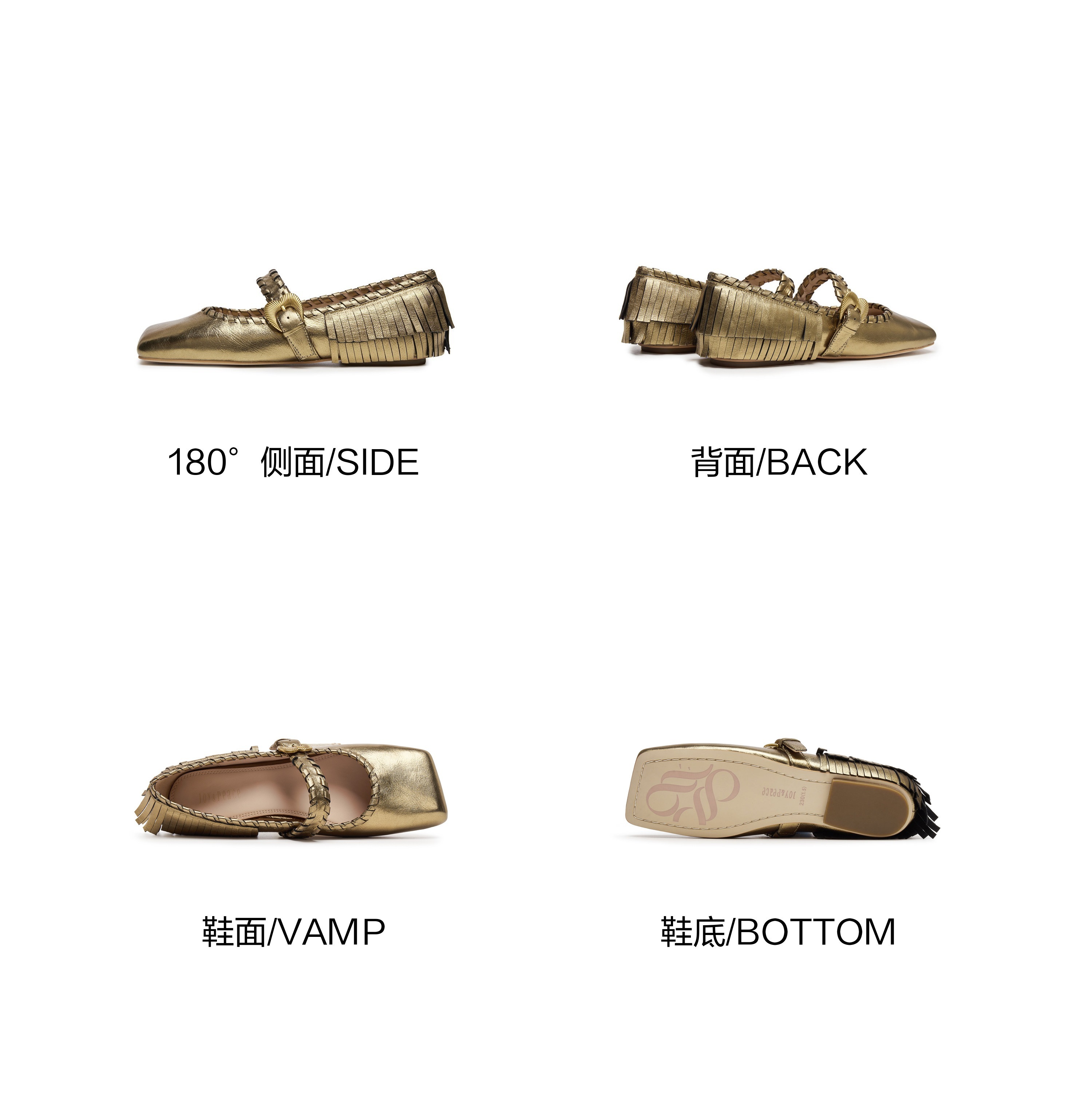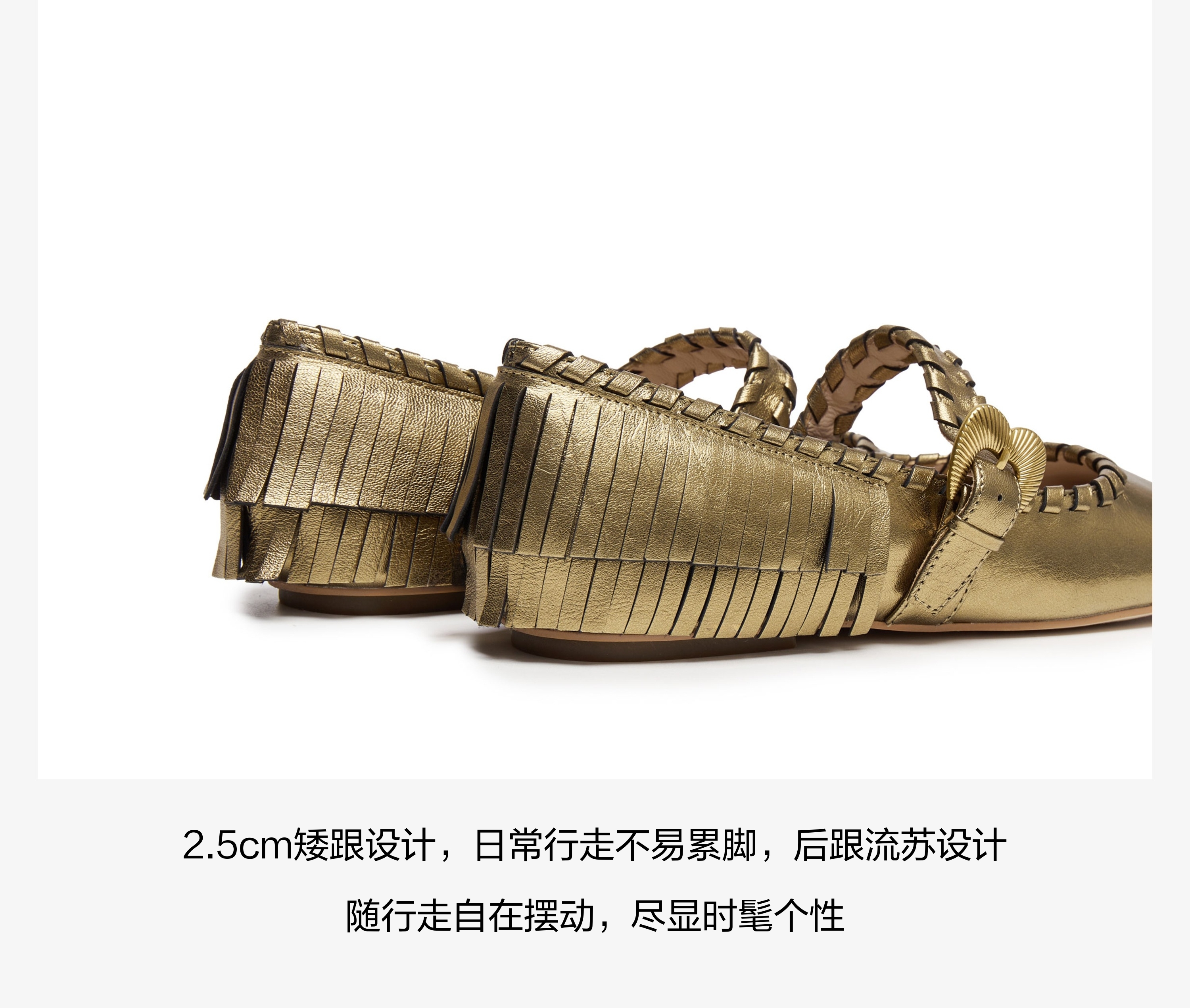 | 鞋面内里材质:羊皮革 | 色系:金色 | 跟高数值:2.5CM | 配跟:无 | 性别:女子 |