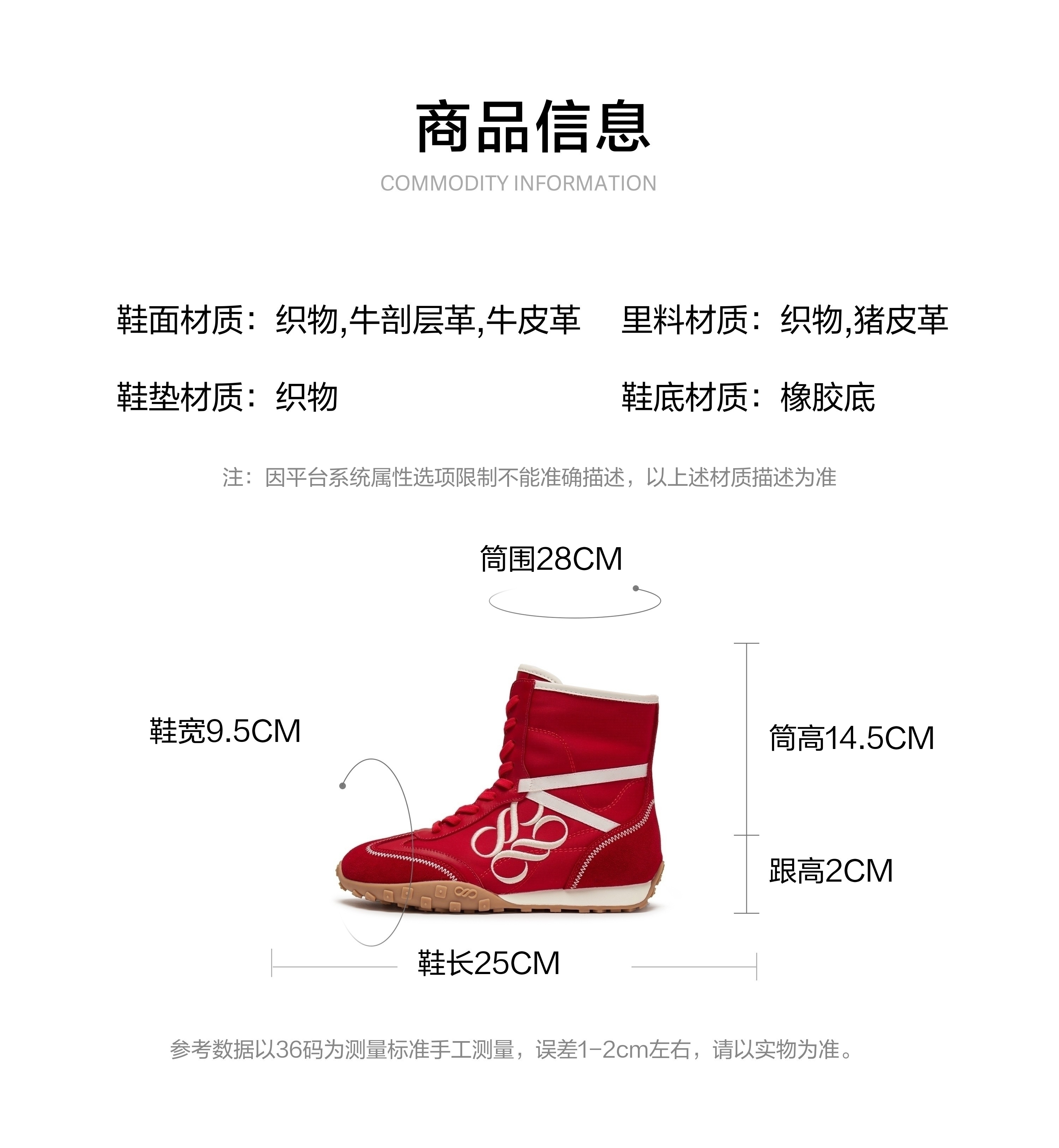 | 参考鞋宽(女):9.5CM | 风格:甜酷帅气 | 鞋面内里材质:织物猪皮革 | 色系:红色 | 跟高数值:2CM |