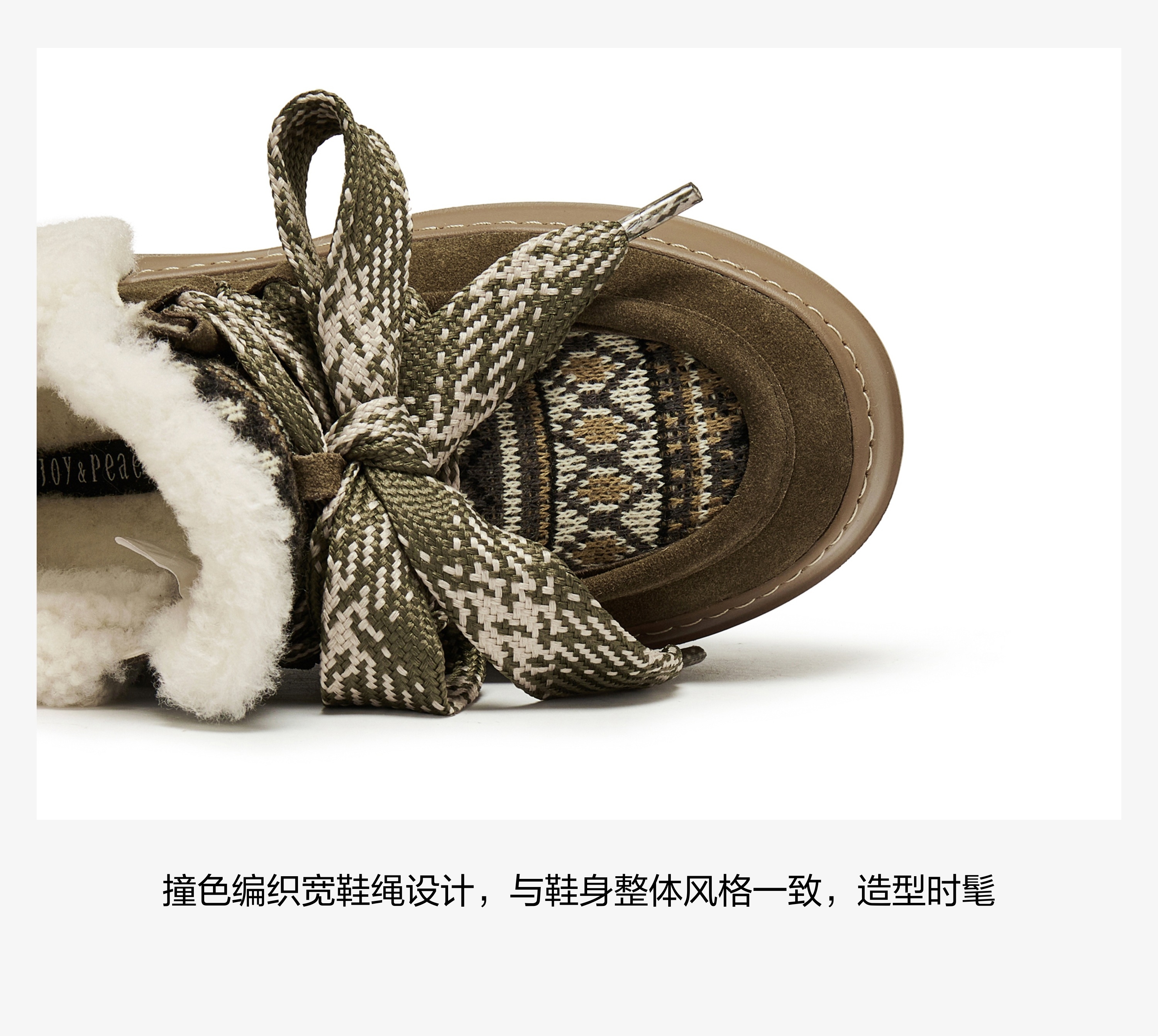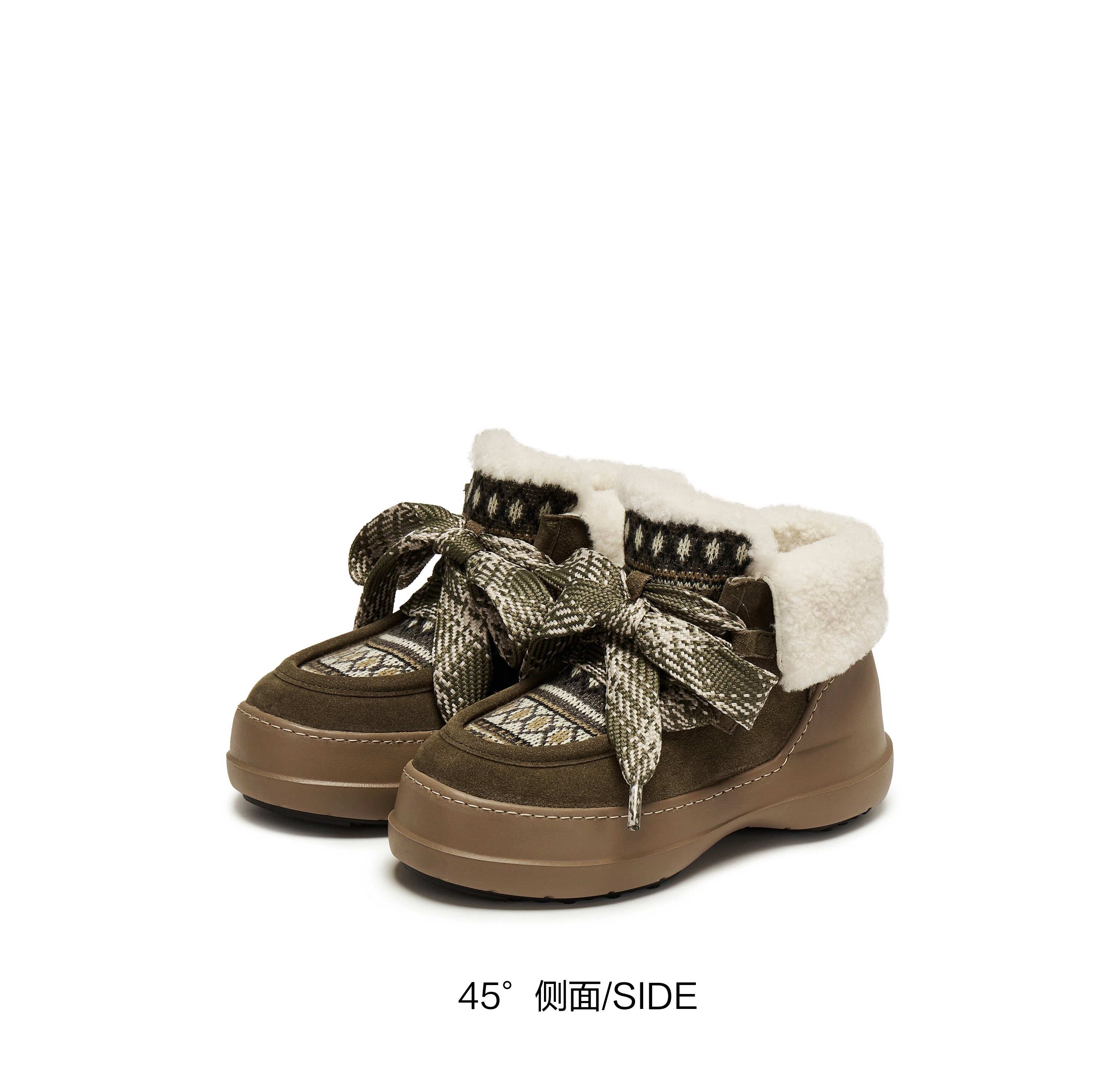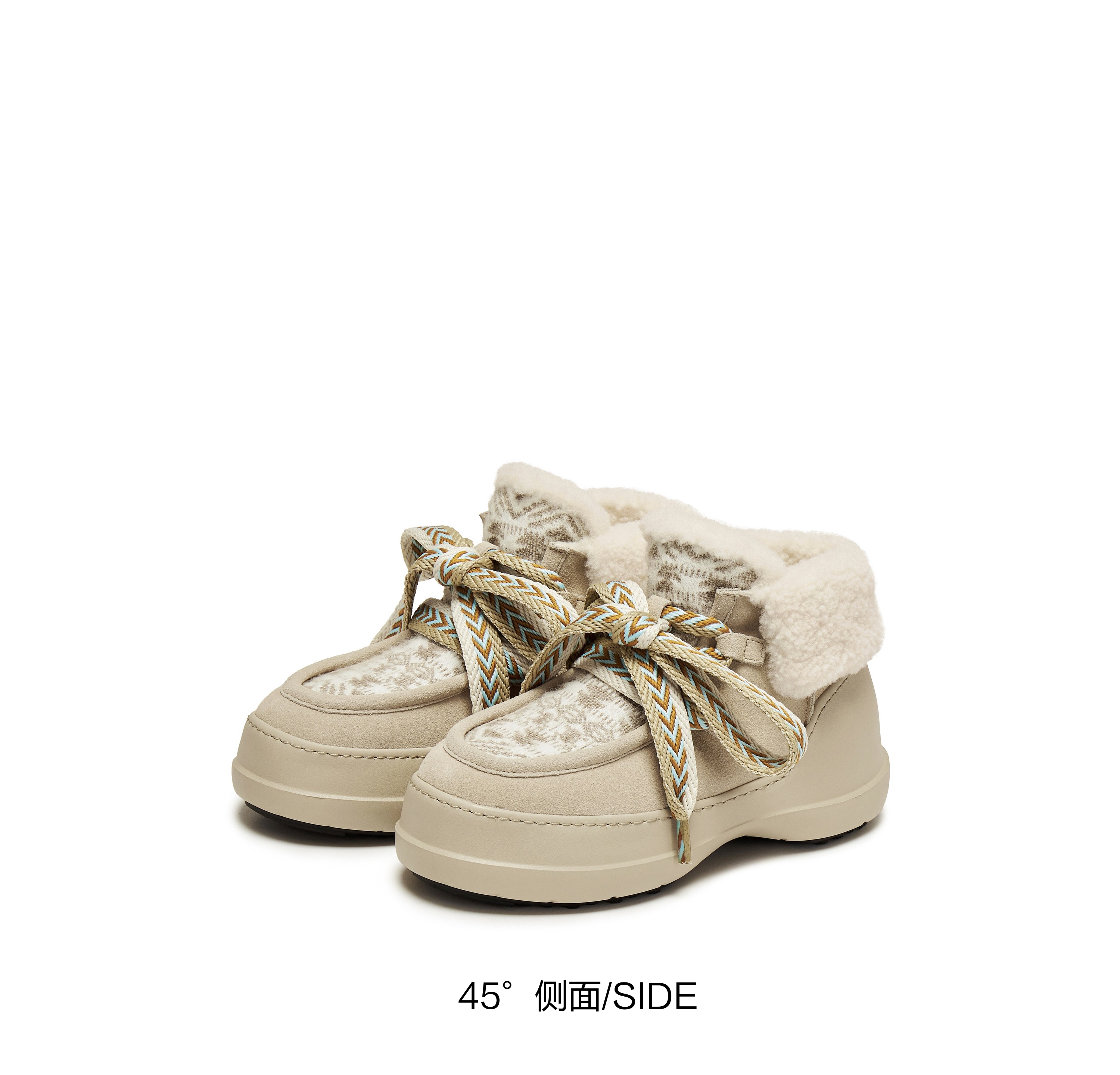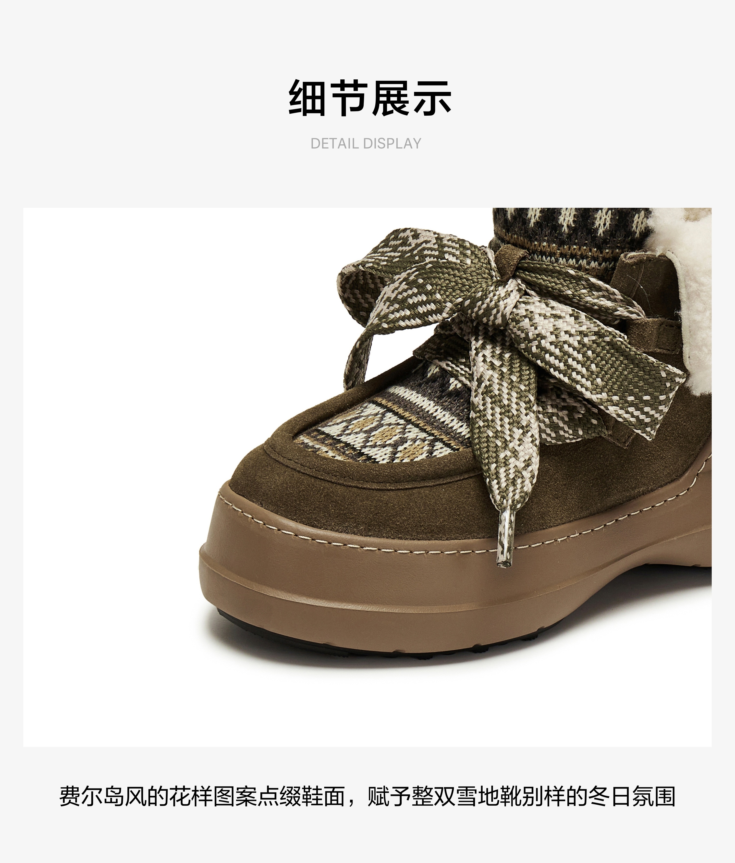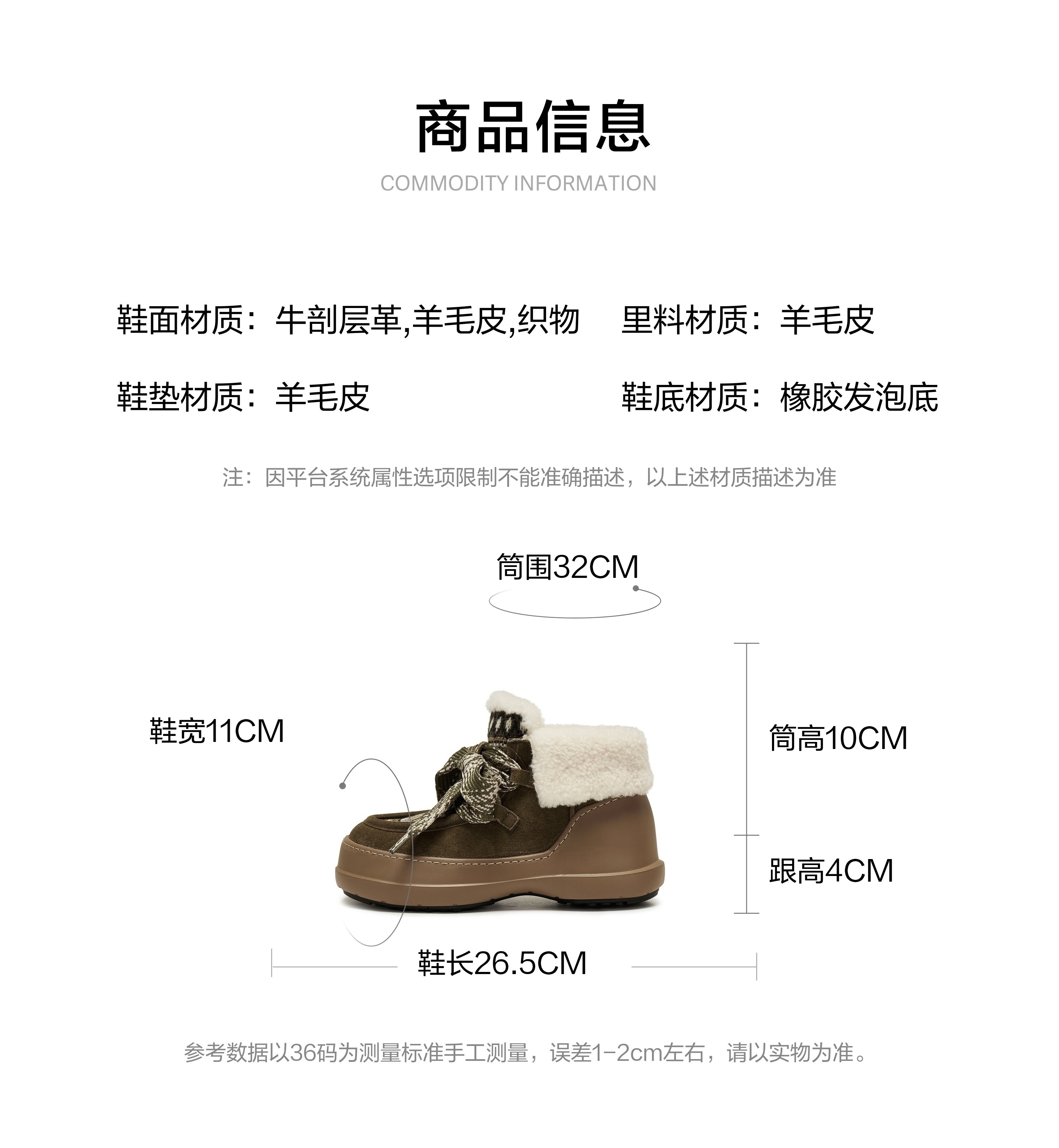 | 帮面材质:织物羊毛皮牛剖层革 | 配跟:无 | 靴筒口围:32CM | 上市时间:2025年冬季 | 鞋类流行款式:雪地靴 |