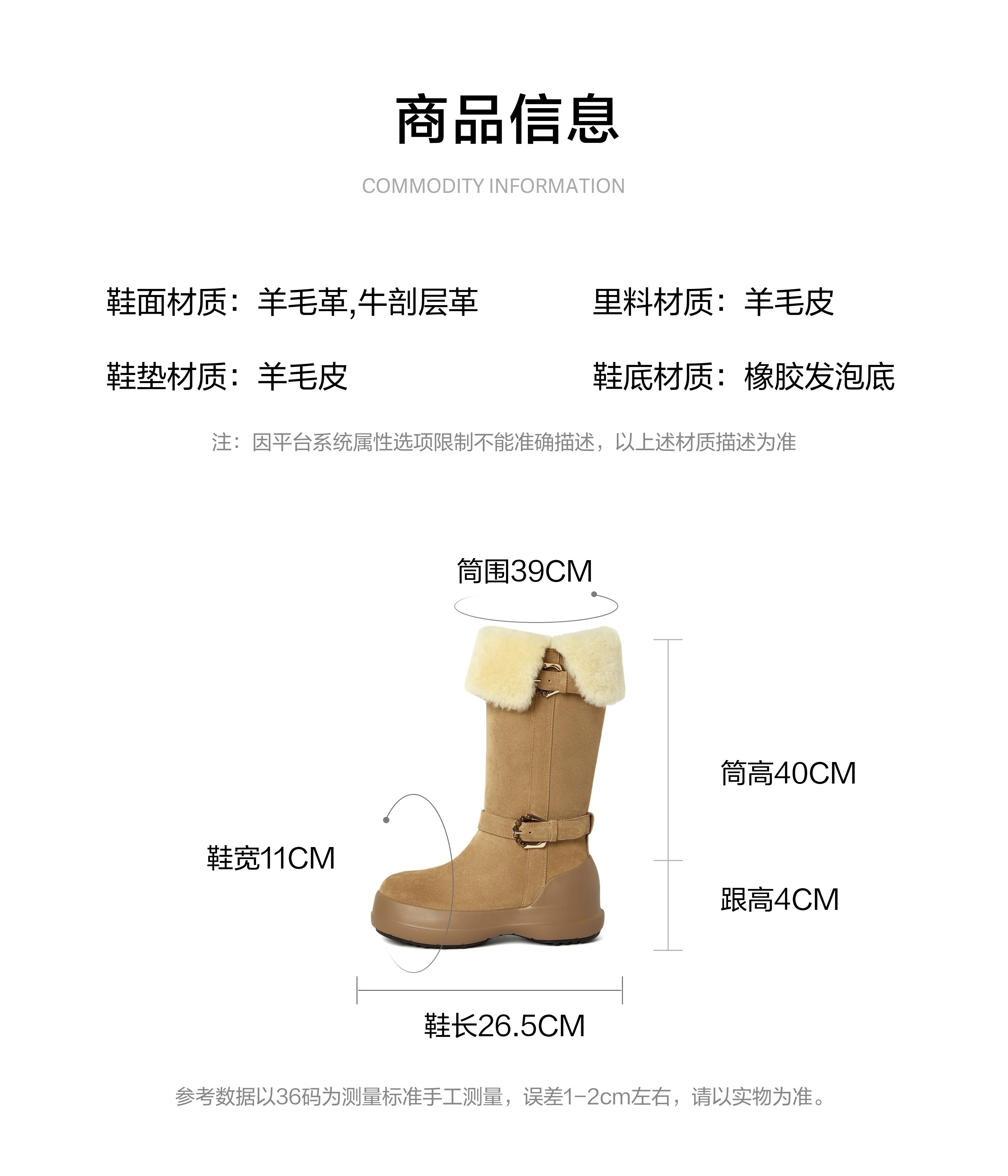 | 筒高数值:40CM | 靴筒筒面材质:羊毛革牛剖层革 | 靴筒小腿围:33CM | 里料材质:羊毛皮 | 制鞋工艺:车线胶粘 |