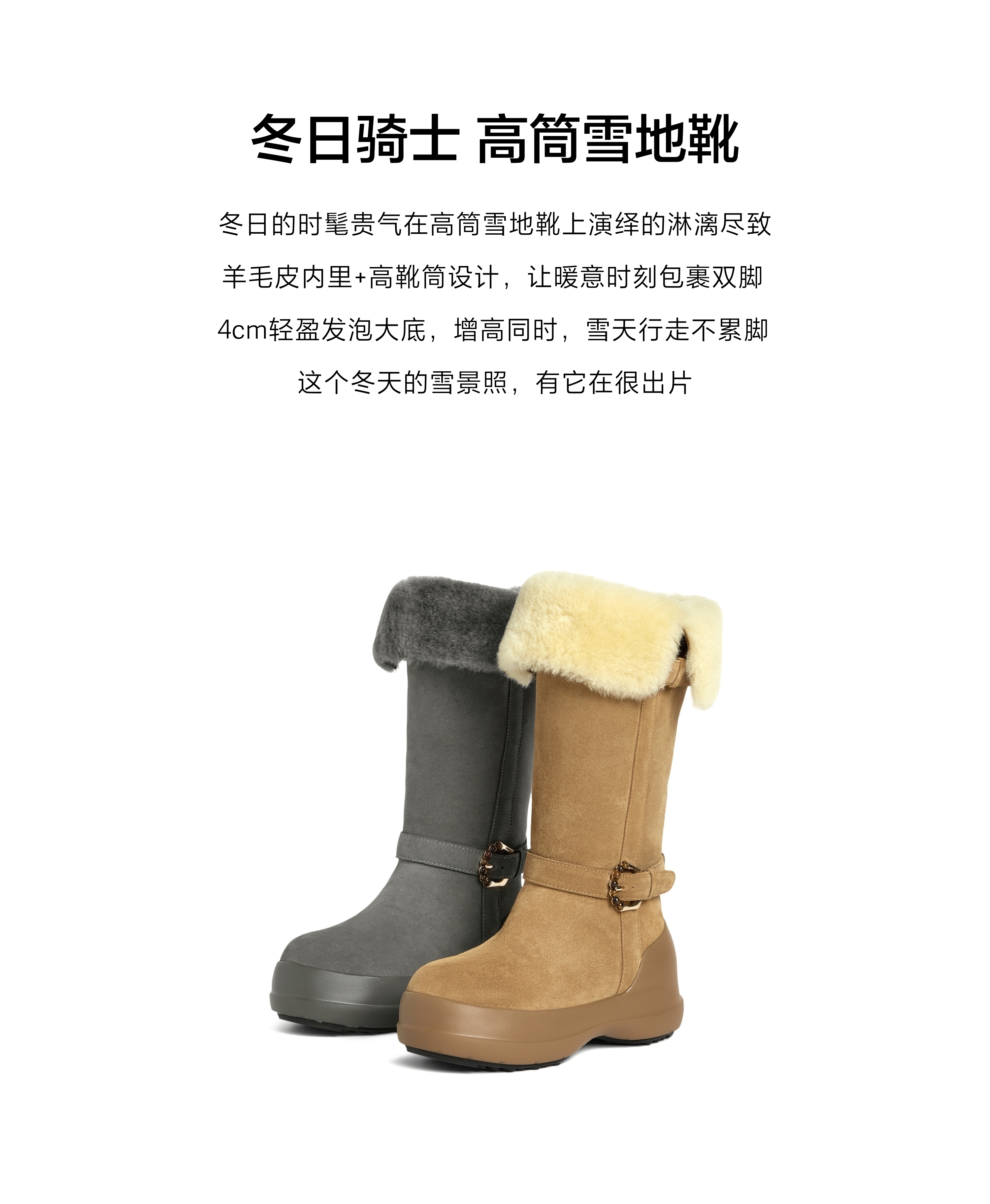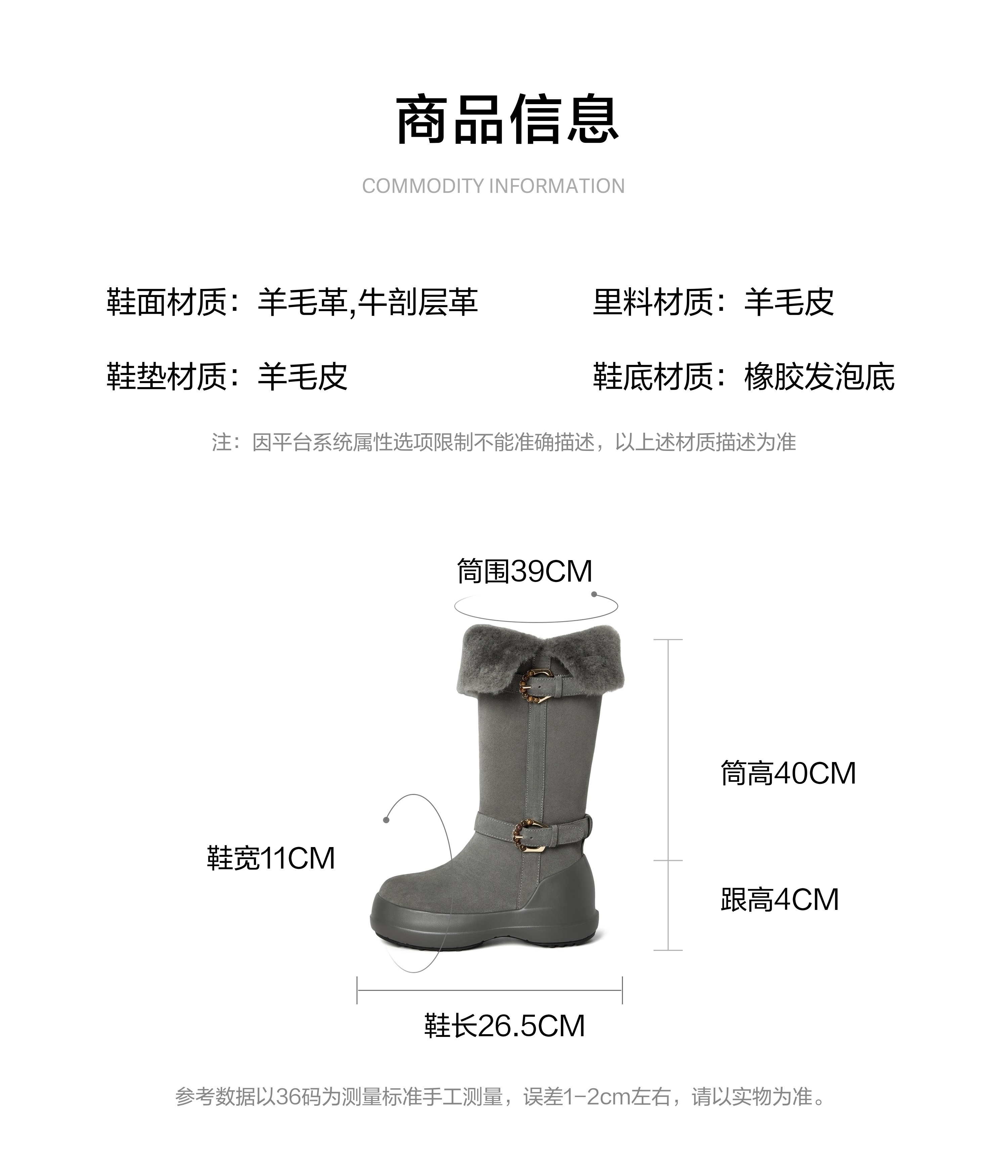 | 筒高数值:40CM | 靴筒筒面材质:羊毛革牛剖层革 | 靴筒小腿围:33CM | 里料材质:羊毛皮 | 制鞋工艺:车线胶粘 |