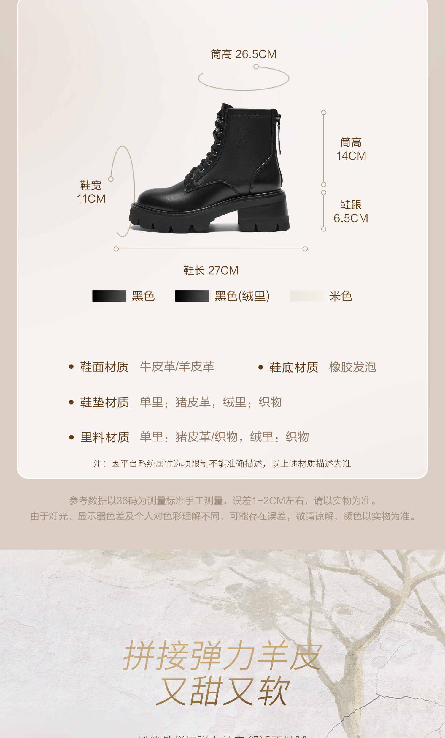 | 帮面材质:牛皮革羊皮 | 配跟:无 | 靴筒口围:26.5CM | 上市时间:2025年冬季 | 鞋类流行款式:马丁靴 |