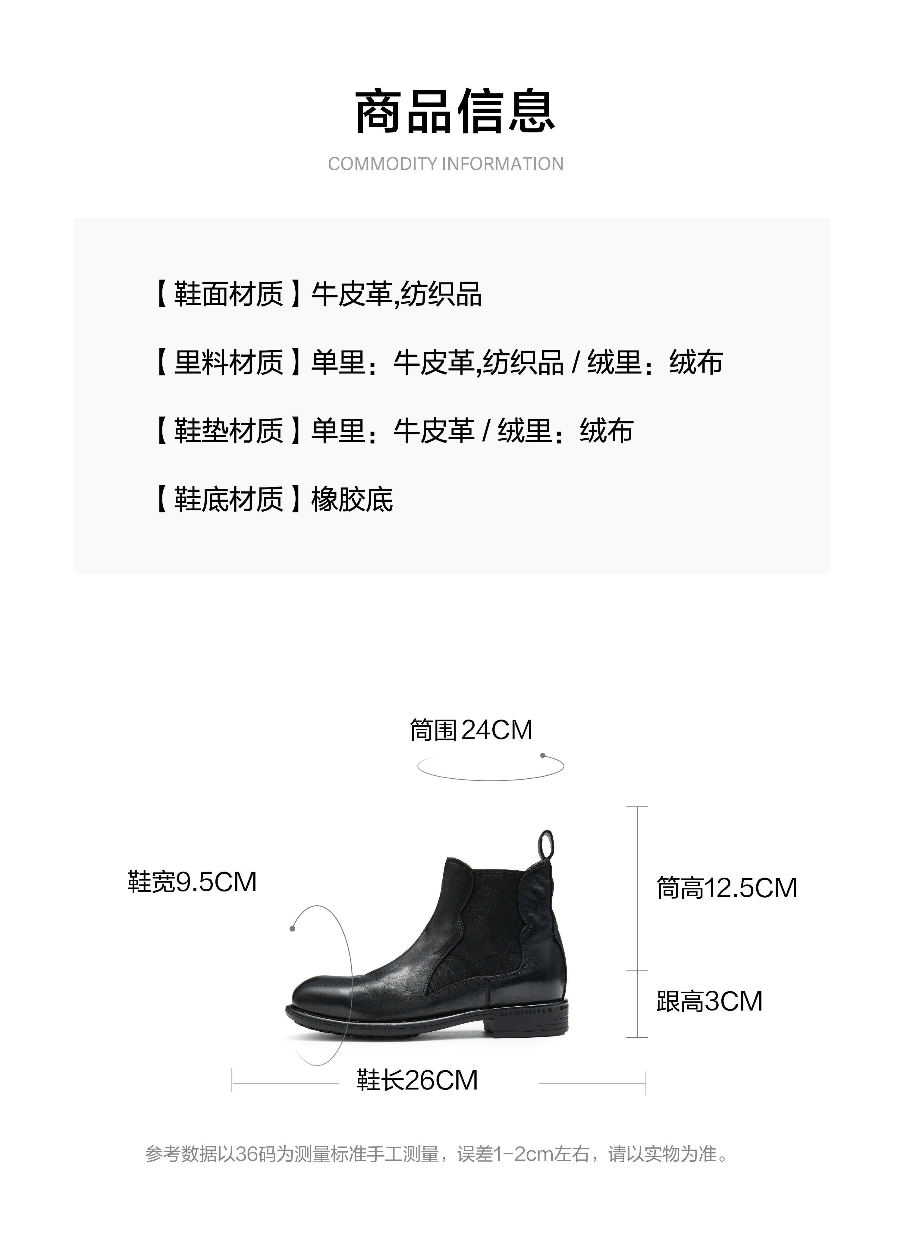 | 帮面材质:织物牛皮革 | 配跟:无 | 靴筒口围:24CM | 上市时间:2025年冬季 | 鞋类流行款式:切尔西靴 |
