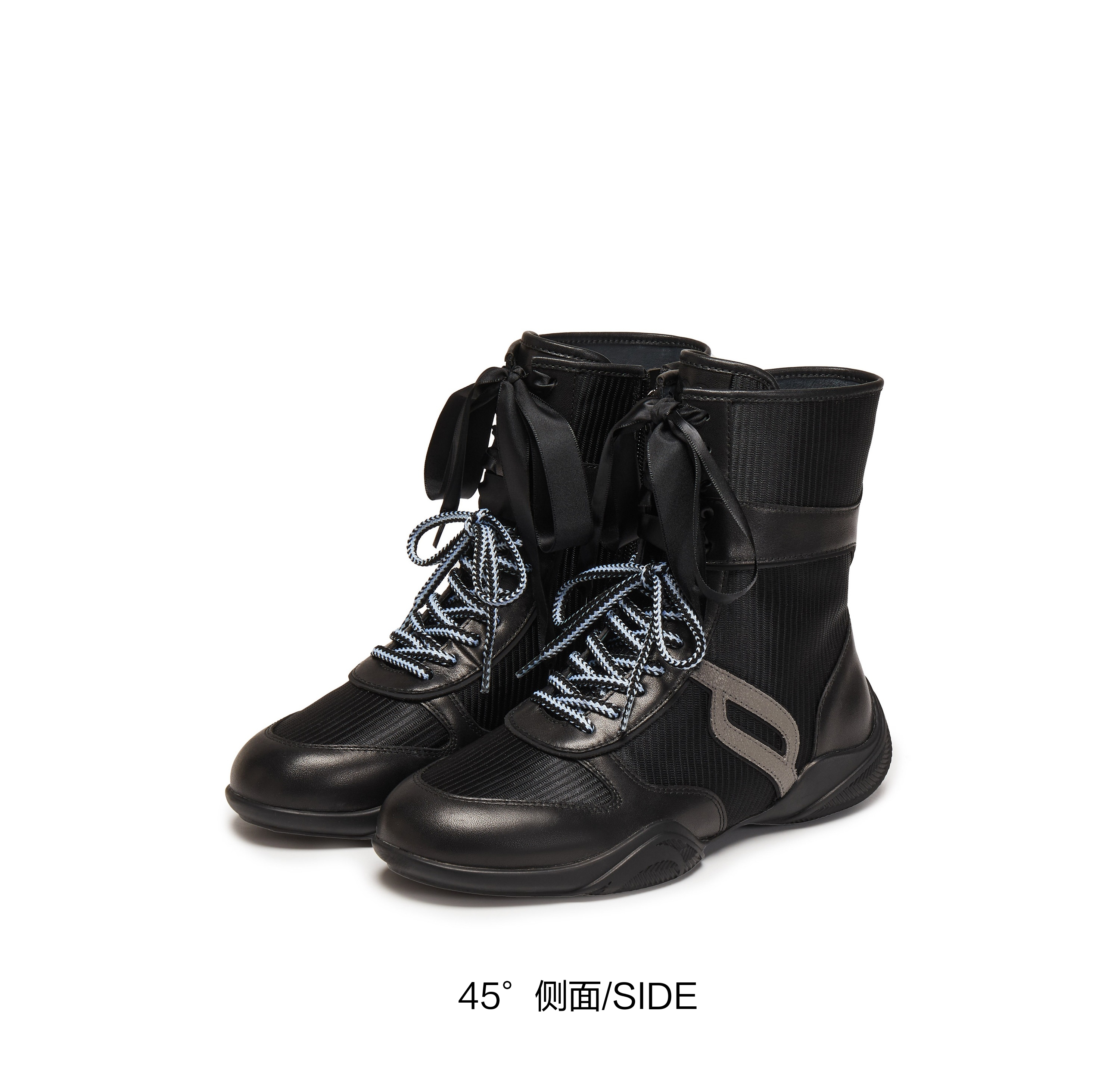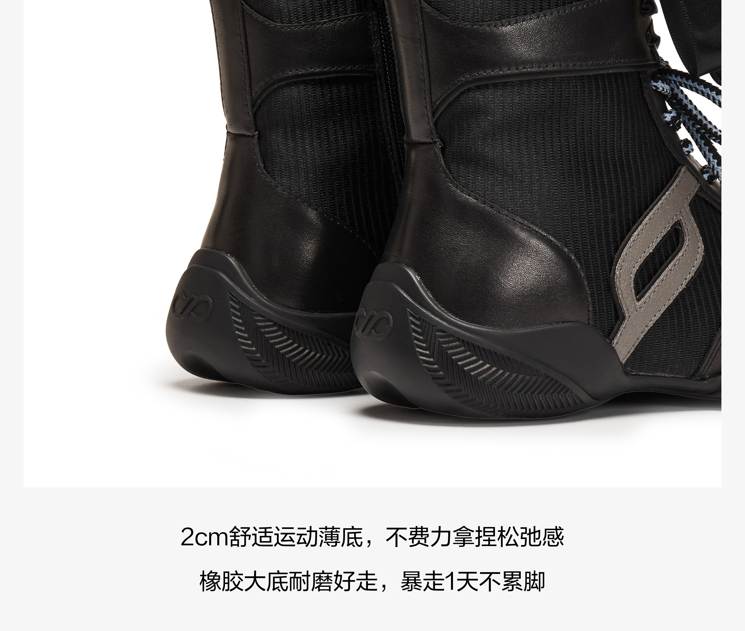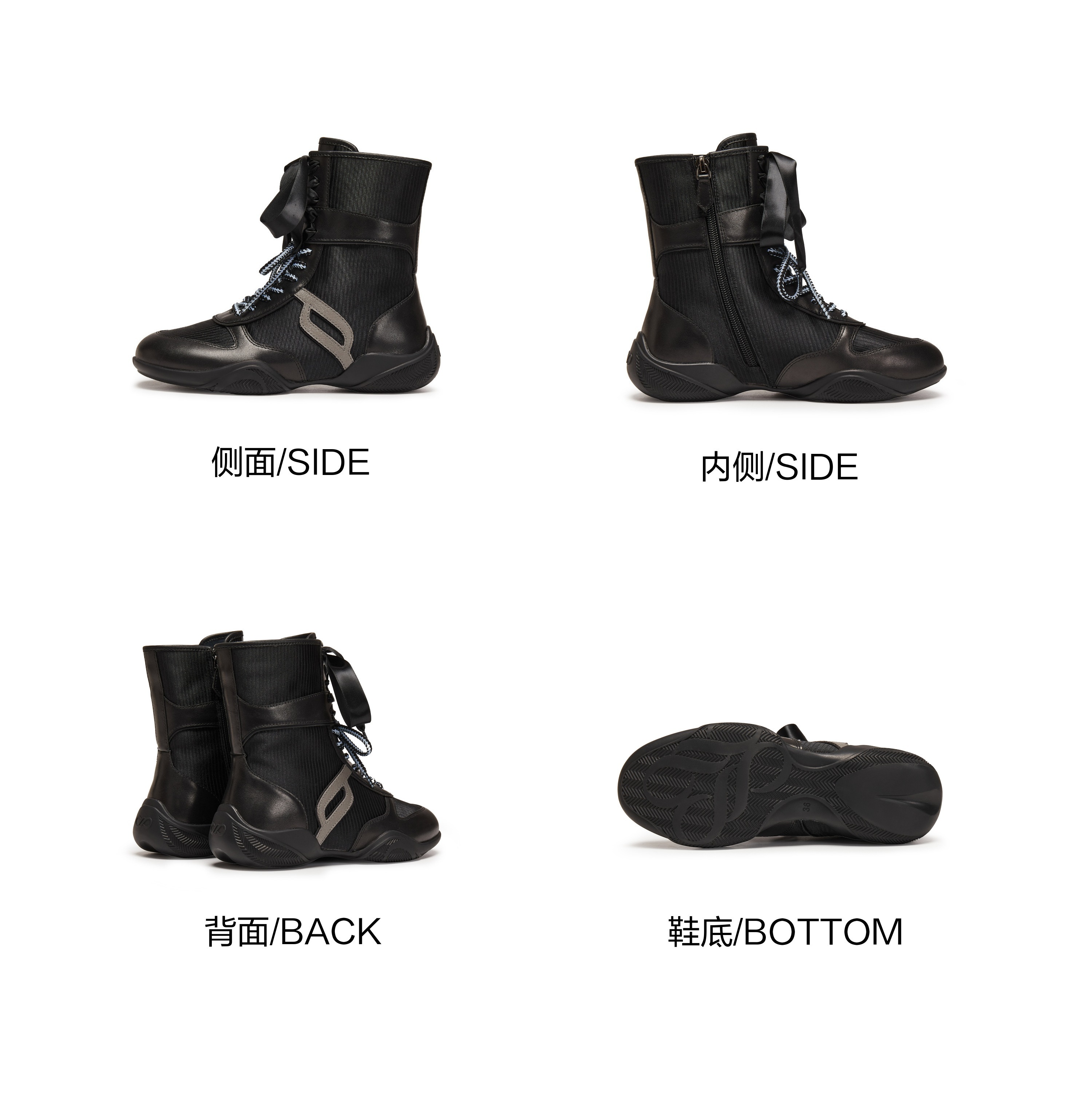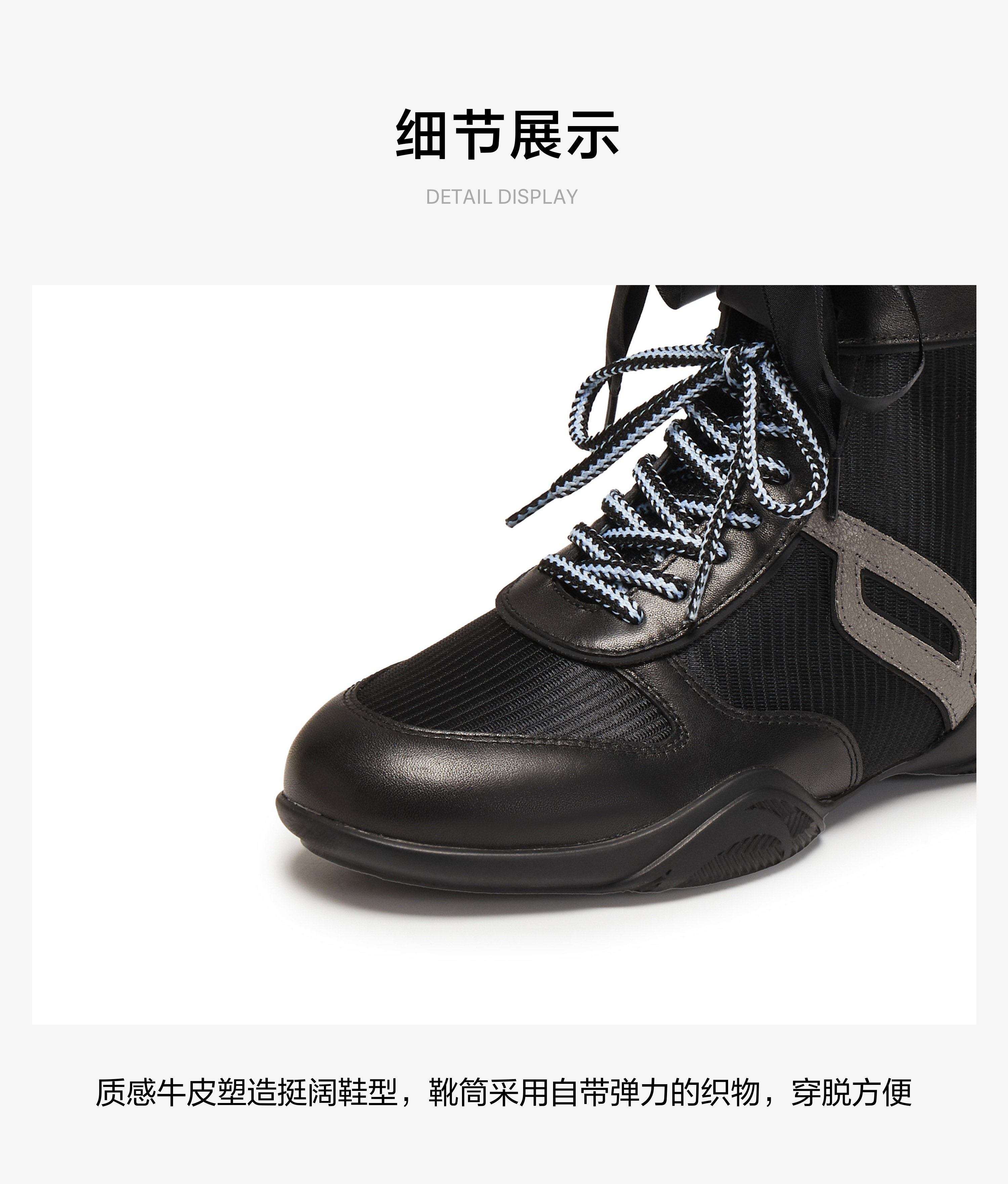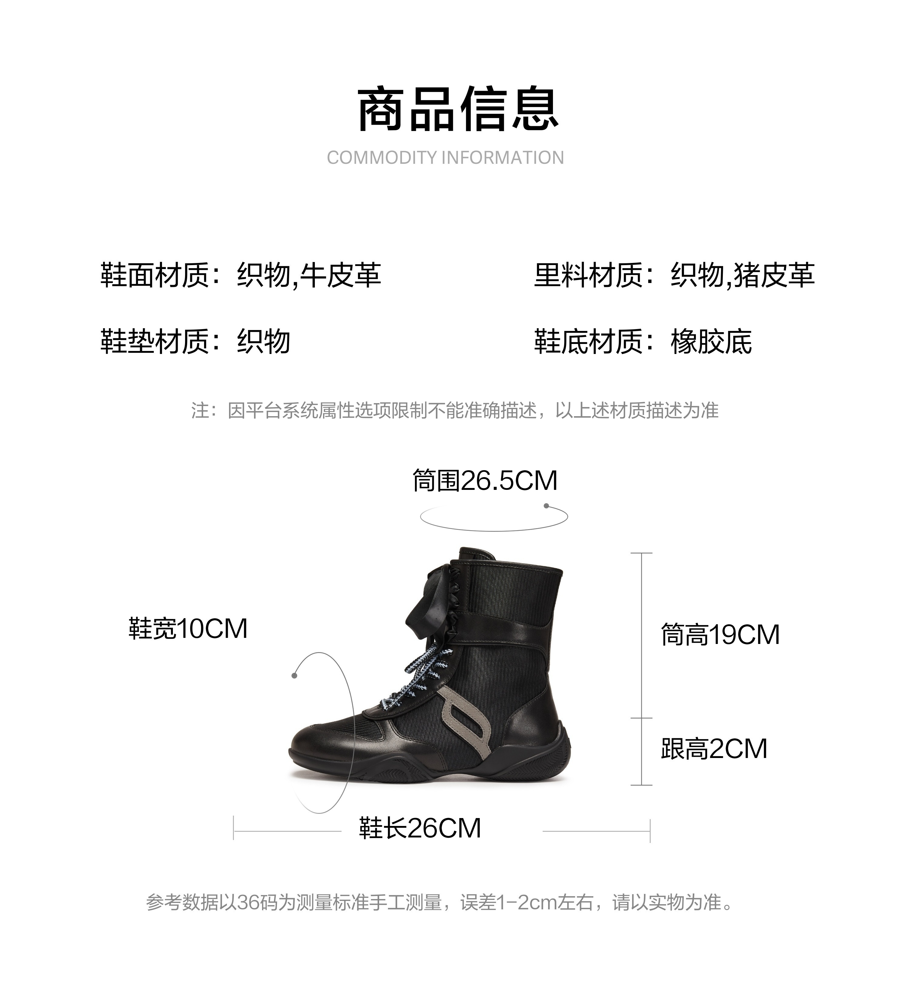 | 风格:时尚潮流帅气 | 鞋面内里材质:猪皮革织物 | 色系:黑色 | 跟高数值:2CM | 筒高数值:19CM |