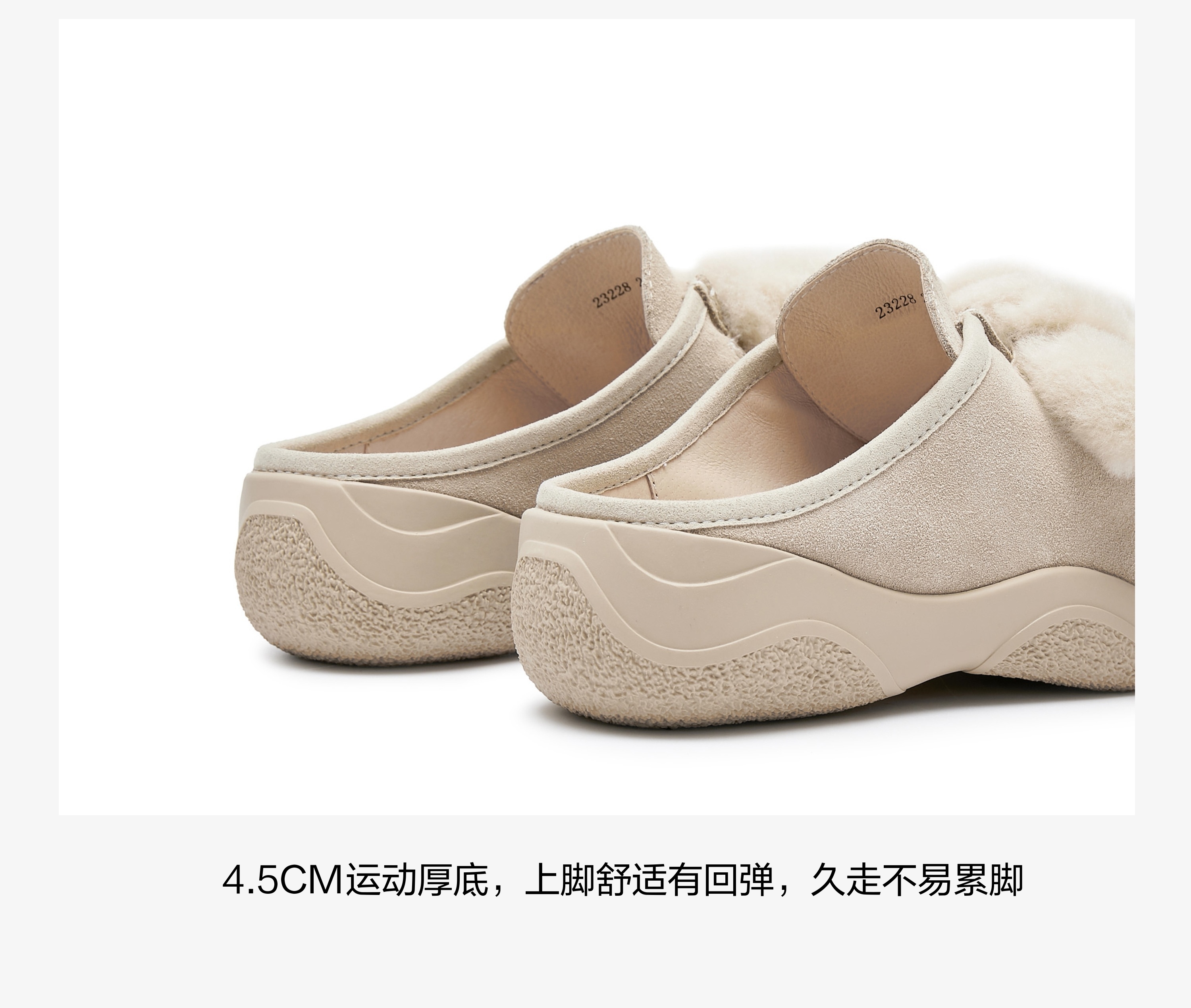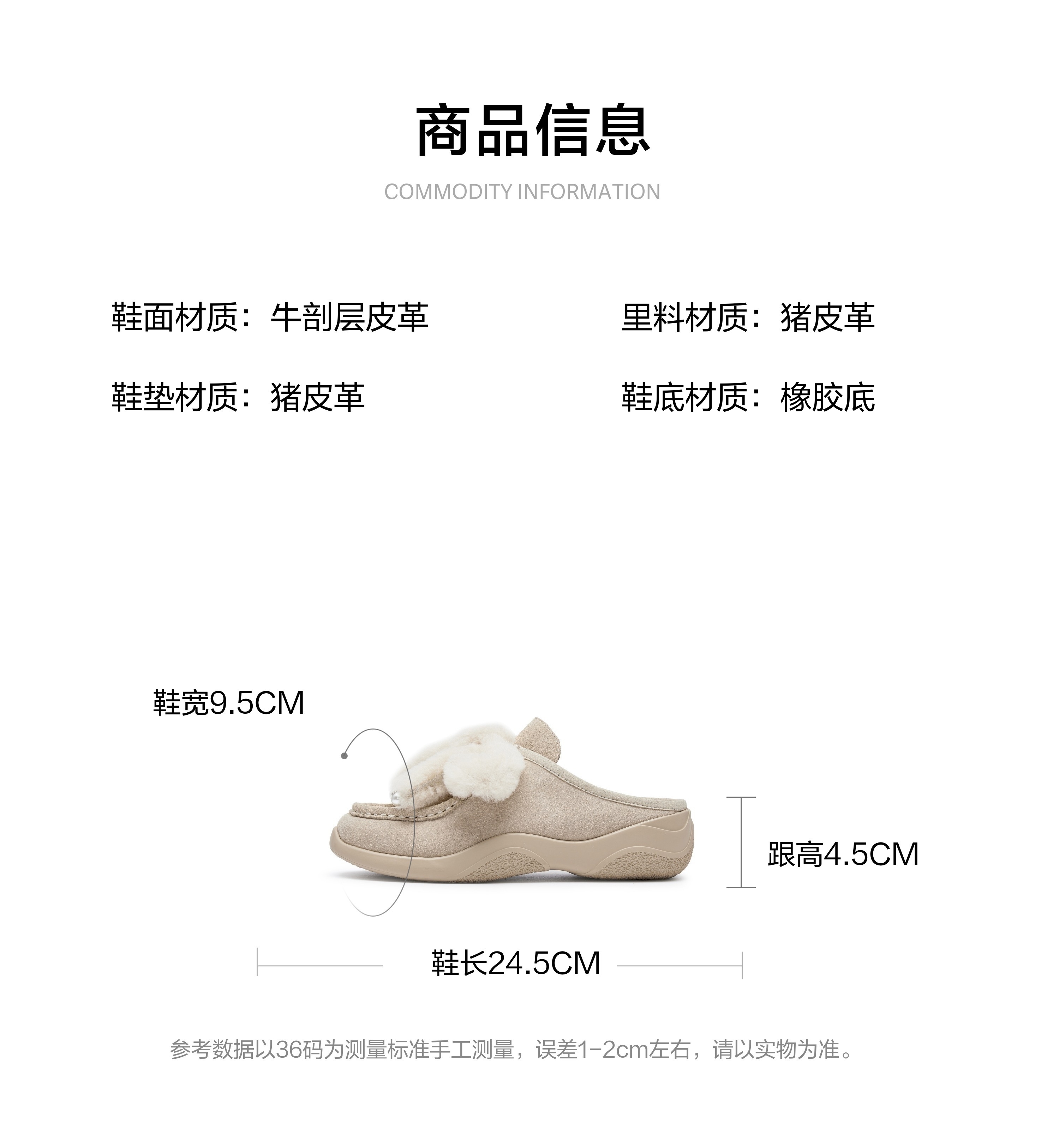 | 参考标准尺码:36码 | 跟高数值:4.5CM | 性别:女子 | 里料材质:猪皮革 | 制鞋工艺:车线胶粘 |