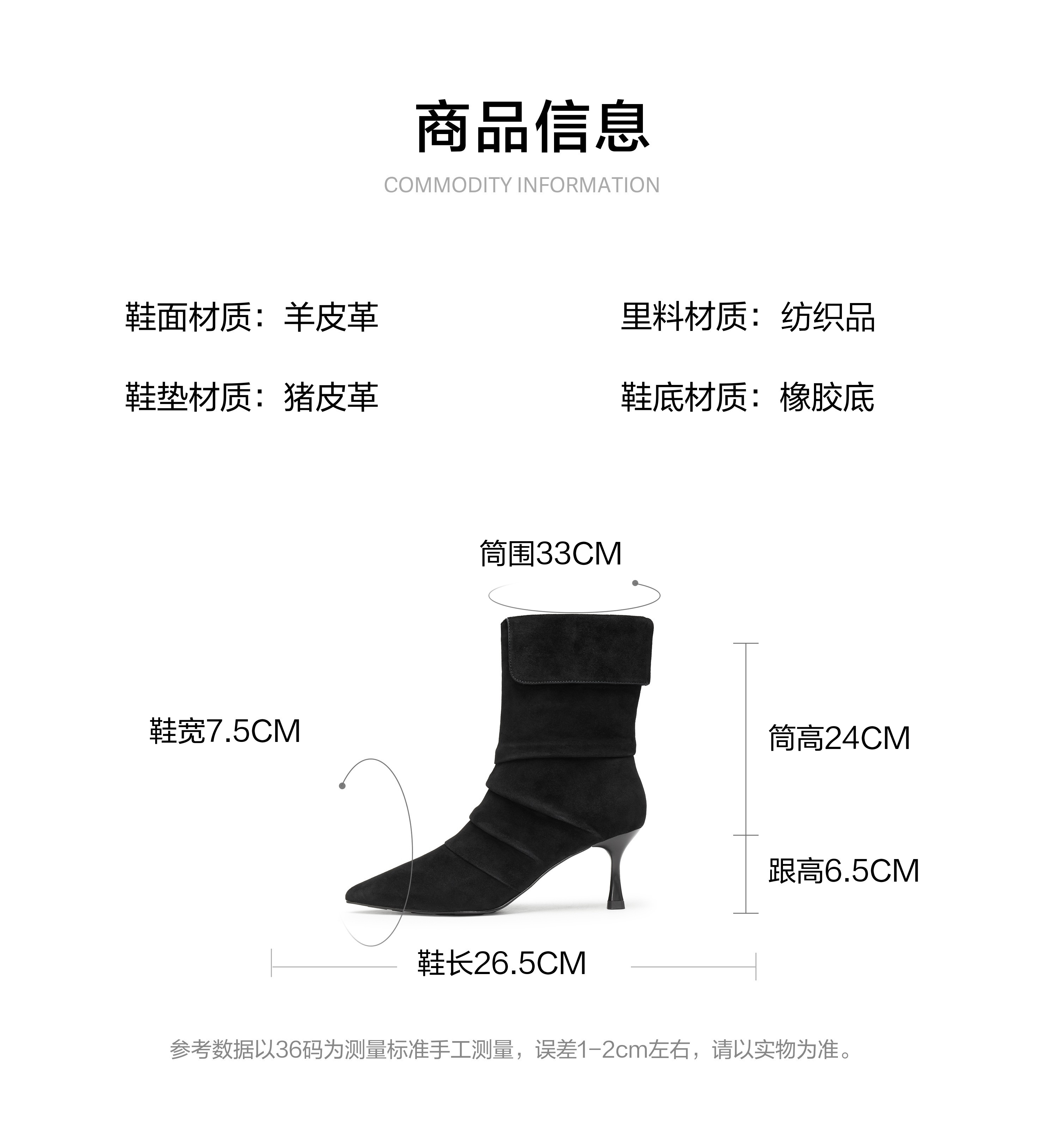| 靴筒筒面材质:羊皮革 | 靴筒小腿围:29.5CM | 里料材质:织物面料 | 制鞋工艺:车线胶粘 | 鞋垫材质:猪皮革 |