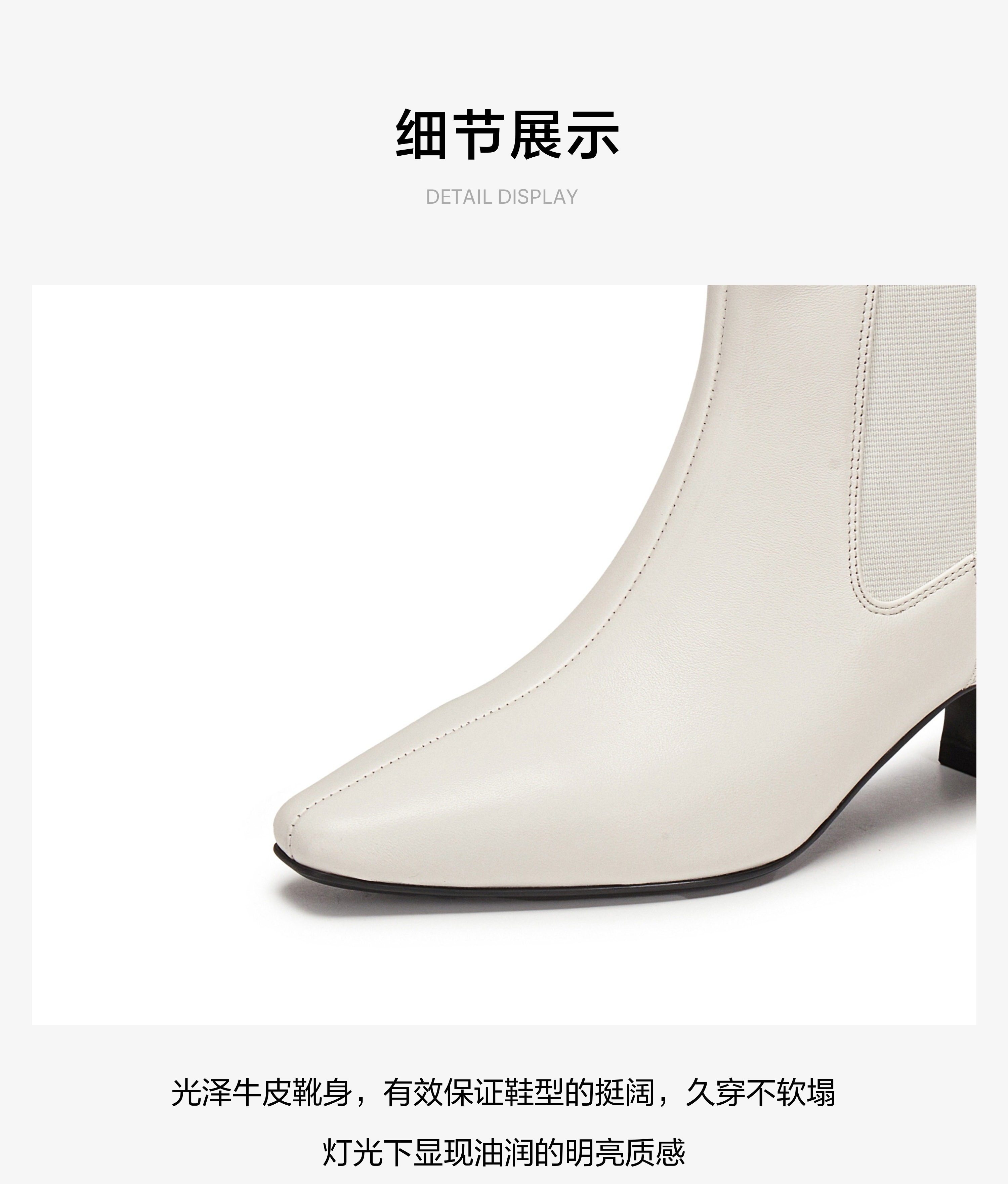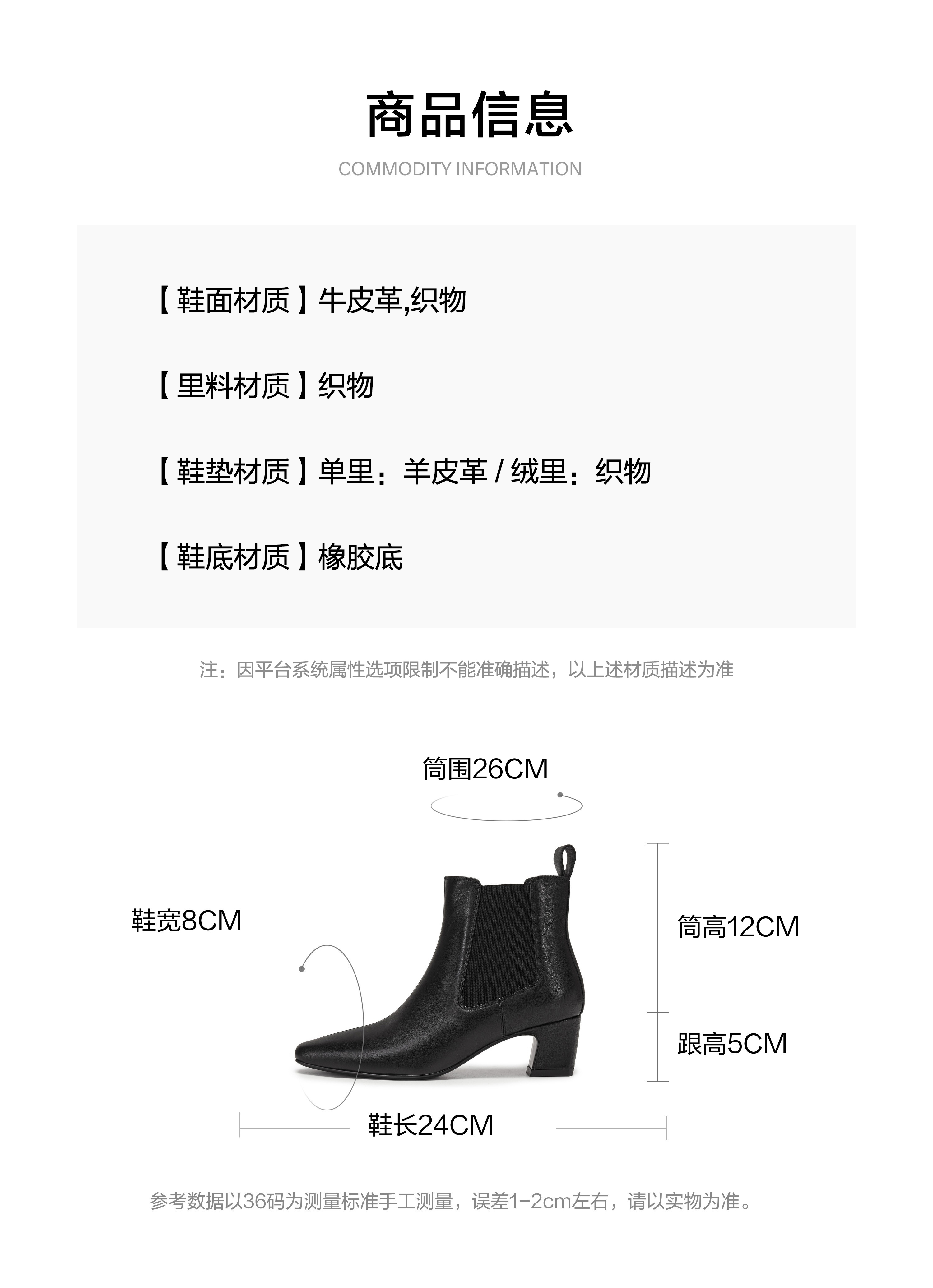 | 帮面材质:织物牛皮革 | 配跟:无 | 靴筒口围:26CM | 上市时间:2025年冬季 | 鞋类流行款式:切尔西靴 |