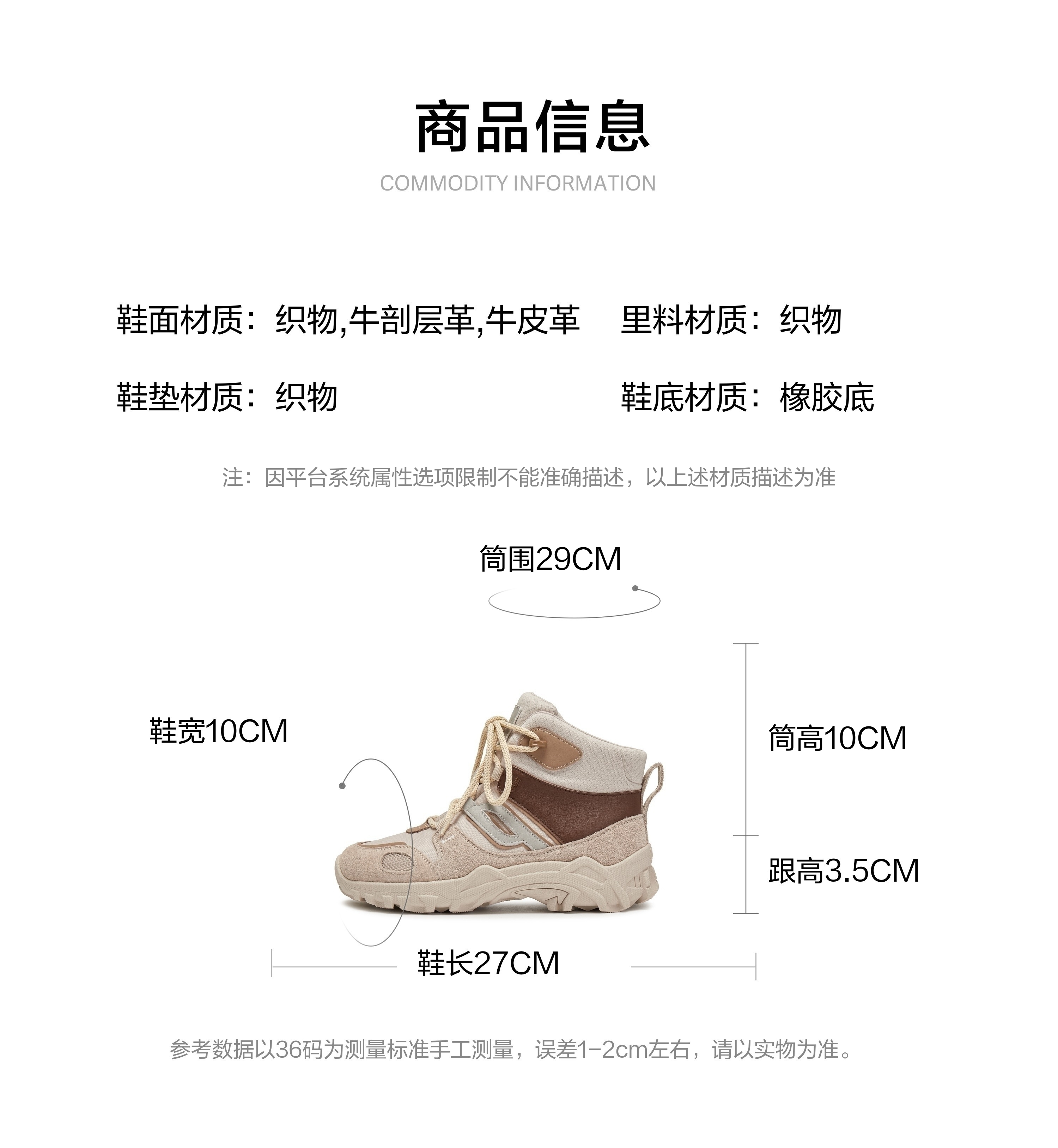 | 参考鞋宽(女):10CM | 风格:工装 | 鞋面内里材质:织物 | 色系:米色 | 跟高数值:3.5CM |
