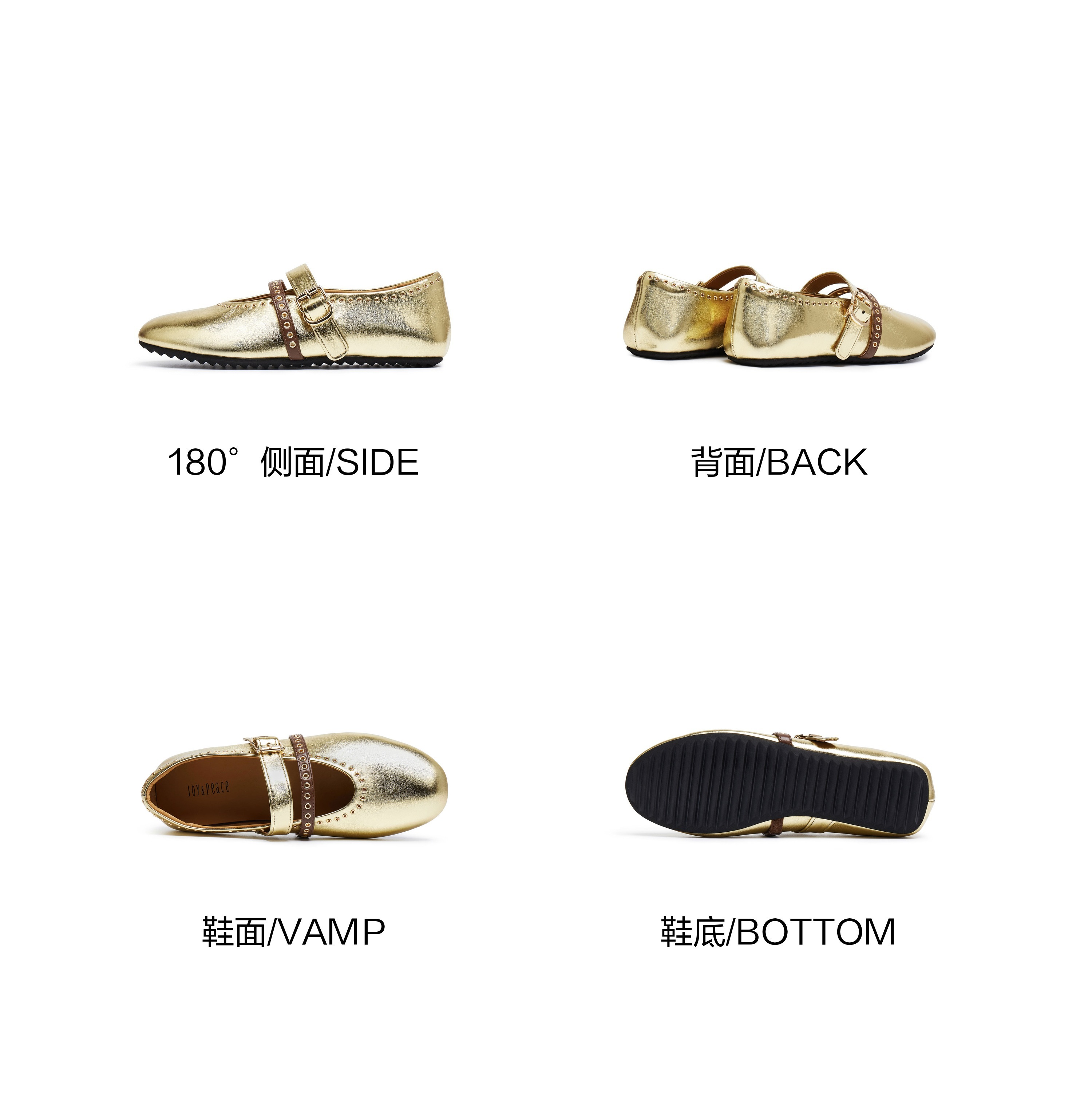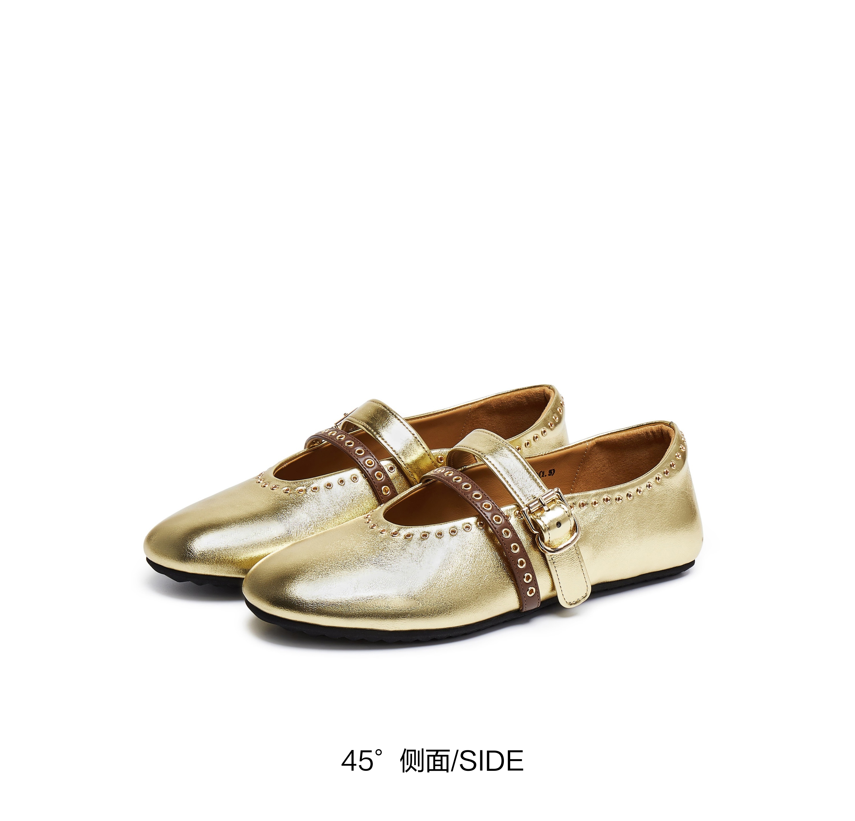 | 鞋面内里材质:超纤羊皮革 | 色系:金色 | 跟高数值:1CM | 配跟:无 | 性别:女子 |