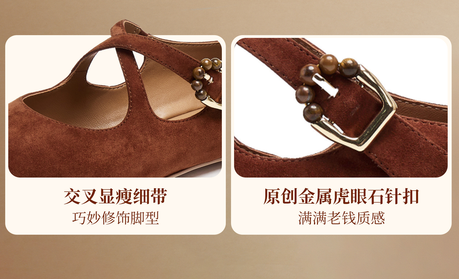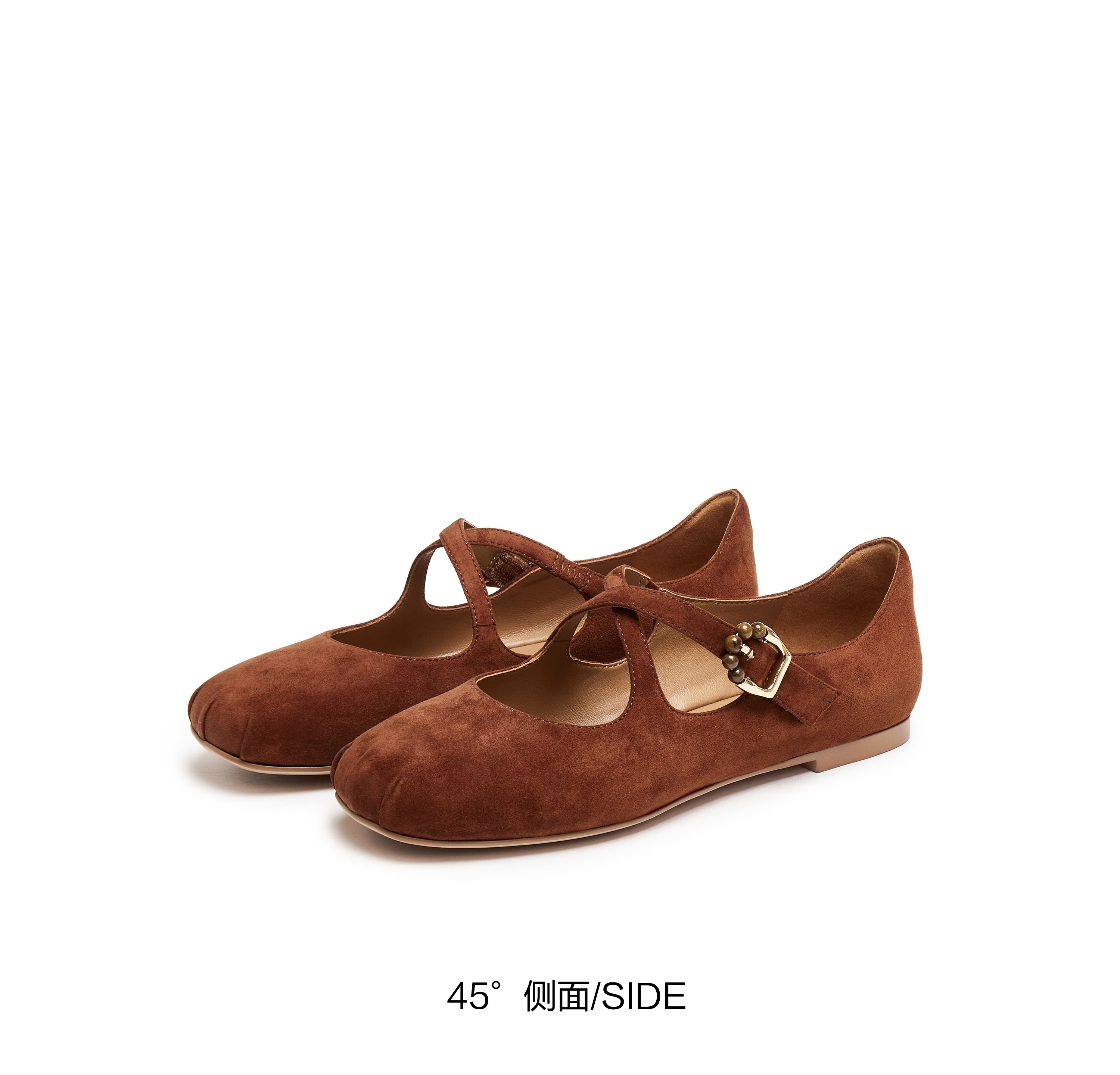 | 鞋底材质:橡胶底 | 内增高:无 | 鞋面材质:羊反绒 | 闭合方式:一字式扣带 | 配跟:无 |