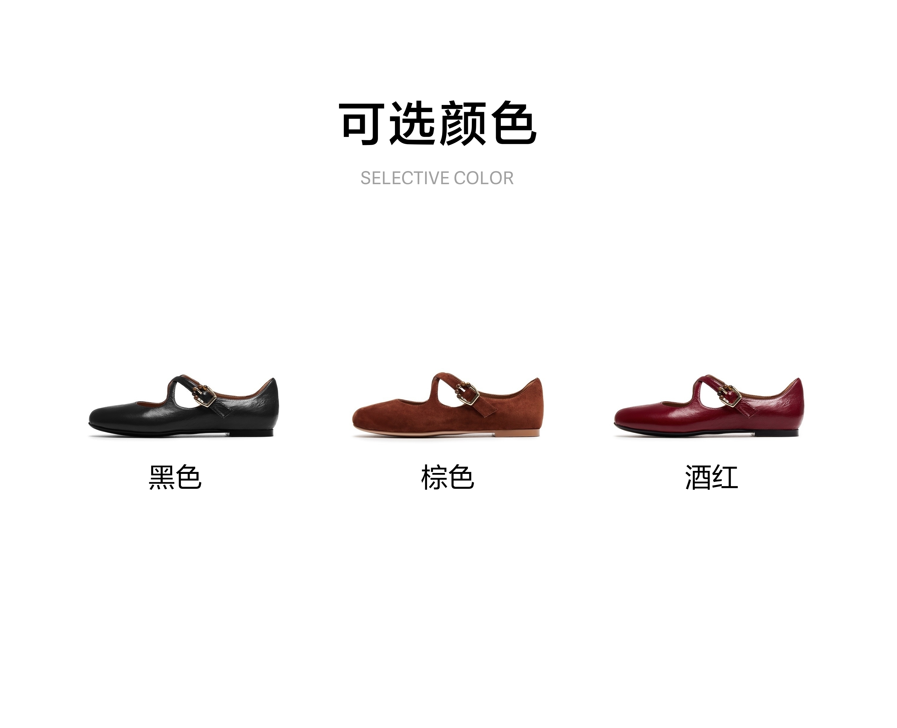 | 鞋底材质:橡胶底 | 内增高:无 | 鞋面材质:羊反绒 | 闭合方式:一字式扣带 | 配跟:无 |