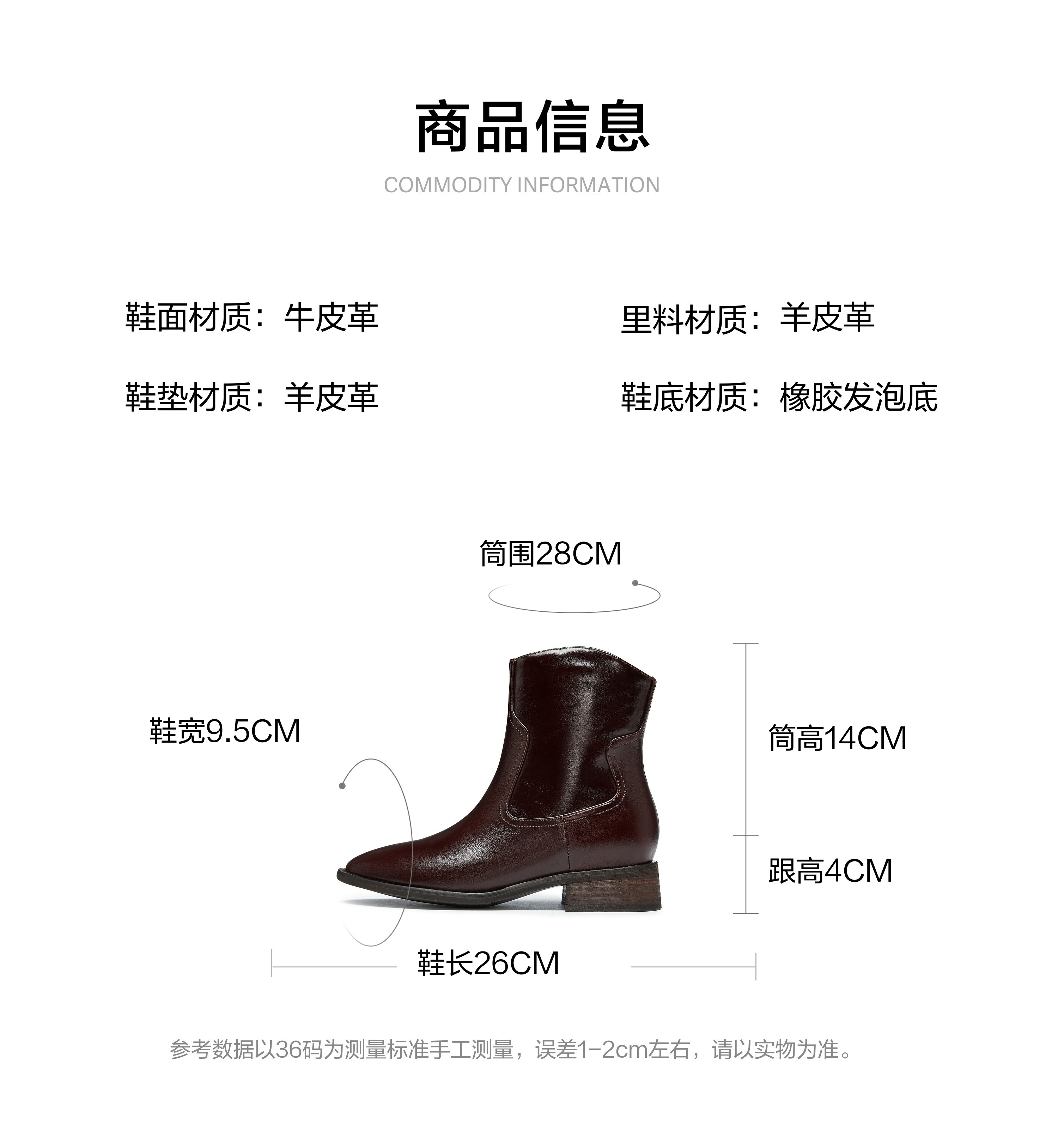 | 跟高数值:4CM | 筒高数值:14CM | 性别:女子 | 靴筒筒面材质:牛皮革 | 里料材质:羊皮革 |