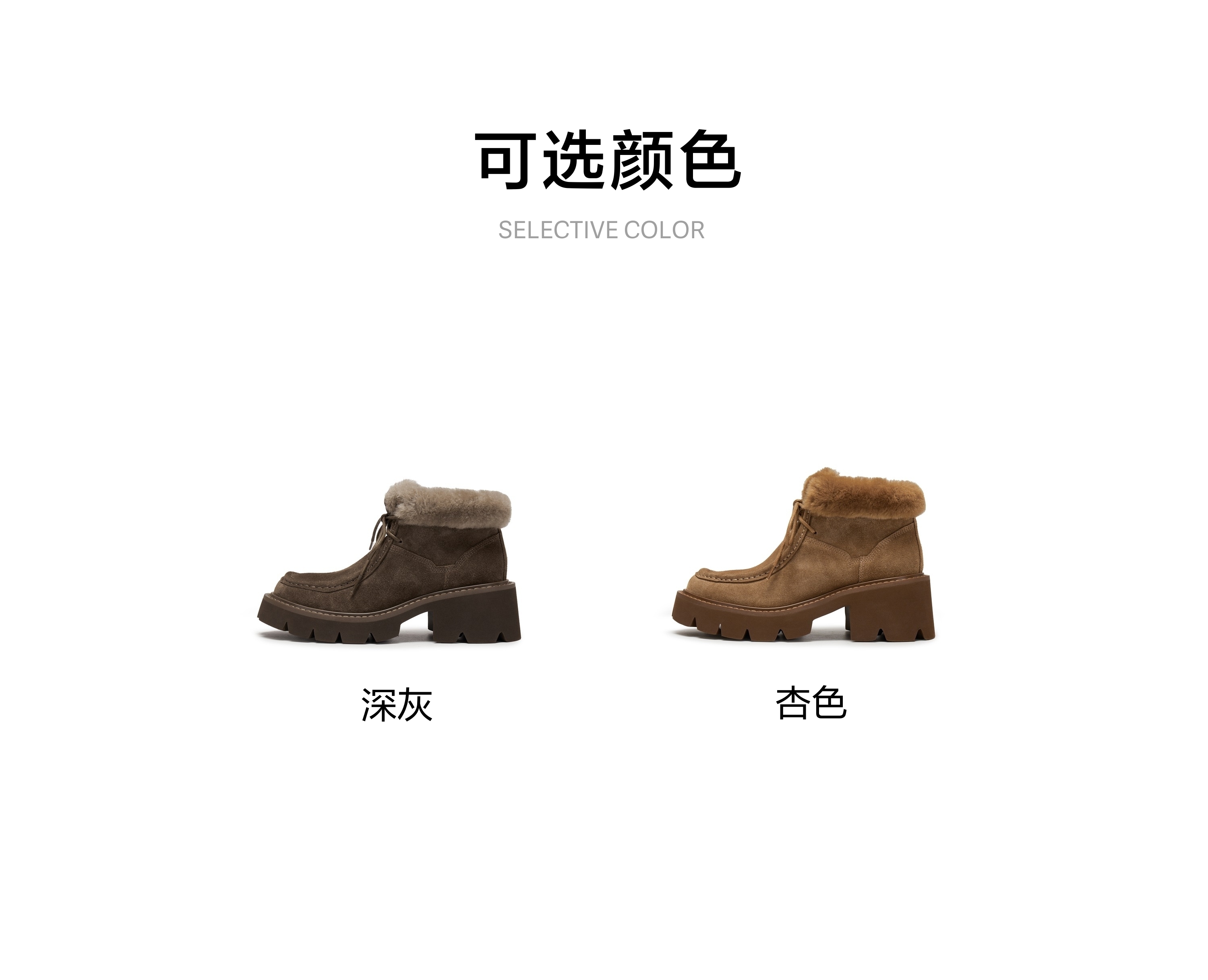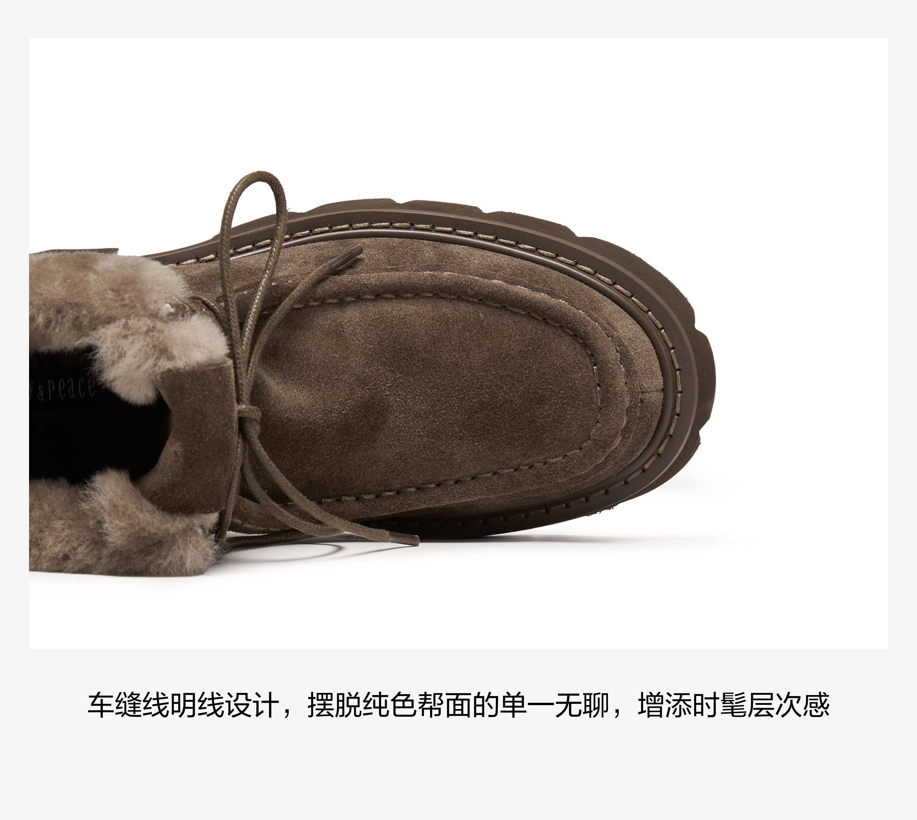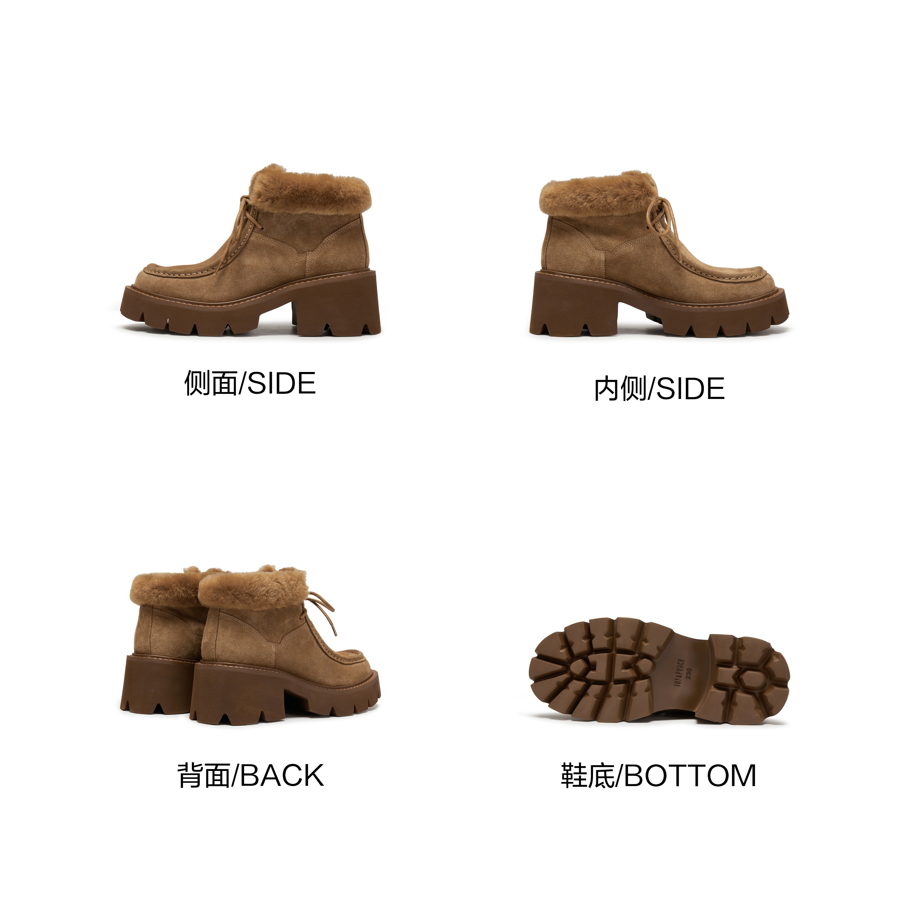 | 筒高数值:15CM | 性别:女子 | 靴筒筒面材质:羊毛皮牛剖层革 | 里料材质:织物 | 制鞋工艺:车线胶粘 |