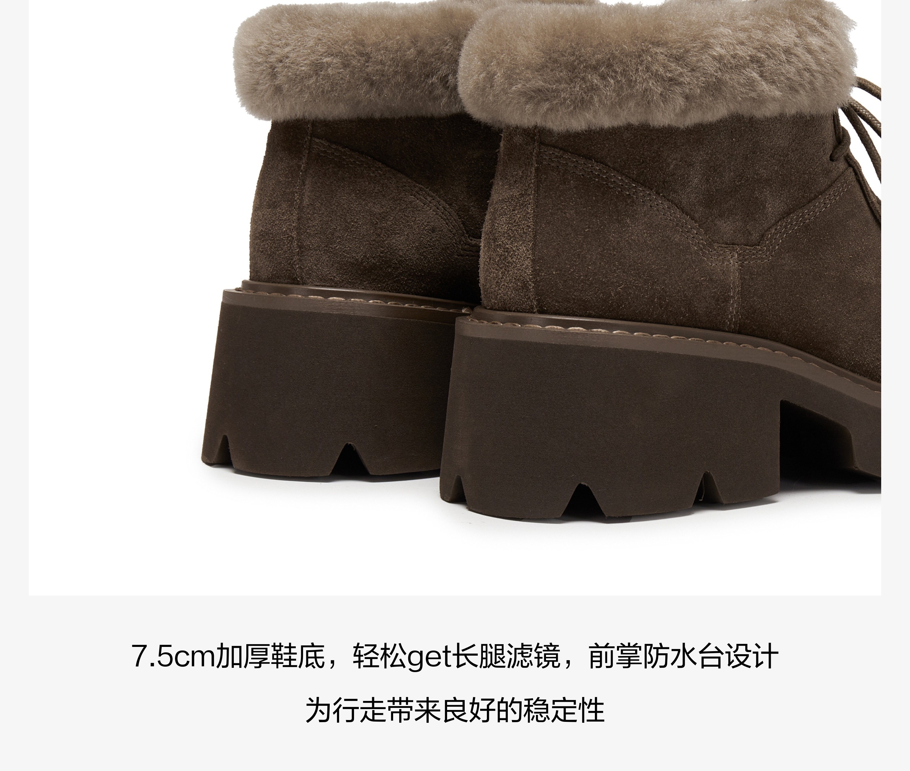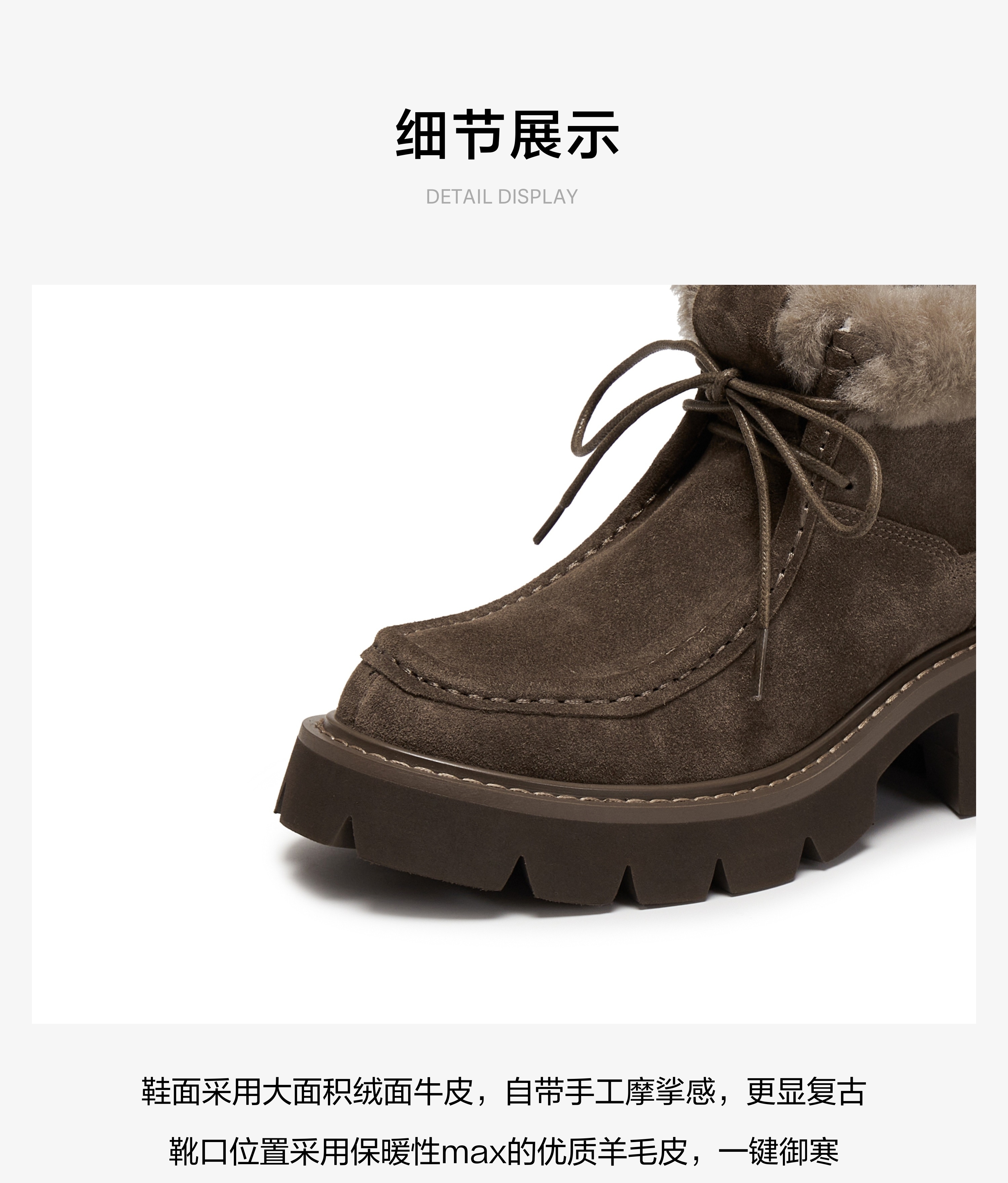| 帮面材质:羊毛皮牛剖层革 | 配跟:无 | 靴筒口围:33CM | 上市时间:2025年冬季 | 鞋类流行款式:雪地靴 |