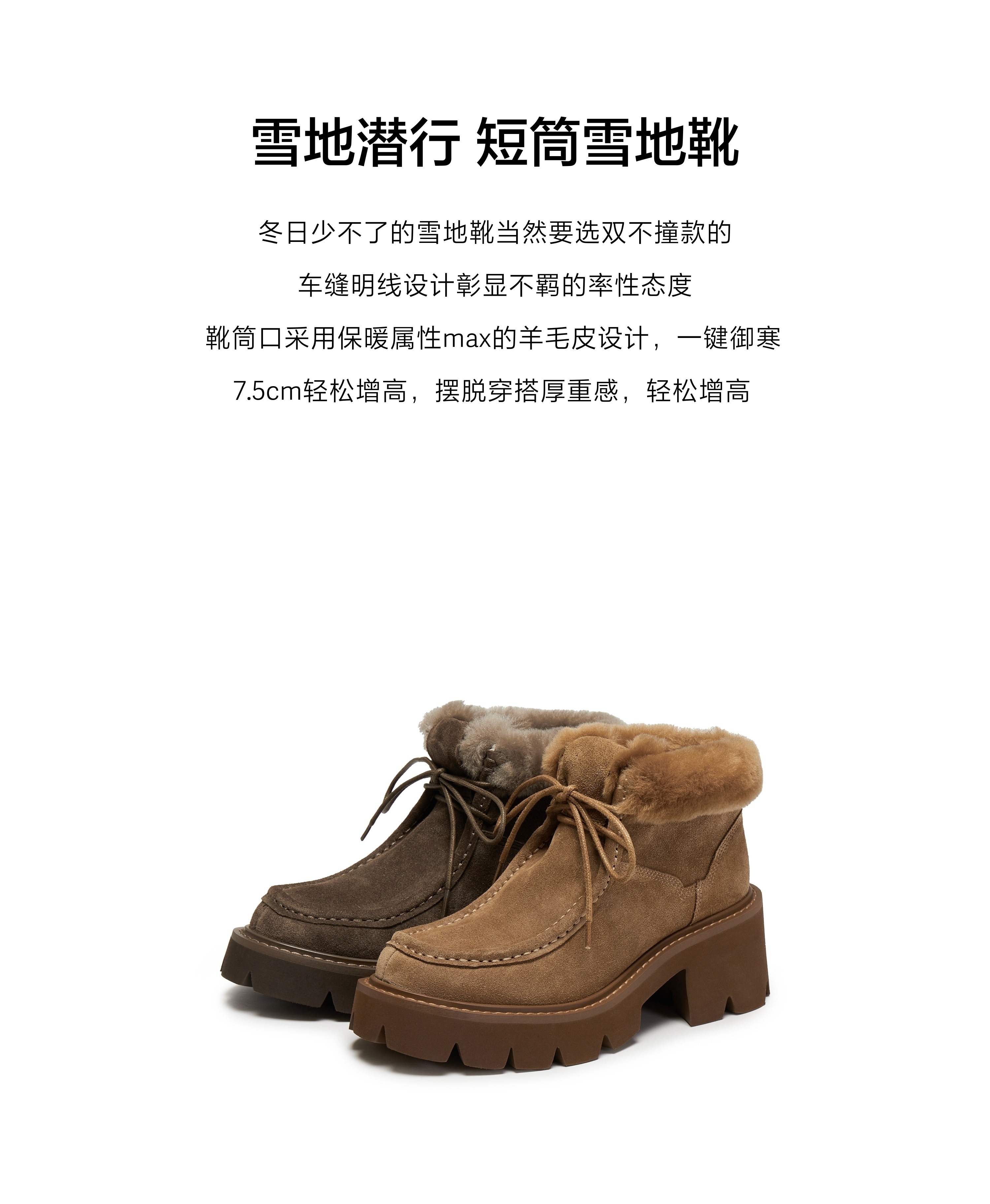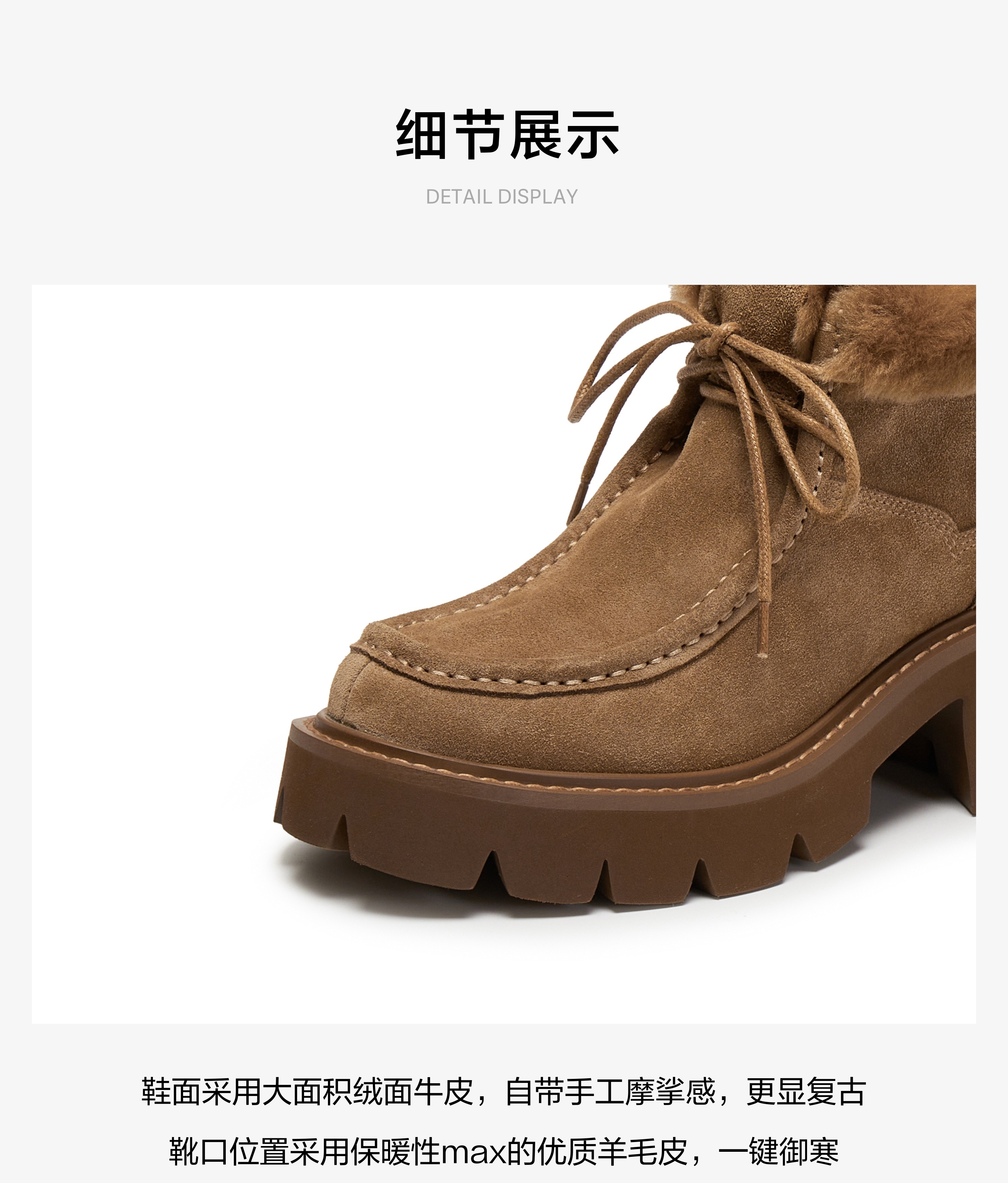 | 帮面材质:羊毛皮牛剖层革 | 配跟:无 | 靴筒口围:33CM | 上市时间:2025年冬季 | 鞋类流行款式:雪地靴 |