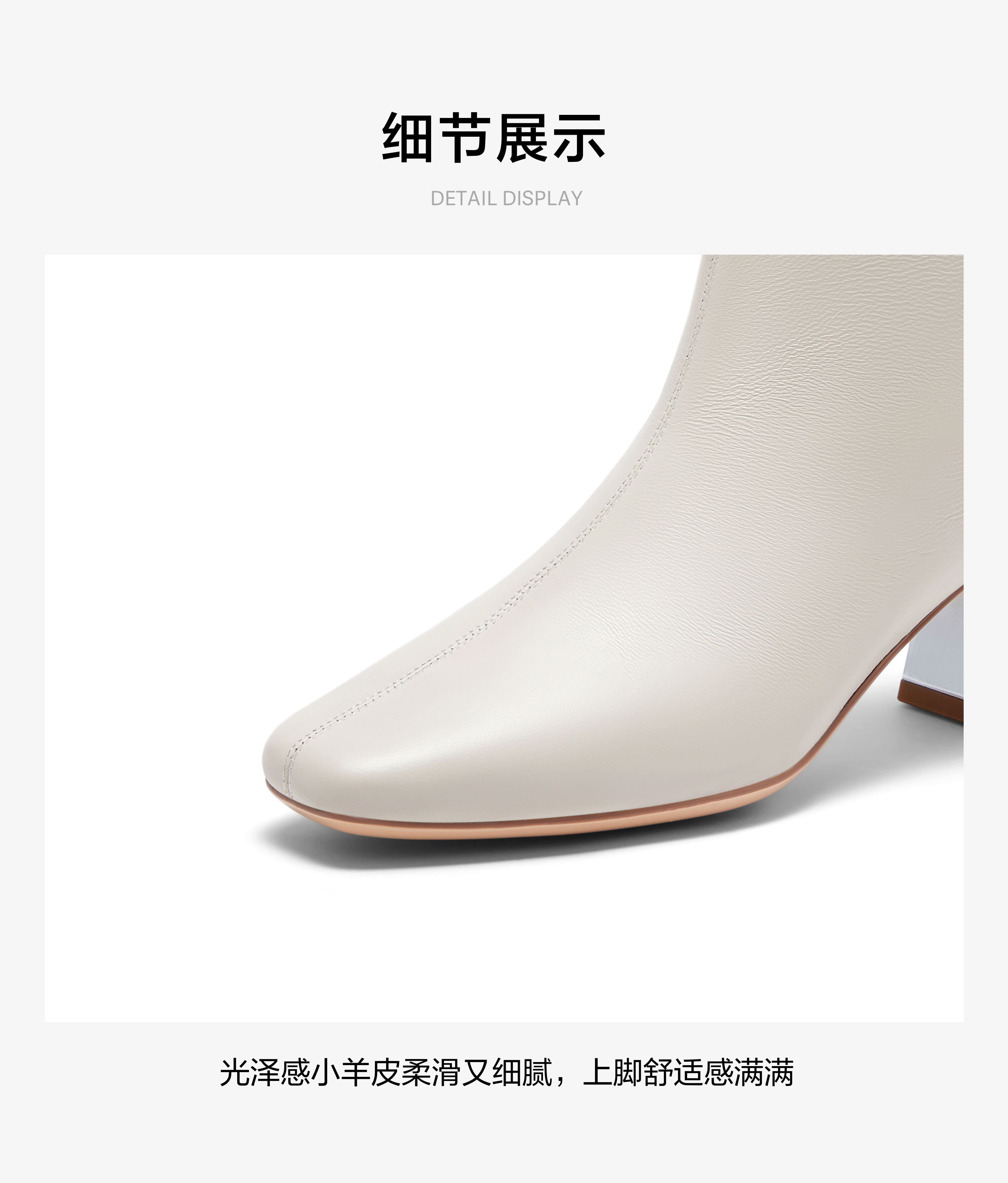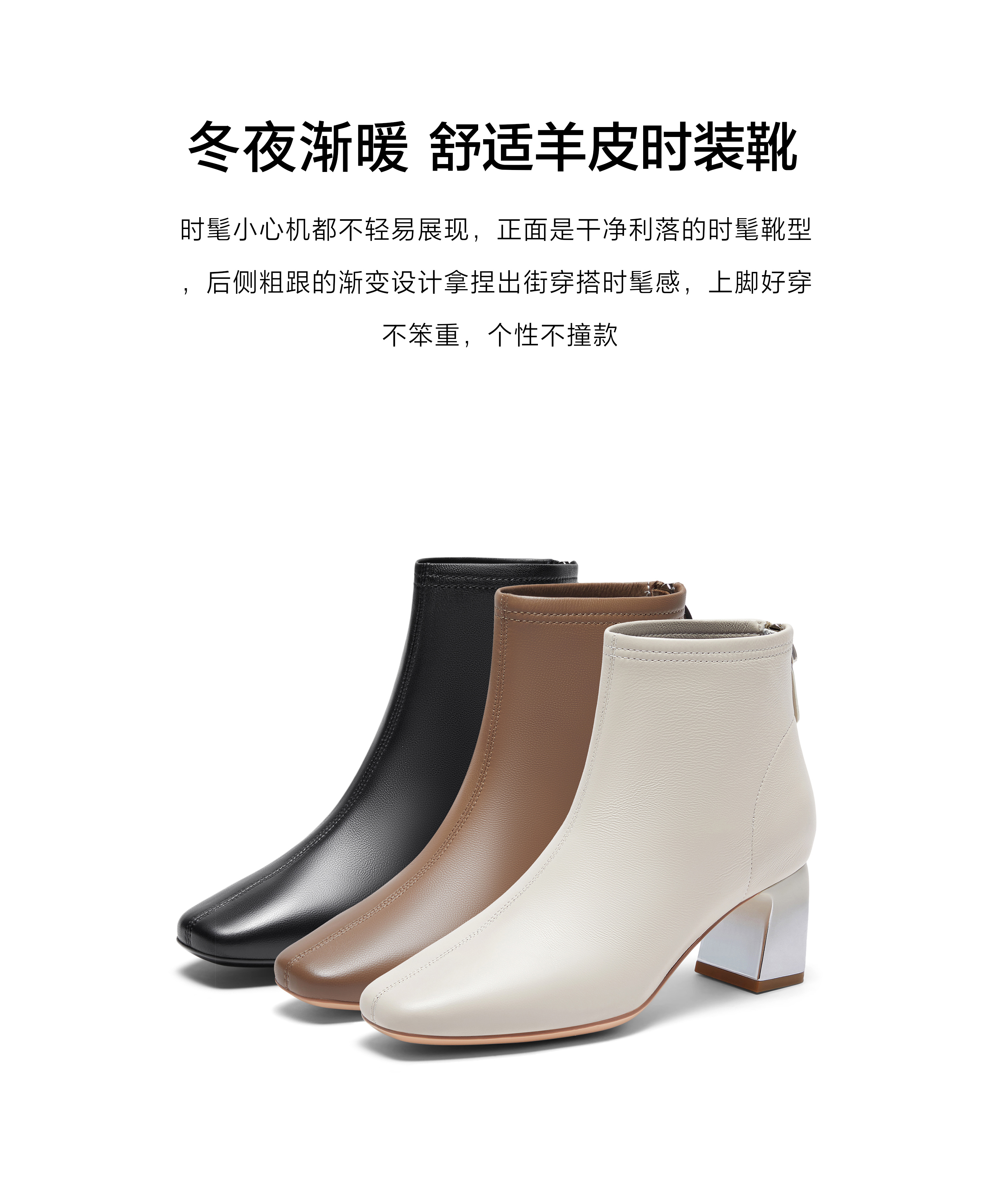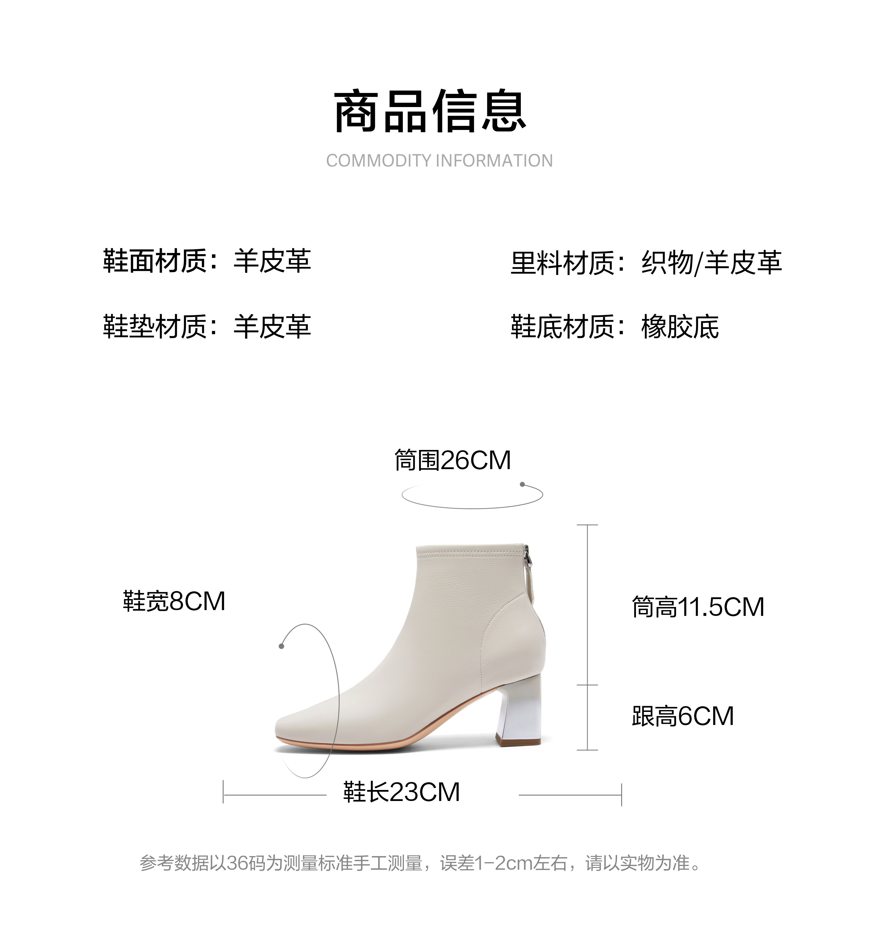 | 鞋底材质:橡胶底 | 靴筒内里材质:羊皮革 | 内增高:无 | 鞋面材质:羊皮革 | 闭合方式:后拉链 |