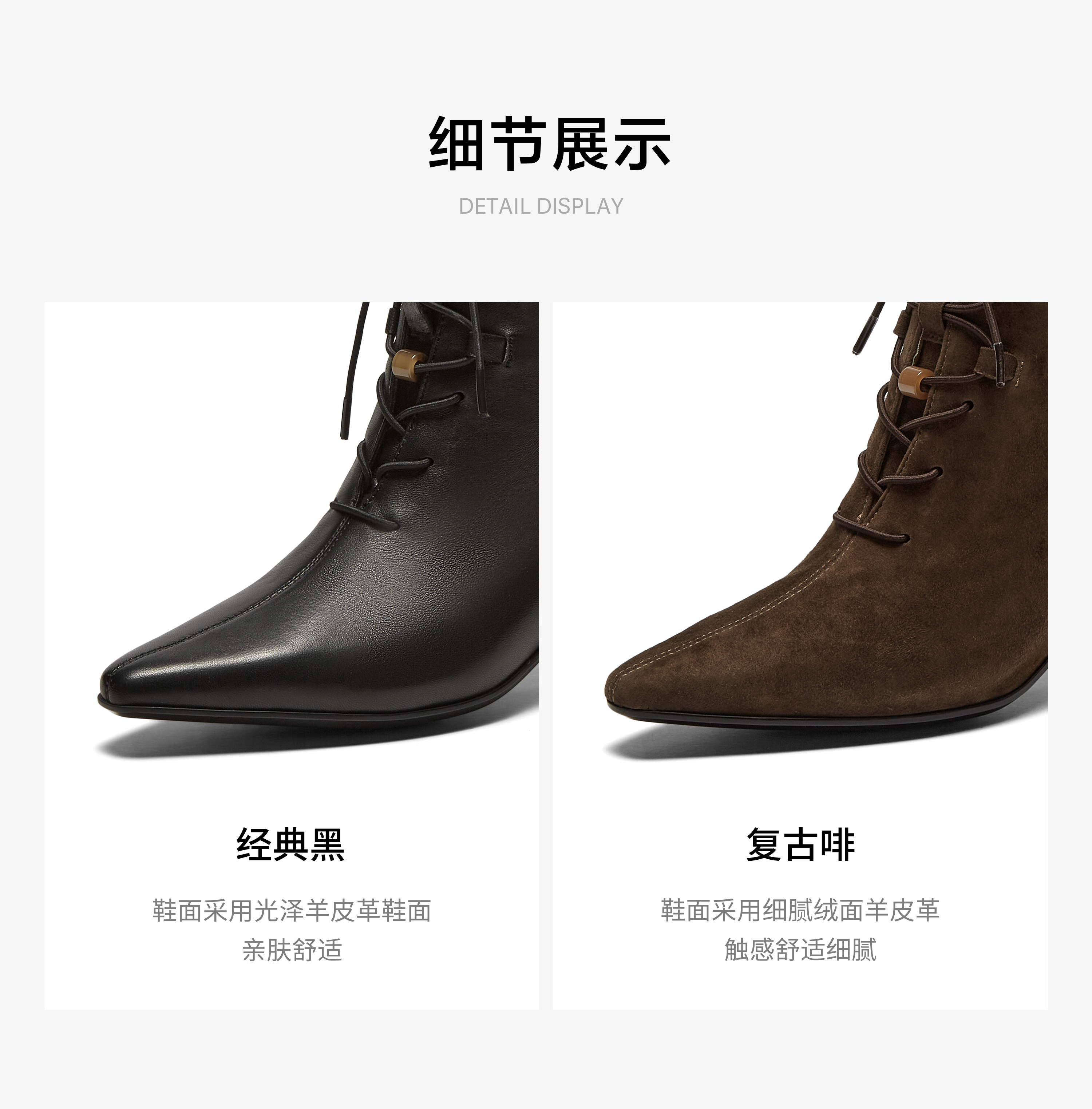 | 筒高数值:17CM | 性别:女子 | 靴筒筒面材质:羊皮革 | 里料材质:羊皮革 | 制鞋工艺:车线胶粘 |