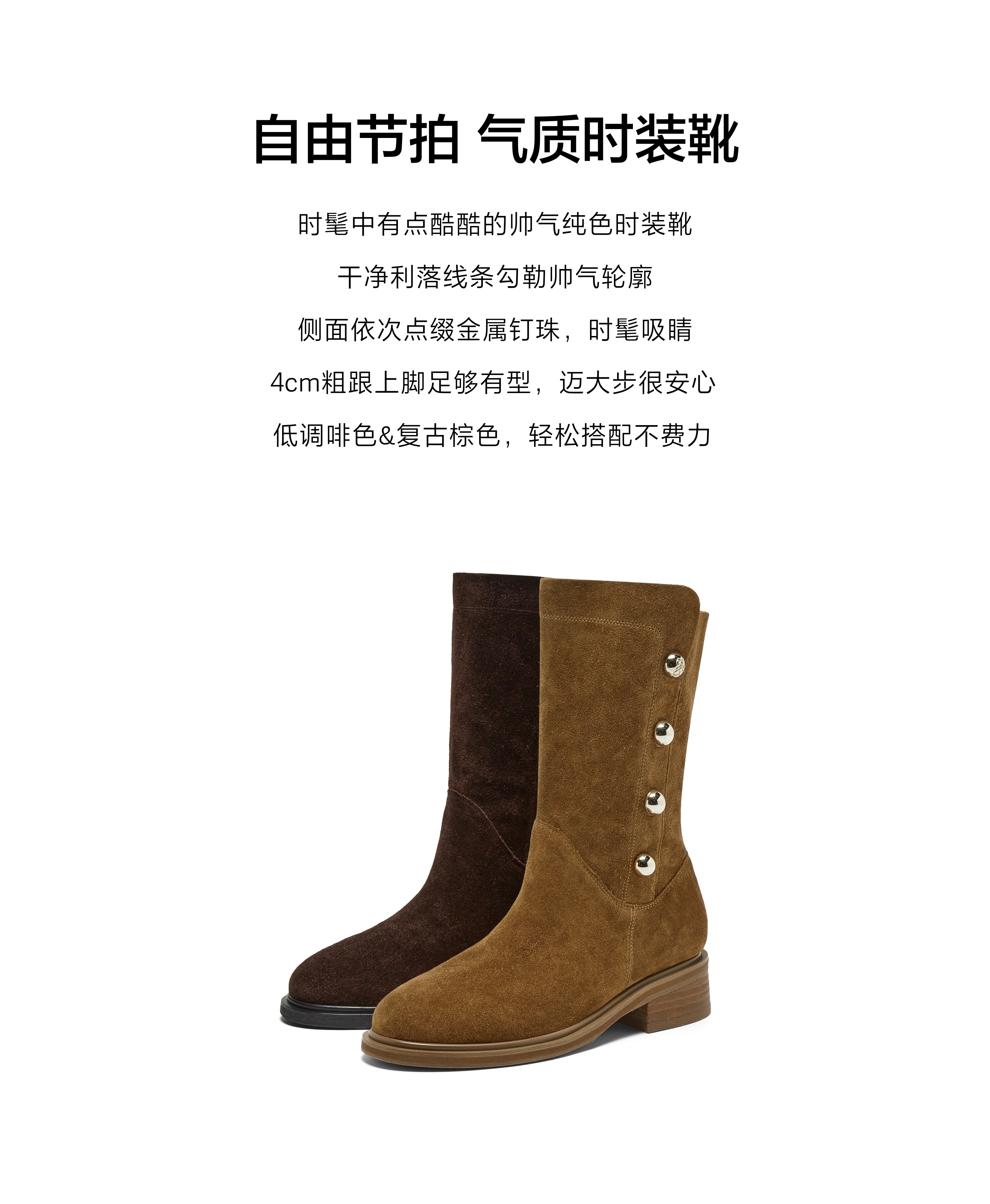 | 风格:复古 | 鞋面内里材质:羊皮革 | 色系:棕色 | 跟高数值:4CM | 筒高数值:23CM |