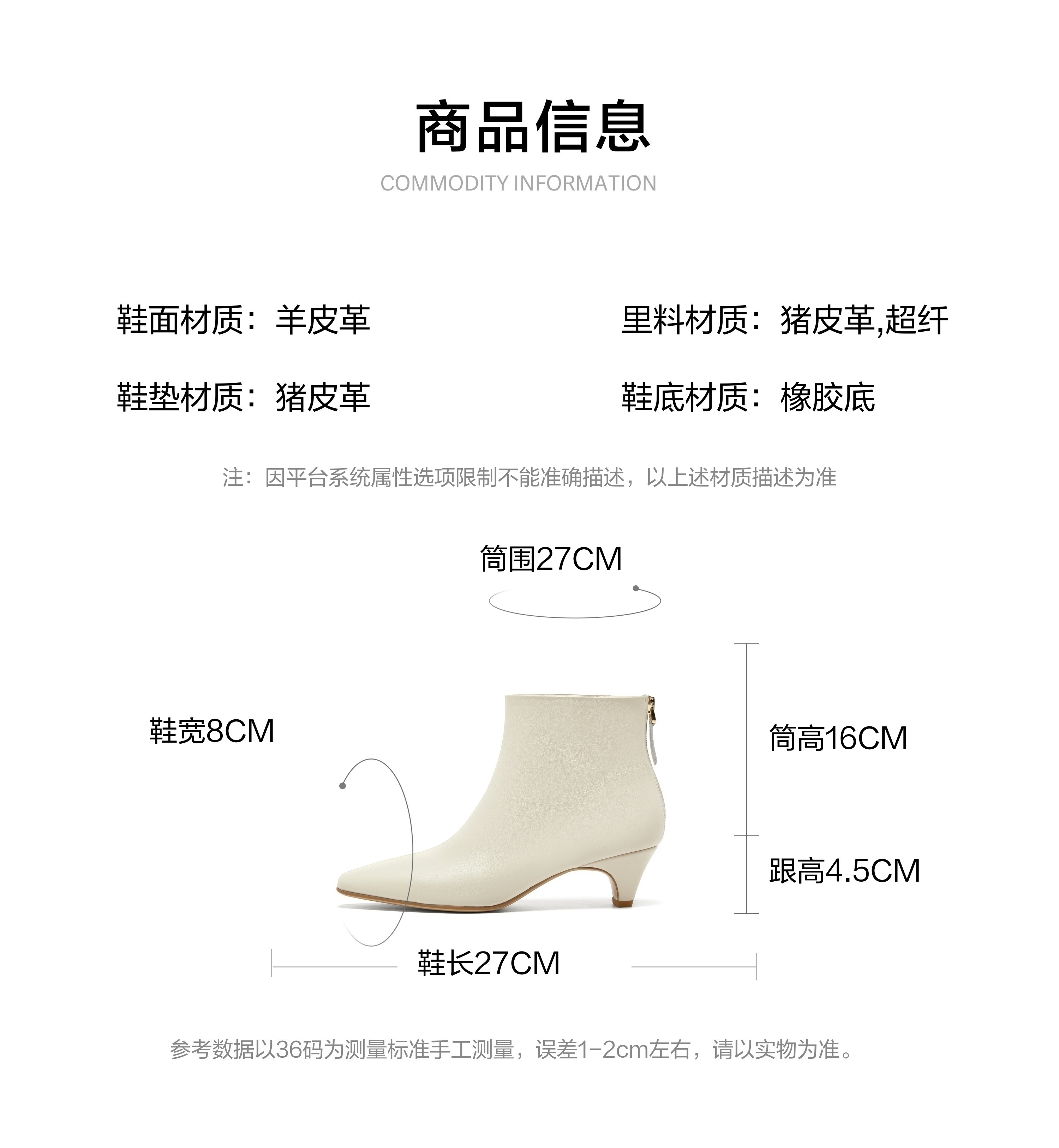 | 参考鞋宽(女):8CM | 鞋面内里材质:超纤猪皮革 | 色系:米色 | 跟高数值:4.5CM | 筒高数值:16CM |