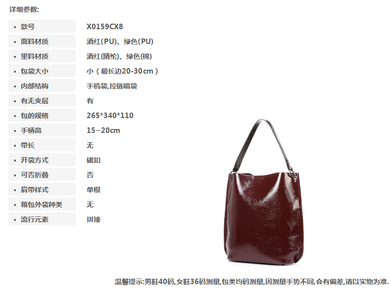 | 适用场景:宴会商务休闲 | 流行款式名称:水桶包 | 开袋方式:磁扣 | 性别:女 | 手柄高:15~20cm |