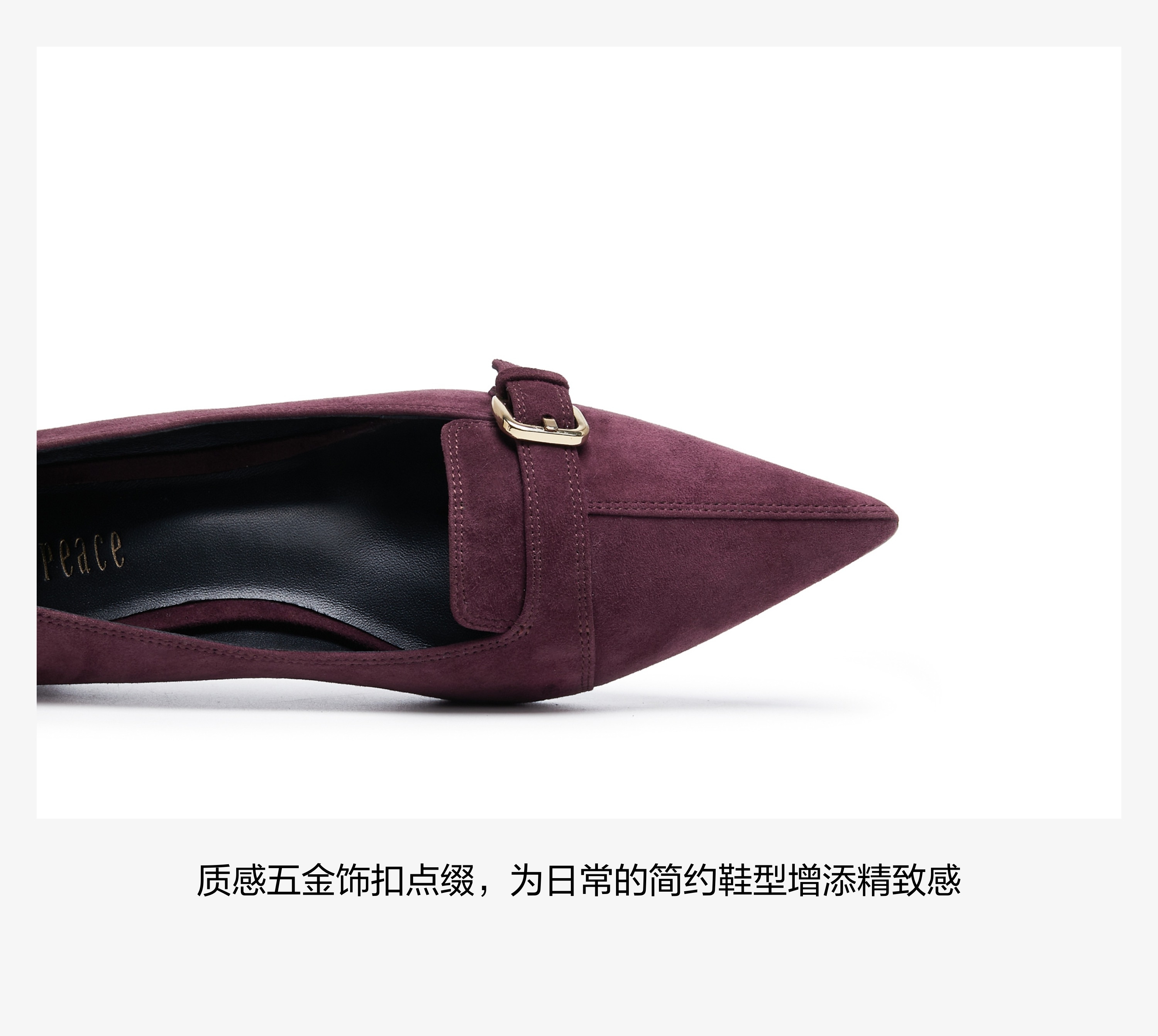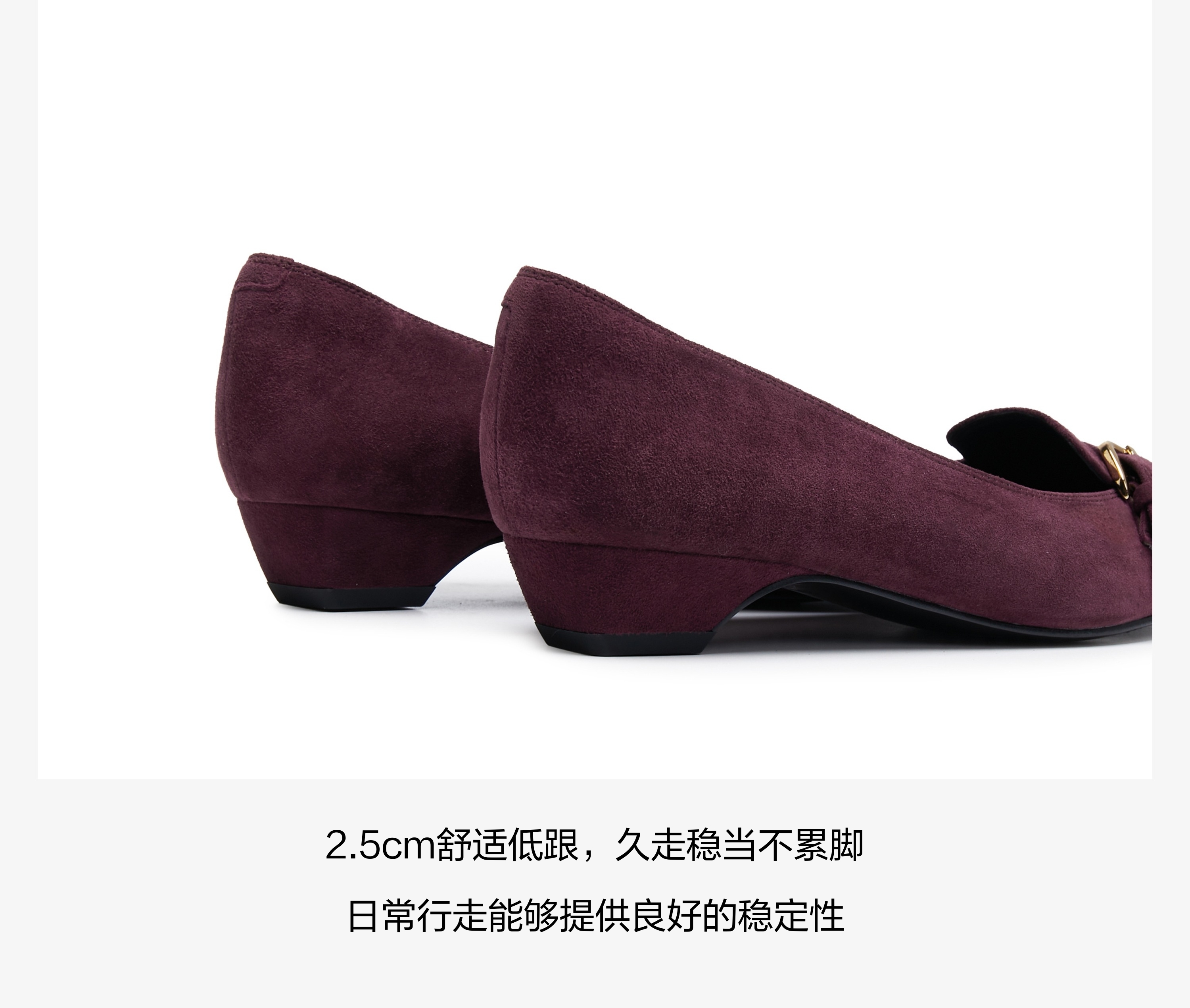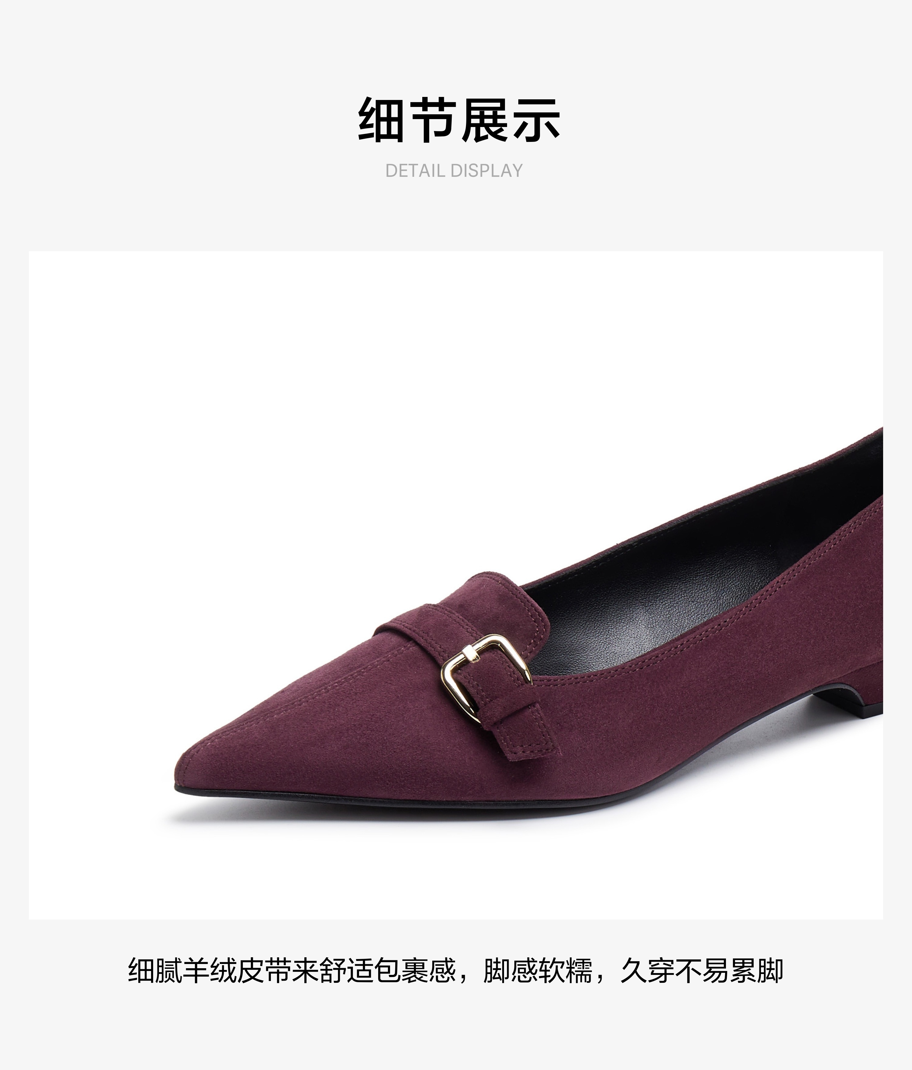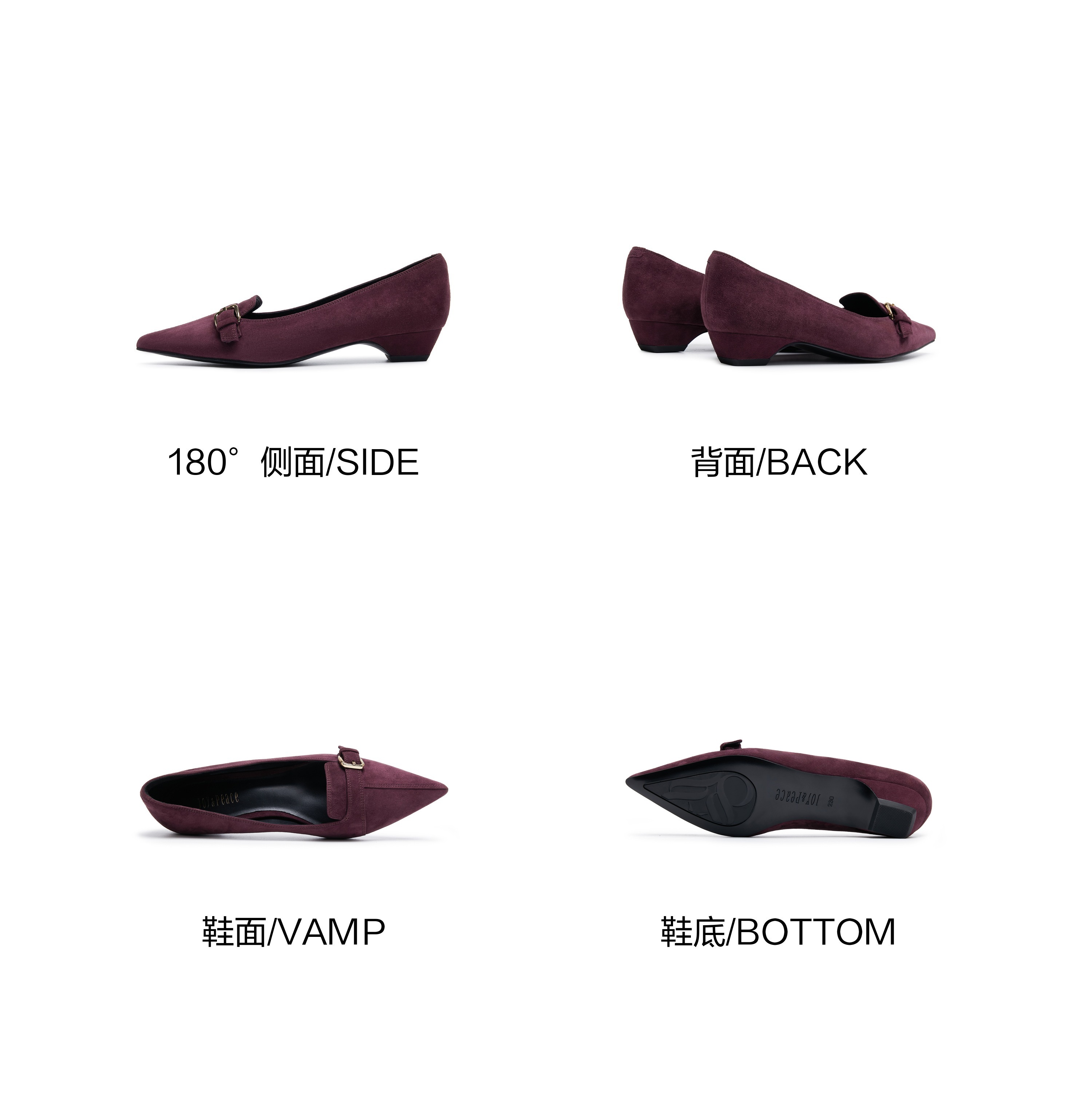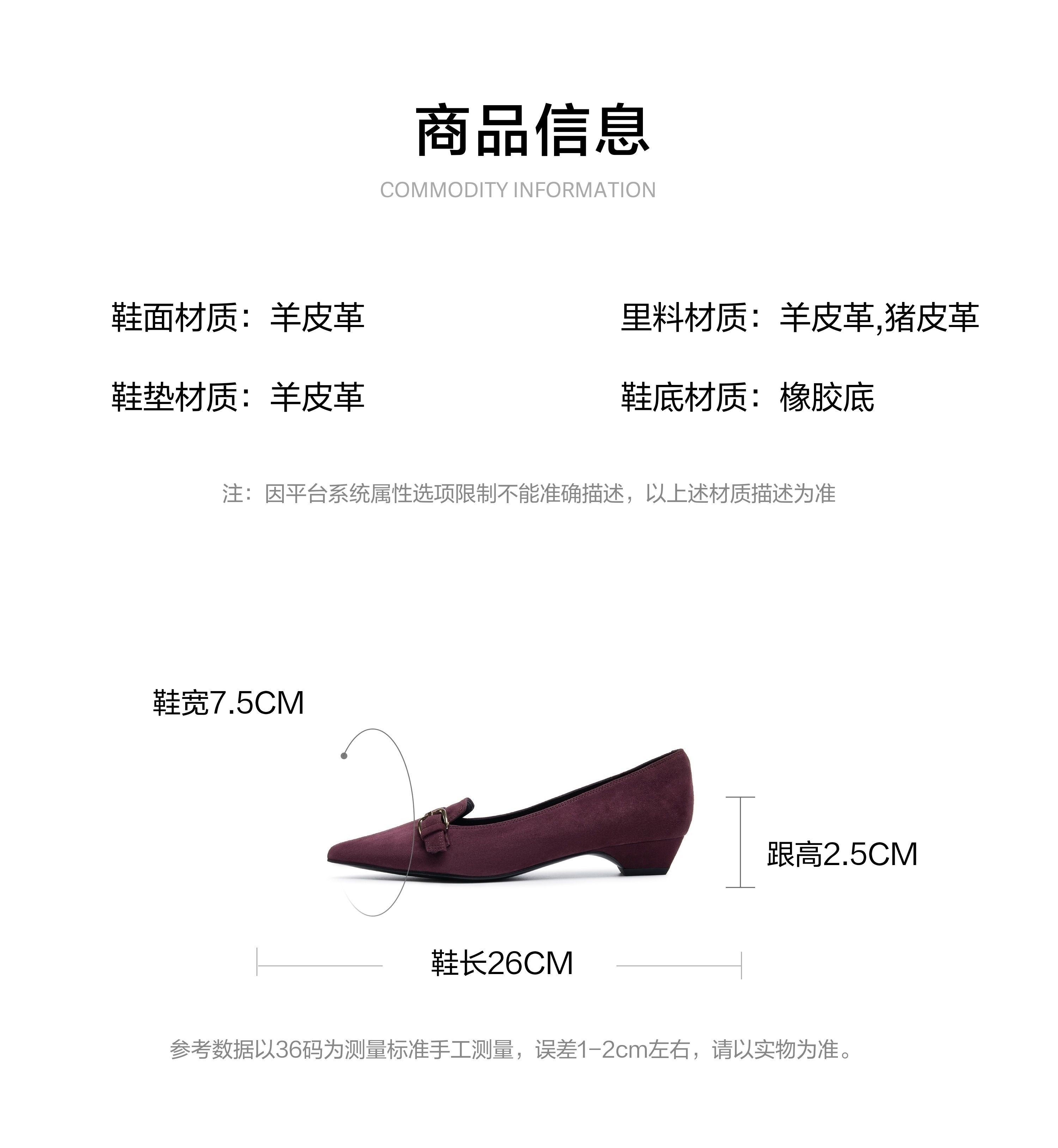 | 鞋面内里材质:猪皮羊皮革 | 色系:紫色 | 跟高数值:2.5CM | 配跟:无 | 性别:女子 |