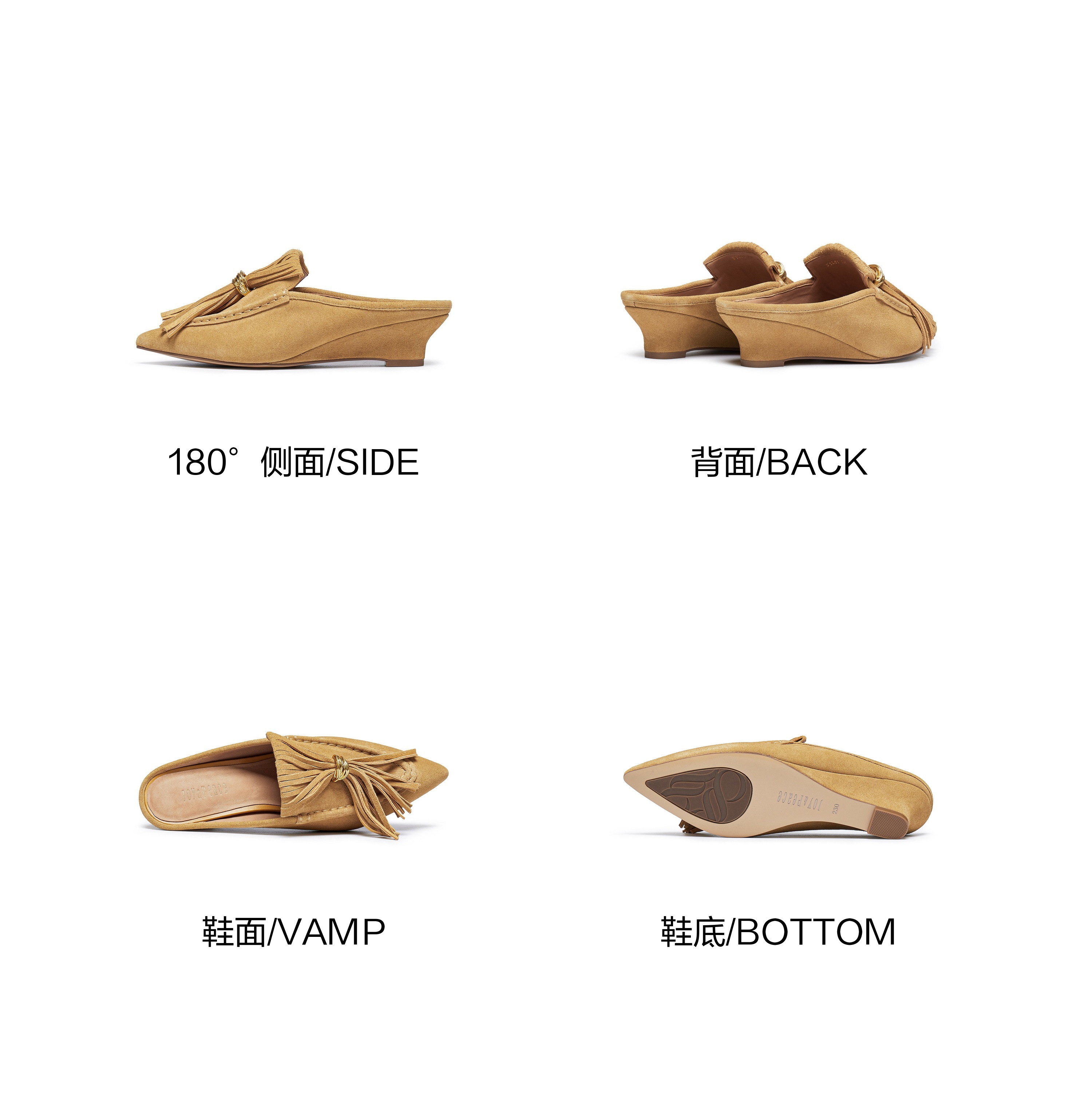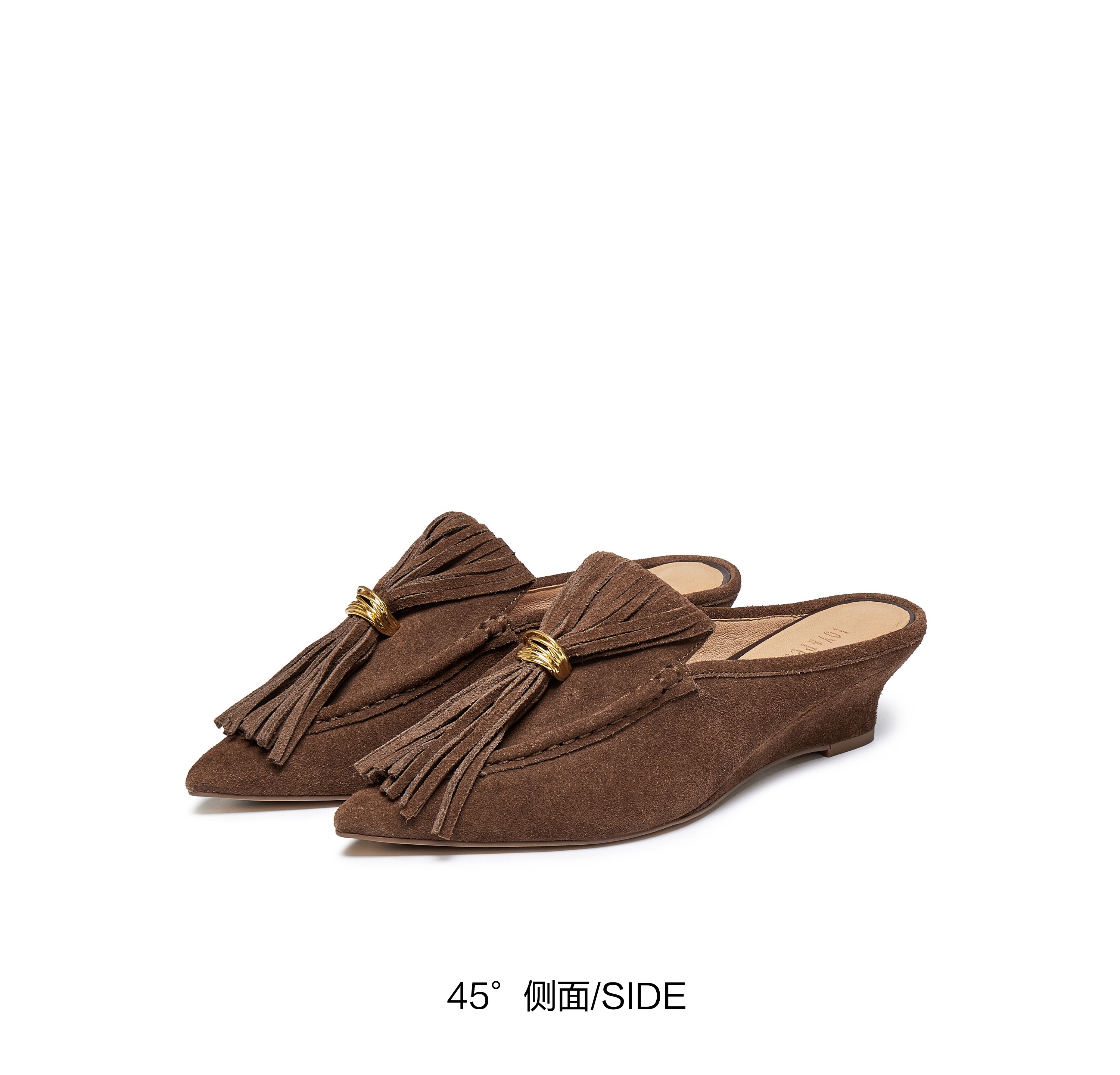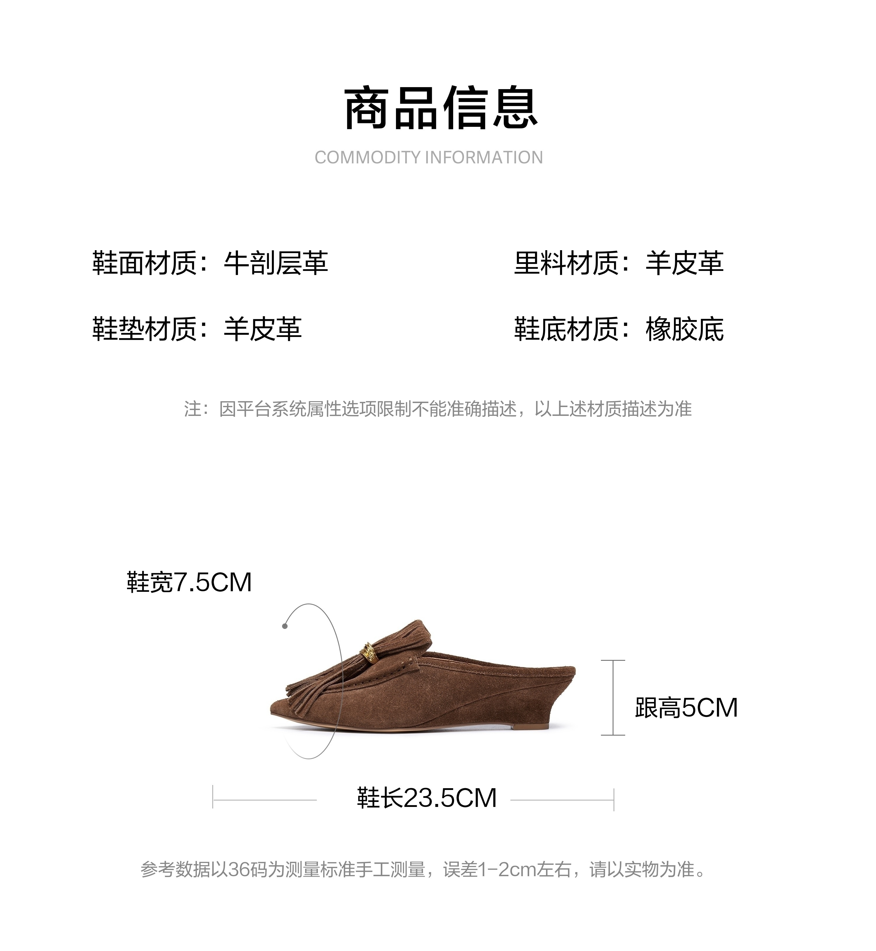 | 鞋头款式:尖头 | 鞋底材质:橡胶底 | 鞋面图案:纯色 | 鞋跟形状:坡跟 | 鞋面材质:牛剖层革 |