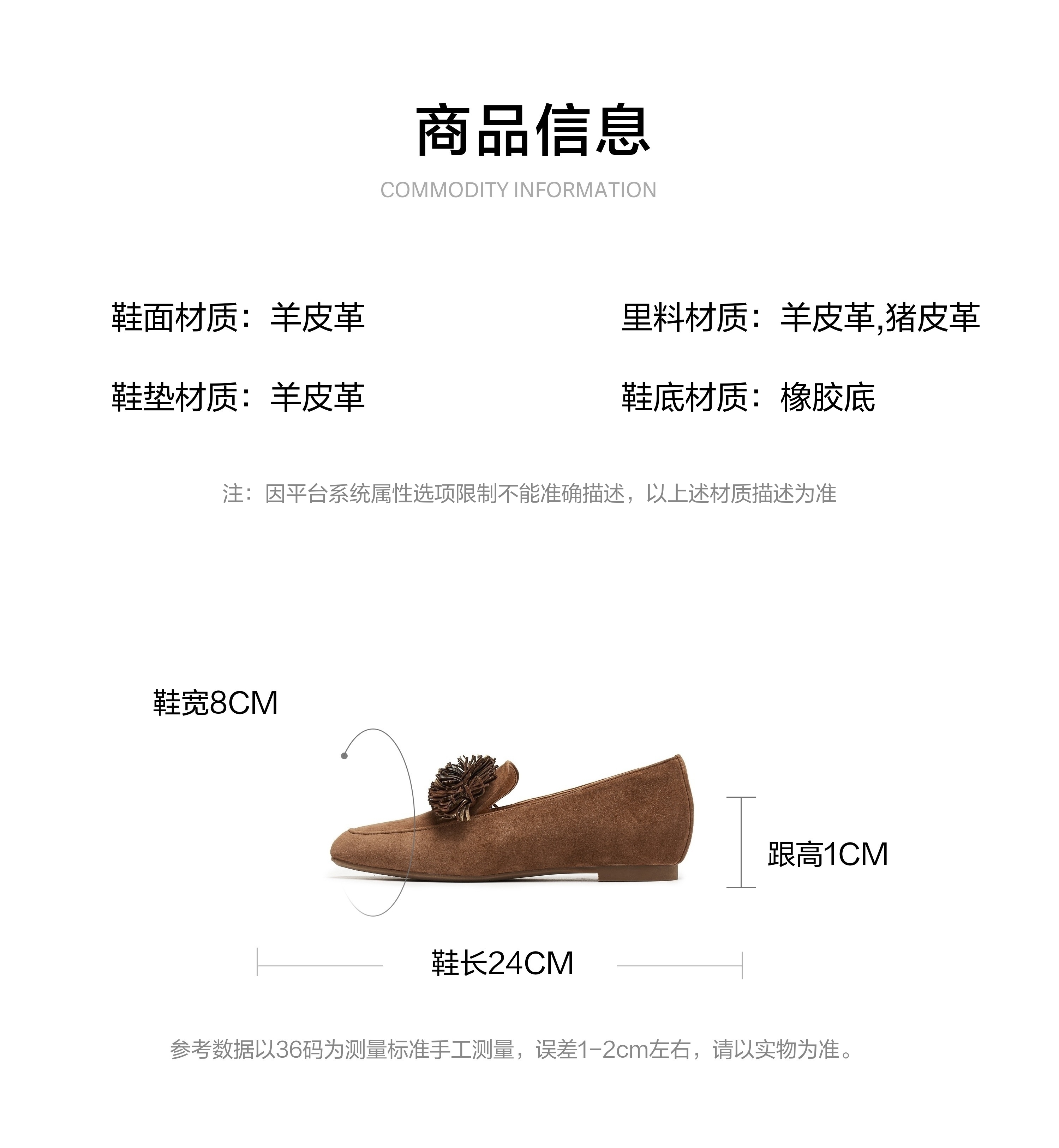 | 鞋垫材质:羊皮革 | 款式季节:秋季 | 前掌高度:0.5CM | 皮质特征:羊皮革 | 防水台高度:无 |