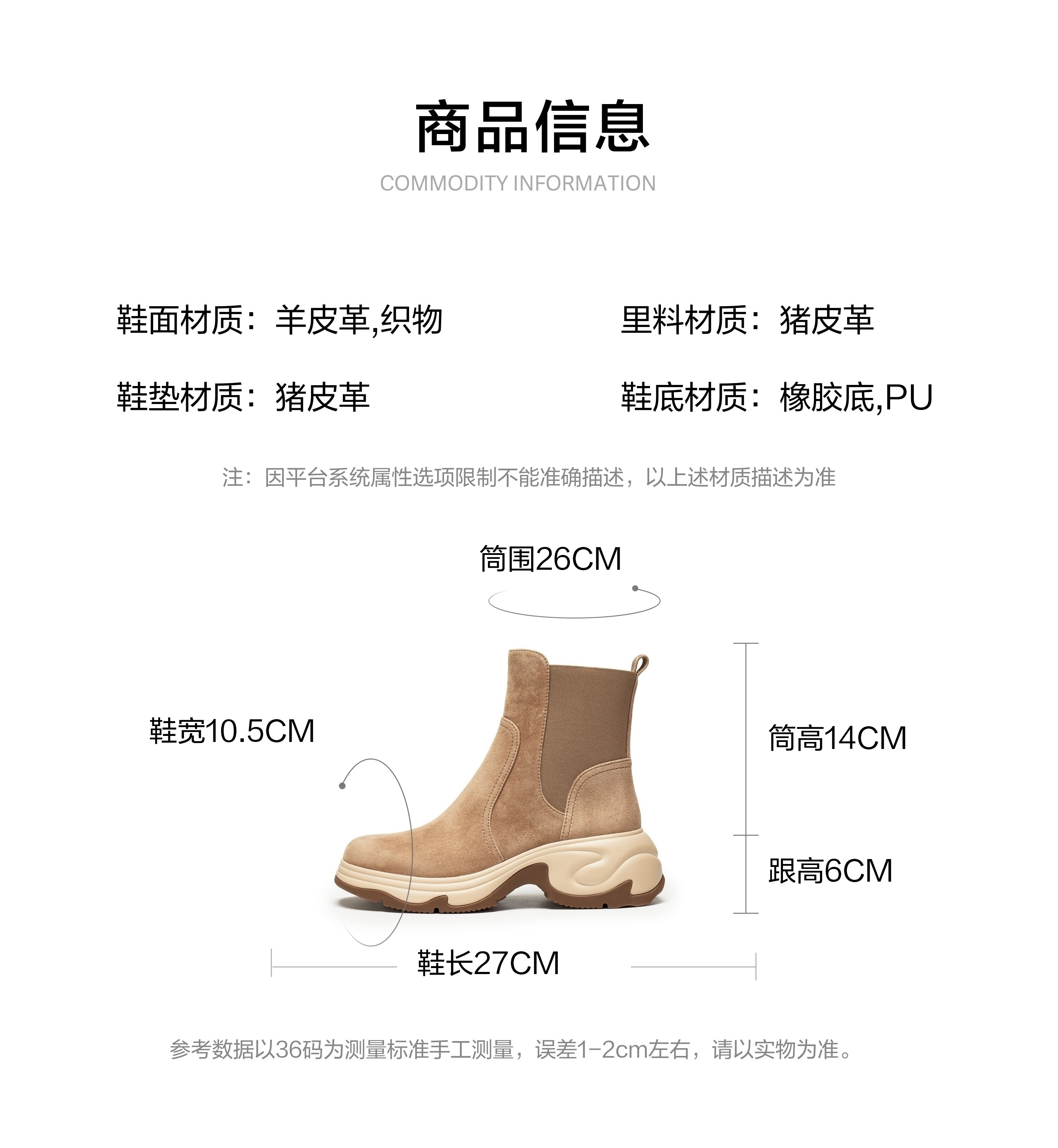 | 帮面材质:织物羊皮 | 配跟:无 | 靴筒口围:26CM | 上市时间:2025年冬季 | 鞋类流行款式:切尔西靴 |