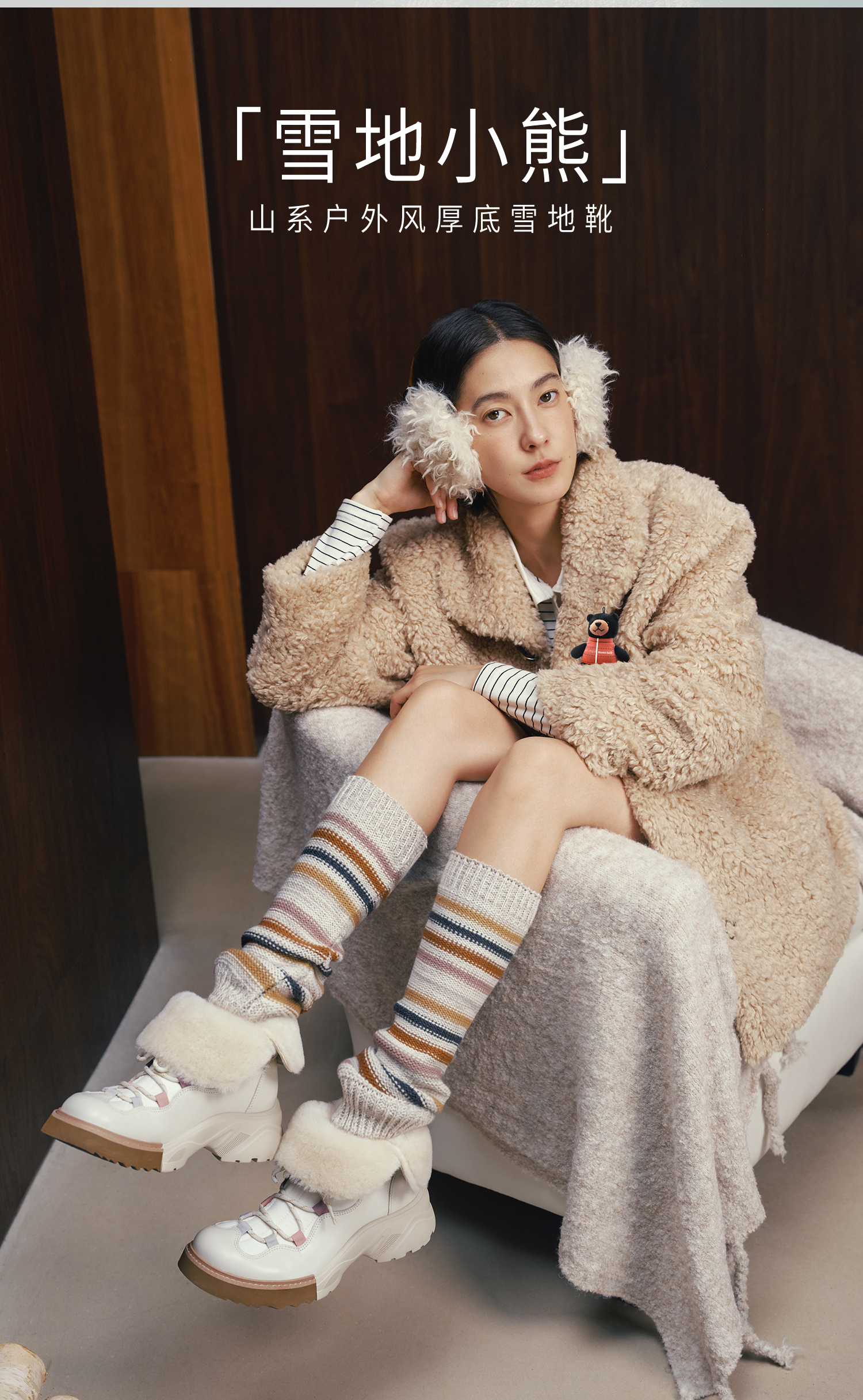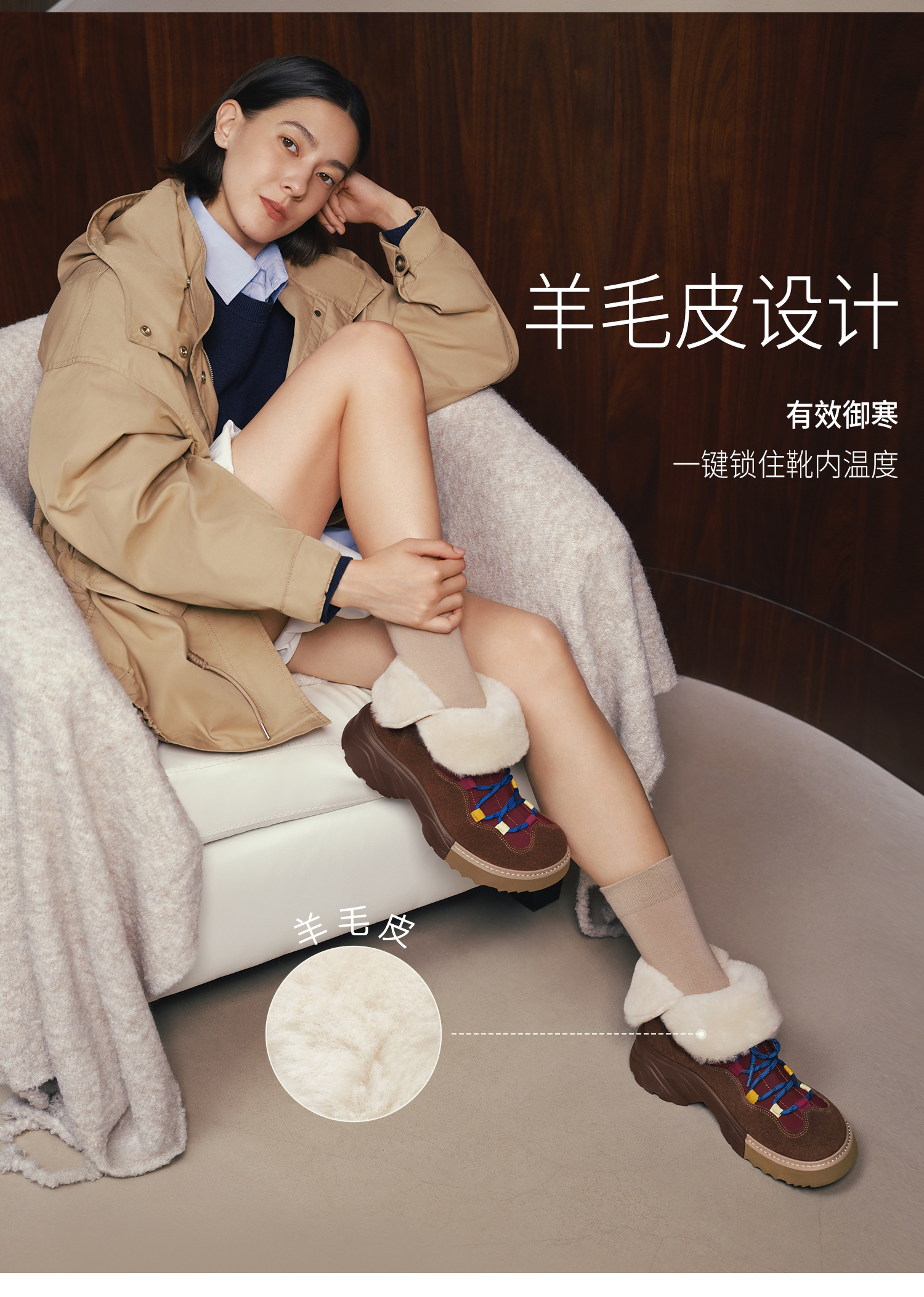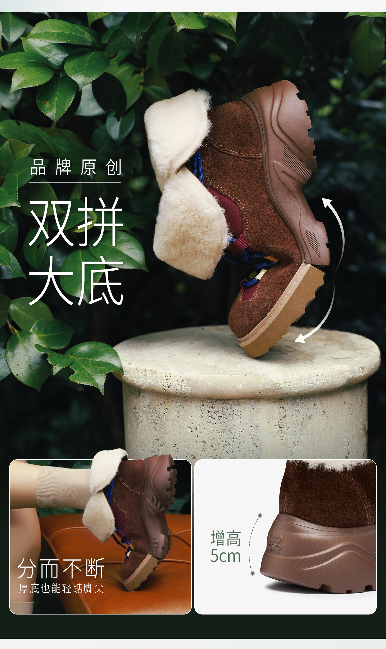 | 风格:时尚潮流 | 鞋面内里材质:羊毛皮织物 | 色系:咖啡色 | 跟高数值:5CM | 性别:女子 |