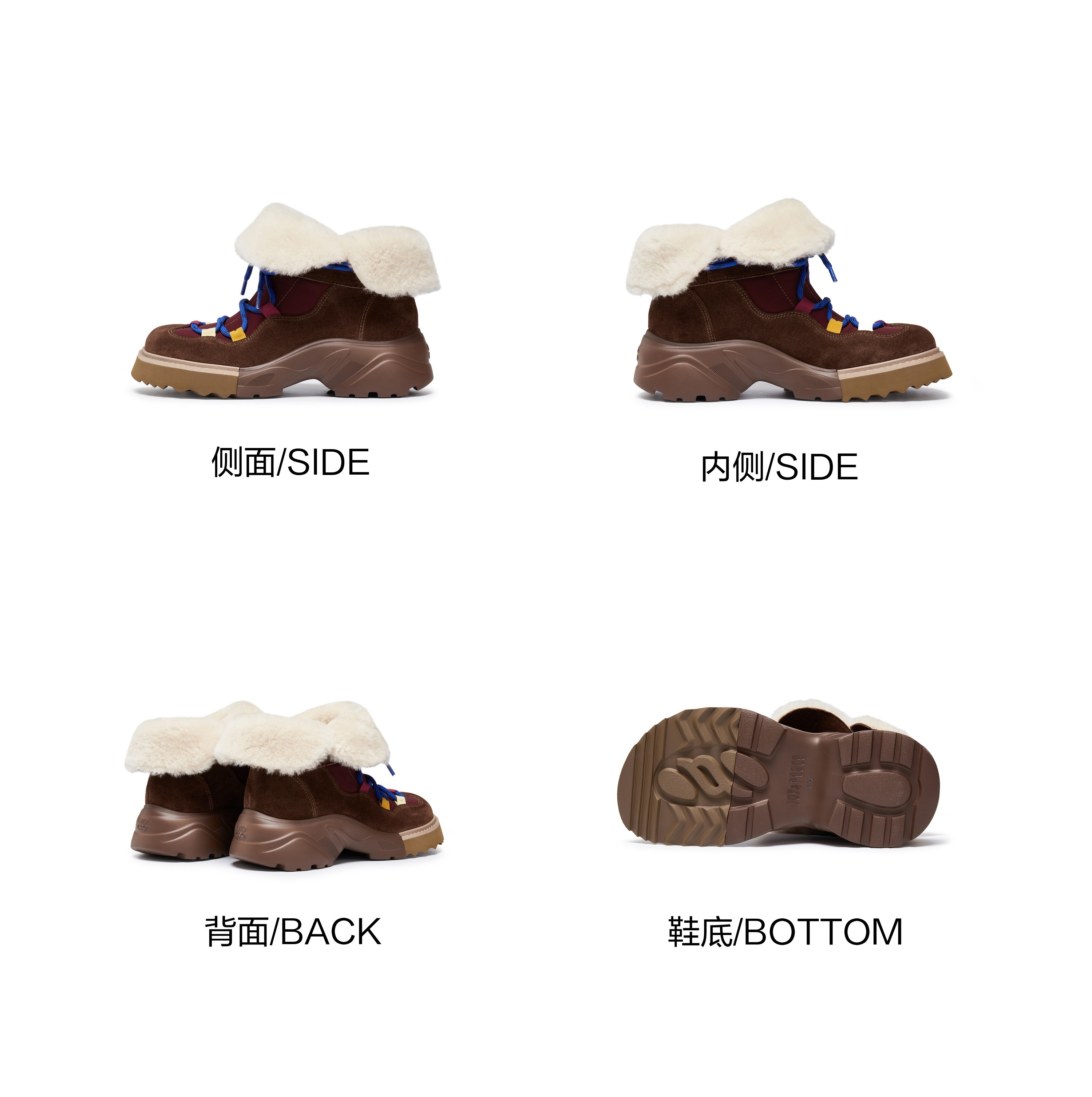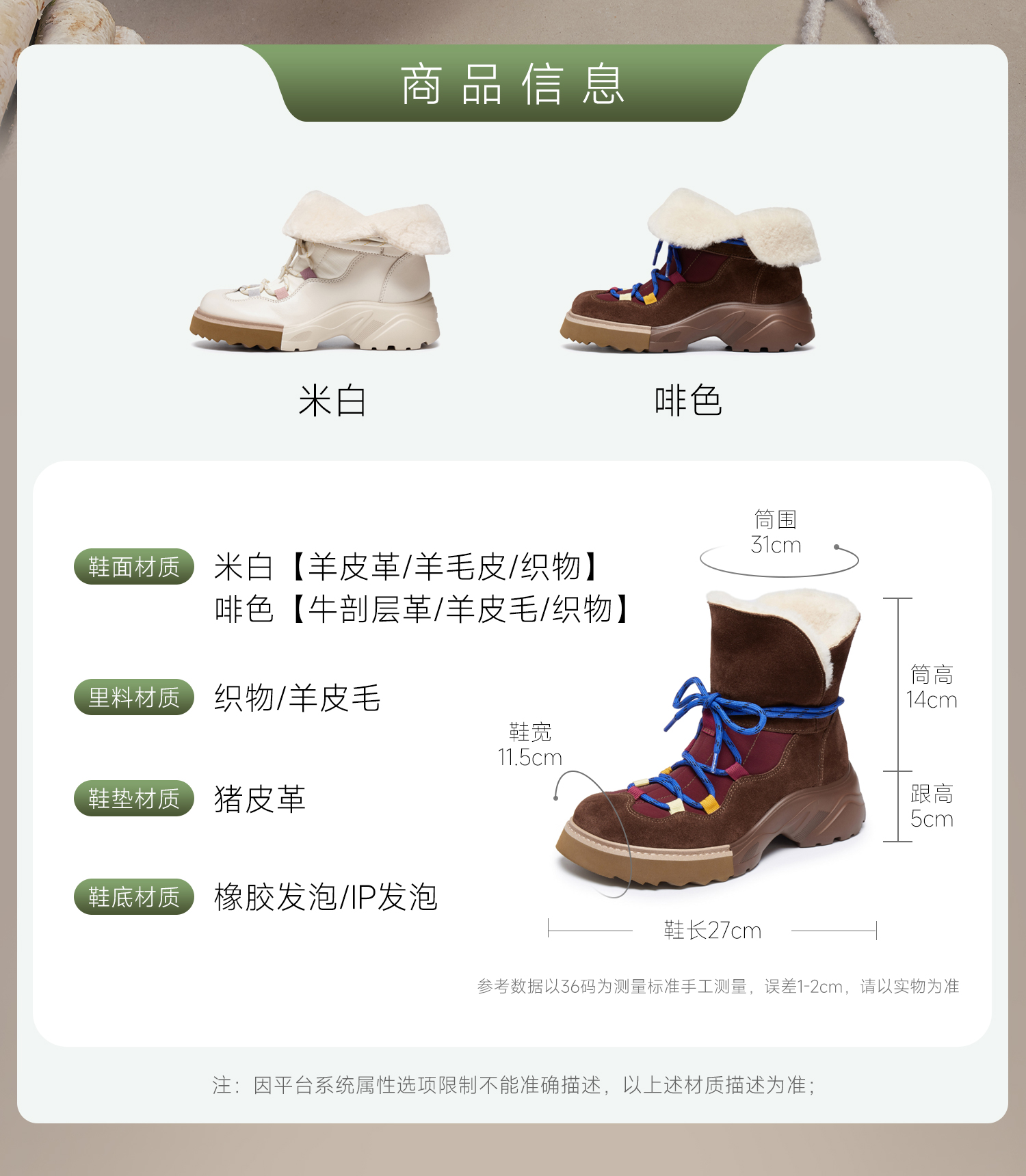 | 筒高数值:14CM | 靴筒筒面材质:牛剖层革羊皮毛一体织物 | 里料材质:织物羊毛皮 | 制鞋工艺:车线胶粘 | 鞋垫材质:猪皮革 |