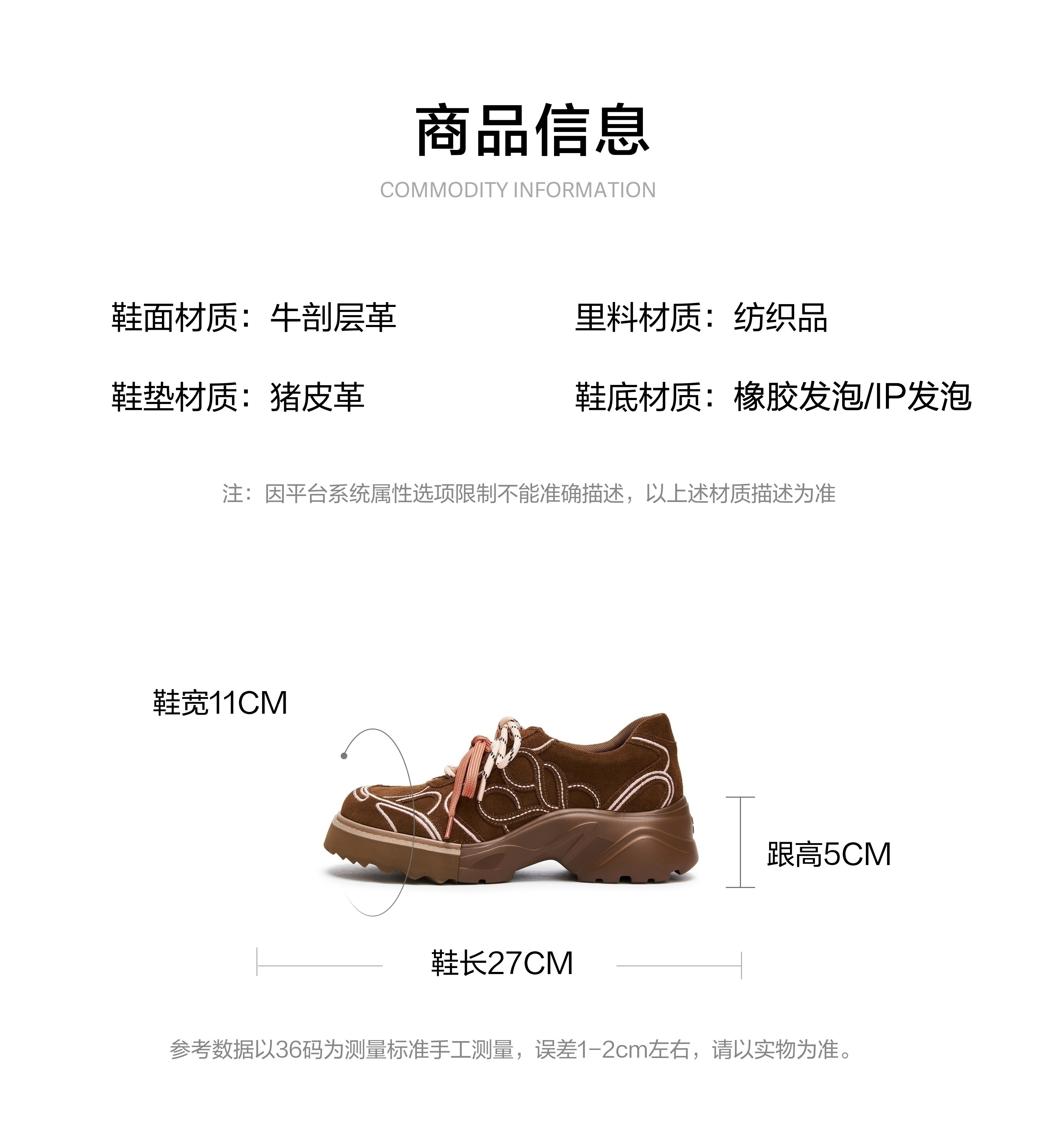 | 鞋头款式:圆头 | 鞋底材质:IP发泡底橡胶发泡底 | 鞋面图案:纯色 | 鞋跟形状:厚底 | 鞋面材质:牛剖层革 |