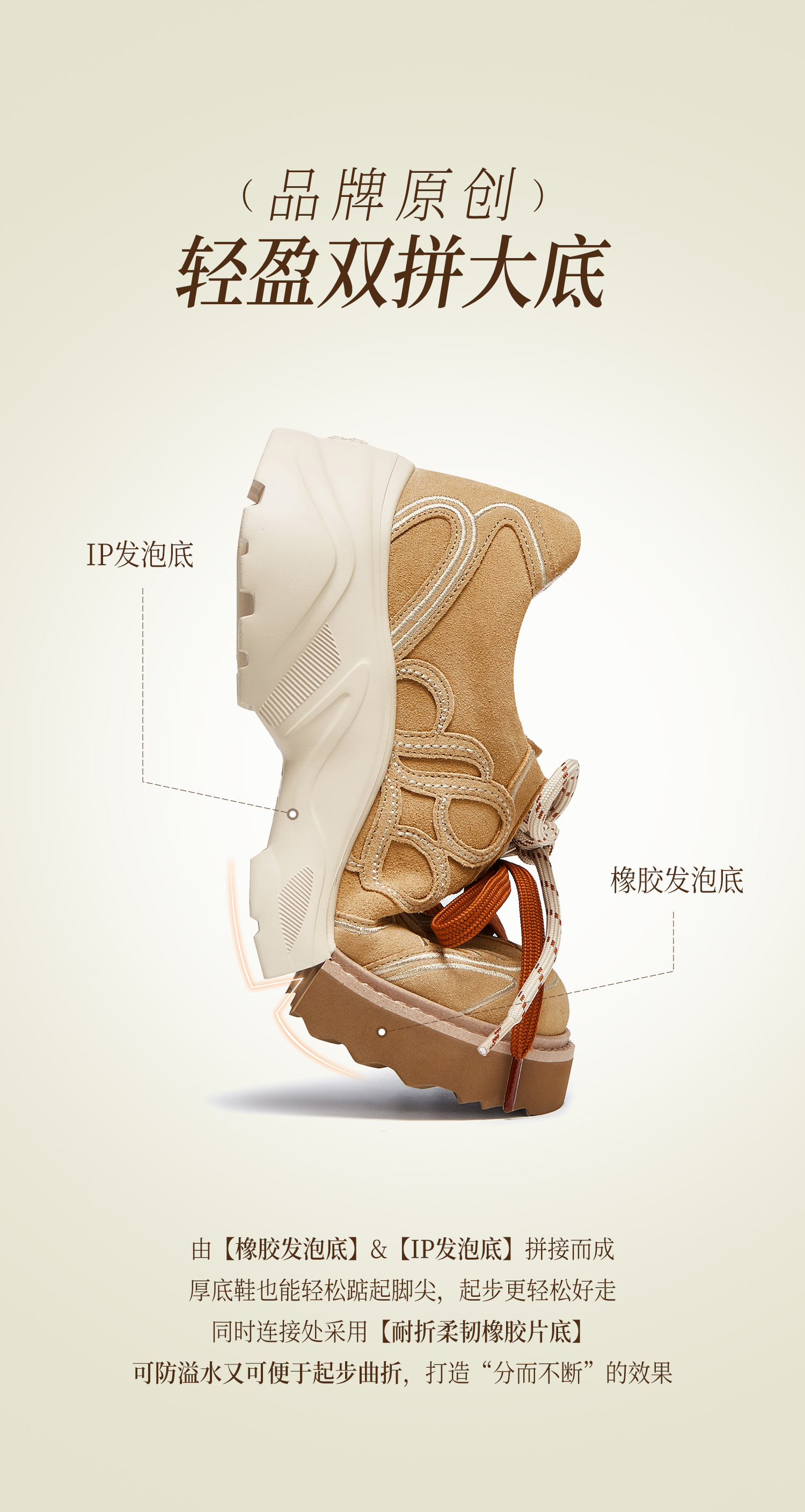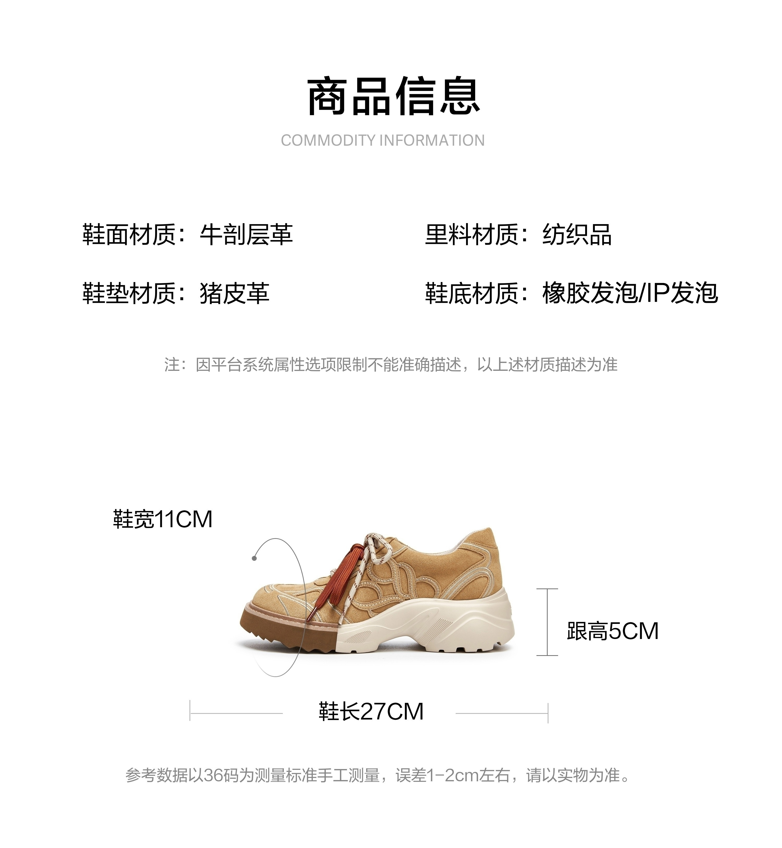 | 鞋头款式:圆头 | 鞋底材质:IP发泡底橡胶发泡底 | 鞋面图案:纯色 | 鞋跟形状:厚底 | 鞋面材质:牛剖层革 |