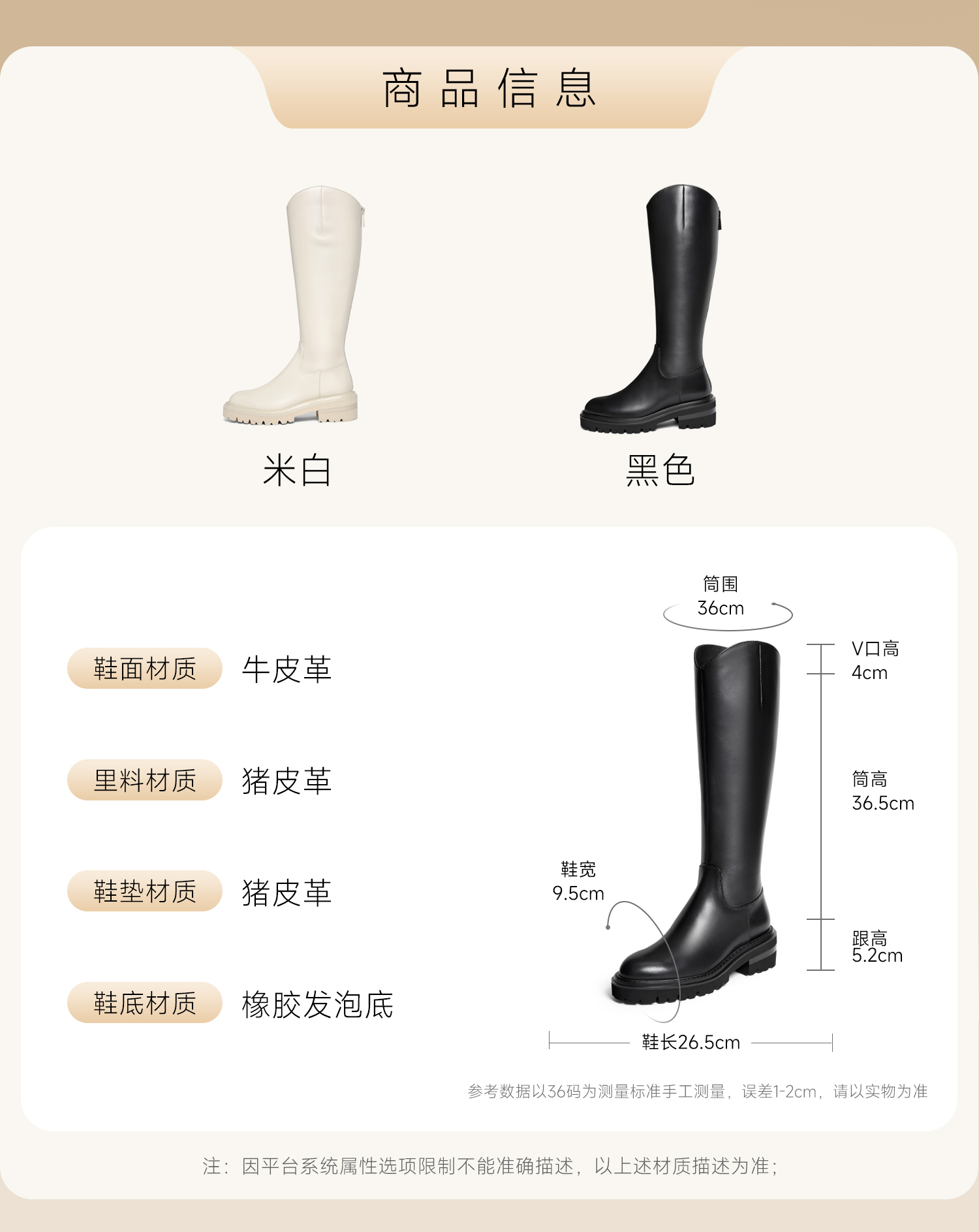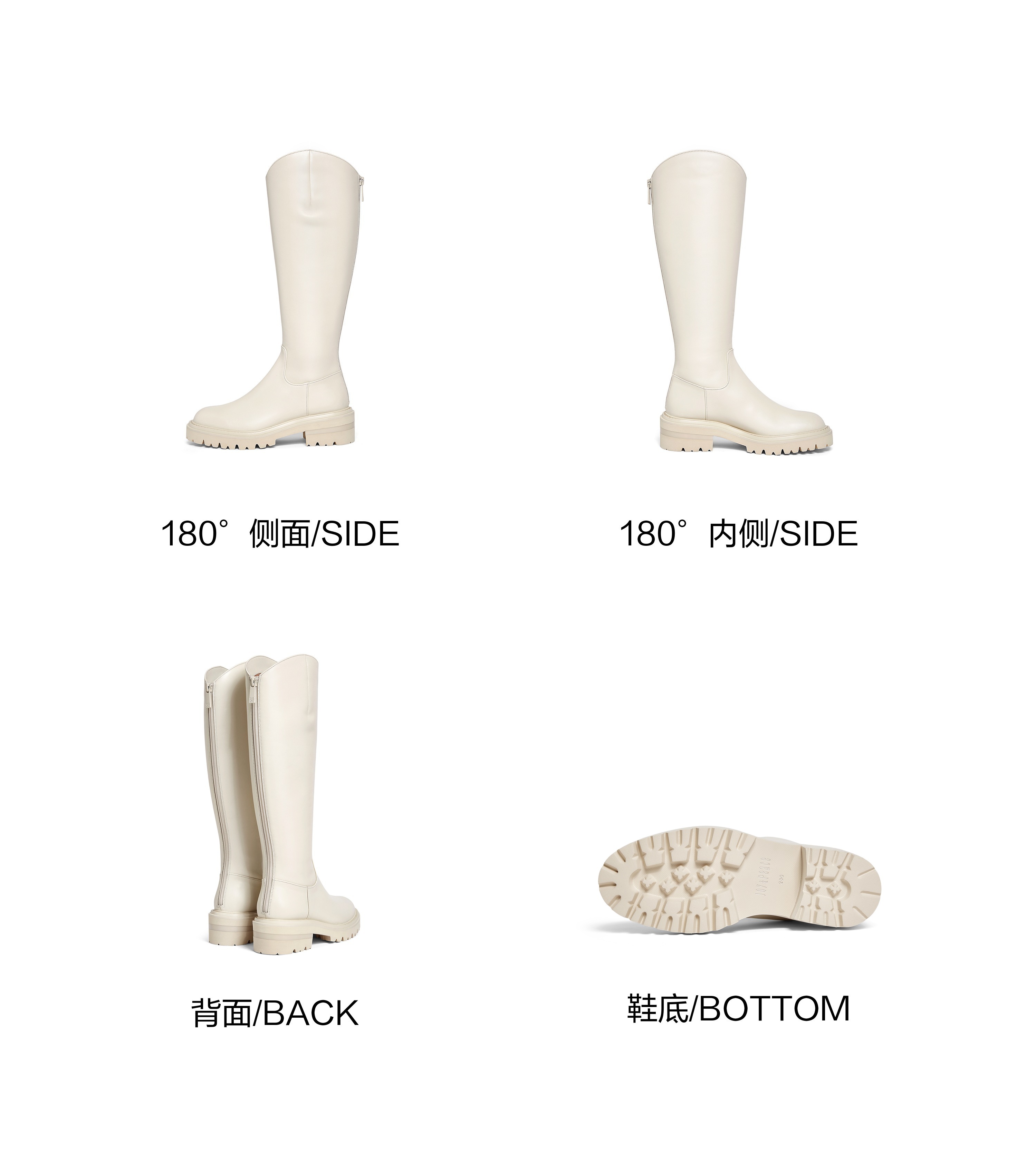 | 风格:英伦 | 鞋面内里材质:猪皮革 | 色系:米白 | 跟高数值:5CM | 筒高数值:36.5CM |