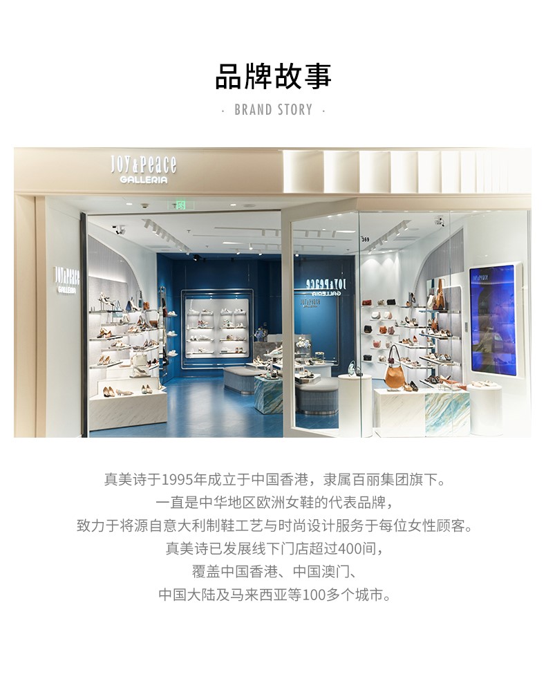 JOY & PEACE(真美诗),品牌于1995年成立于香港,隶属于百丽国际集团,23年以来一直是大中华地区欧洲女鞋的代表品牌。JOY & PEACE致力于将源自意大利的制鞋工艺与时尚设计服务于每位女性。目前JOY & PEACE开设线下门店达400多家,覆盖香港、澳门、中国大陆及马来西亚等100多个城市。