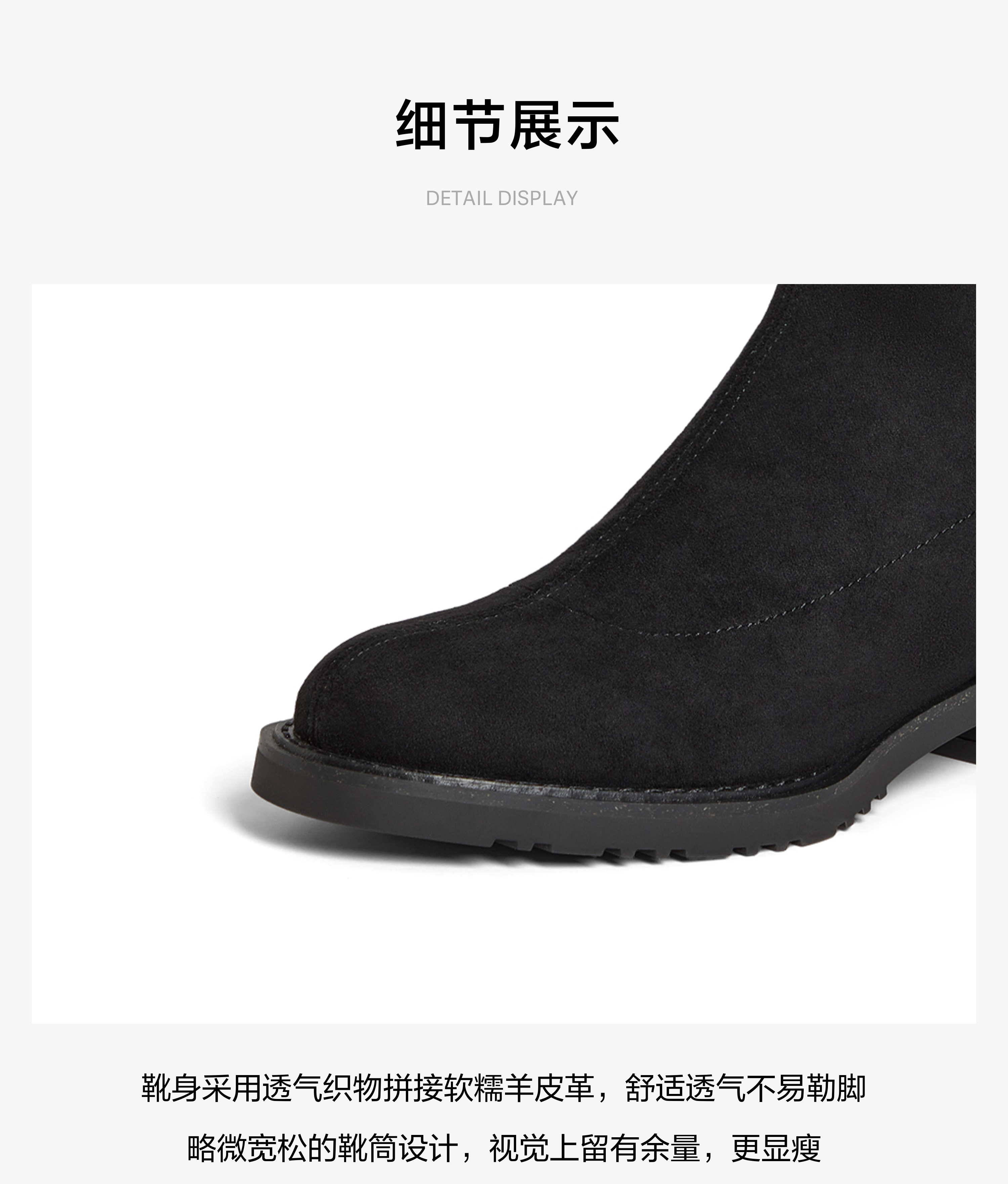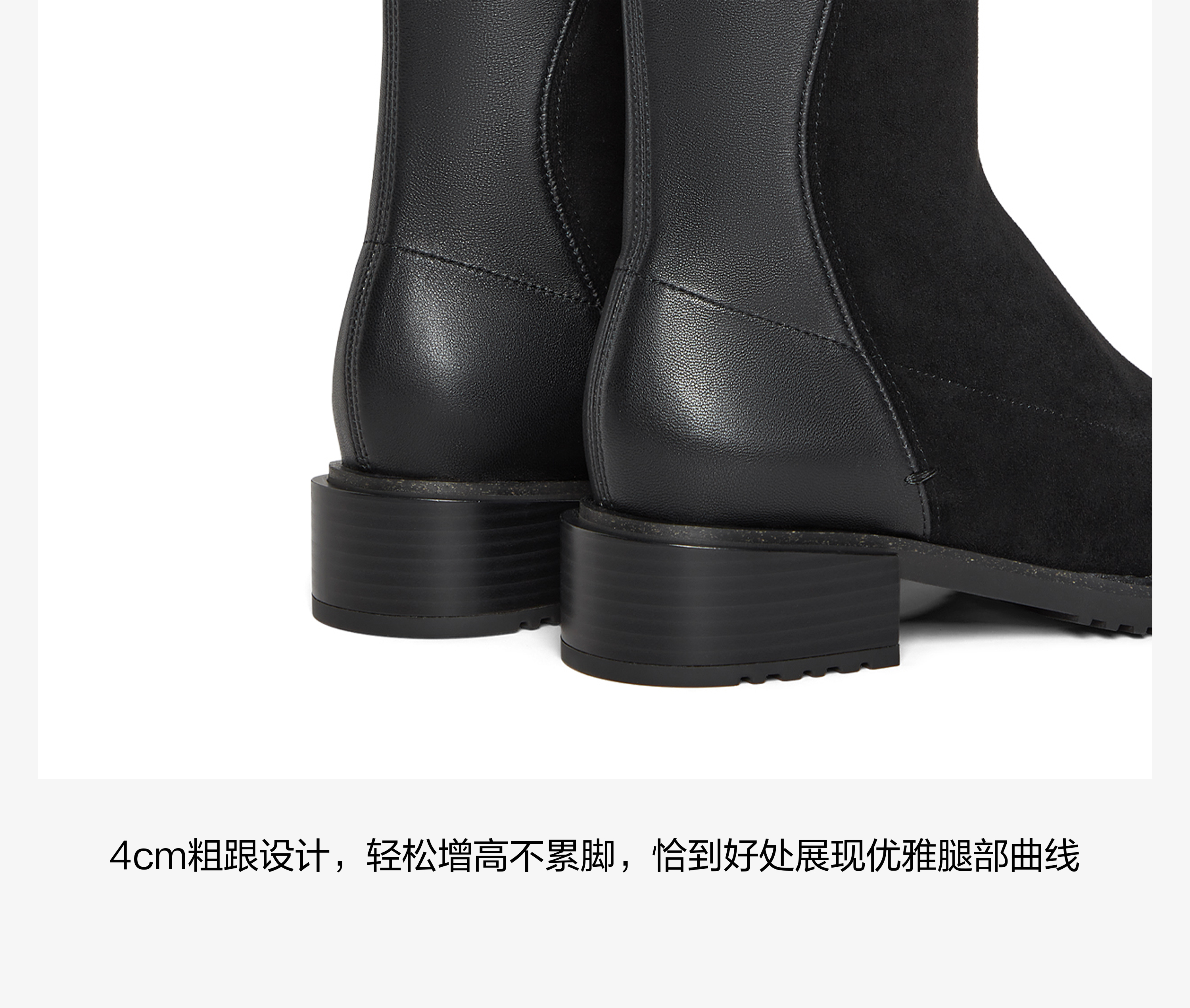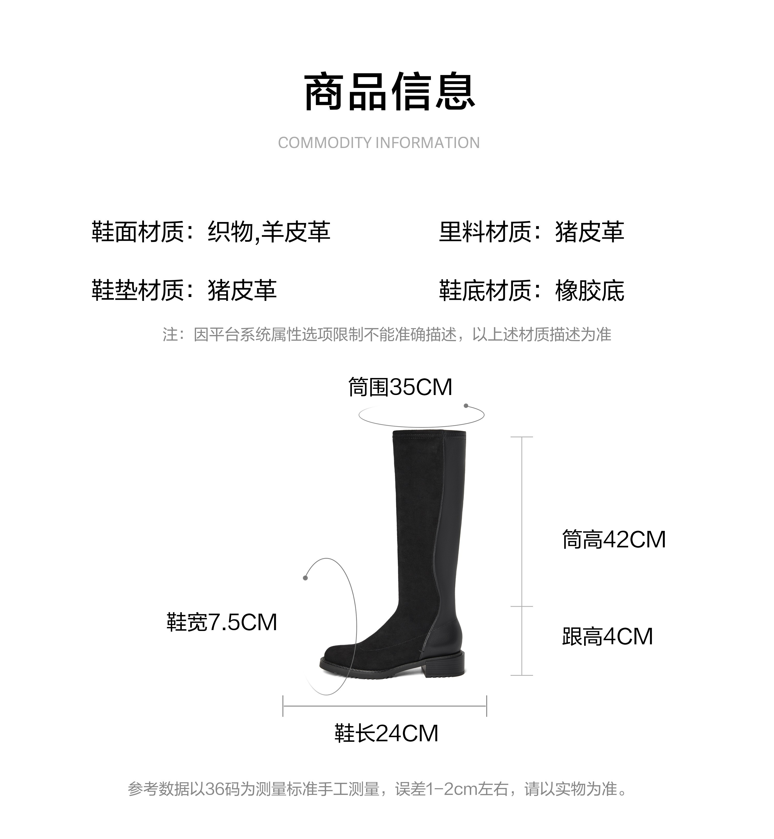 | 风格:帅气 | 鞋面内里材质:猪皮革 | 色系:黑色 | 跟高数值:4CM | 筒高数值:42CM |