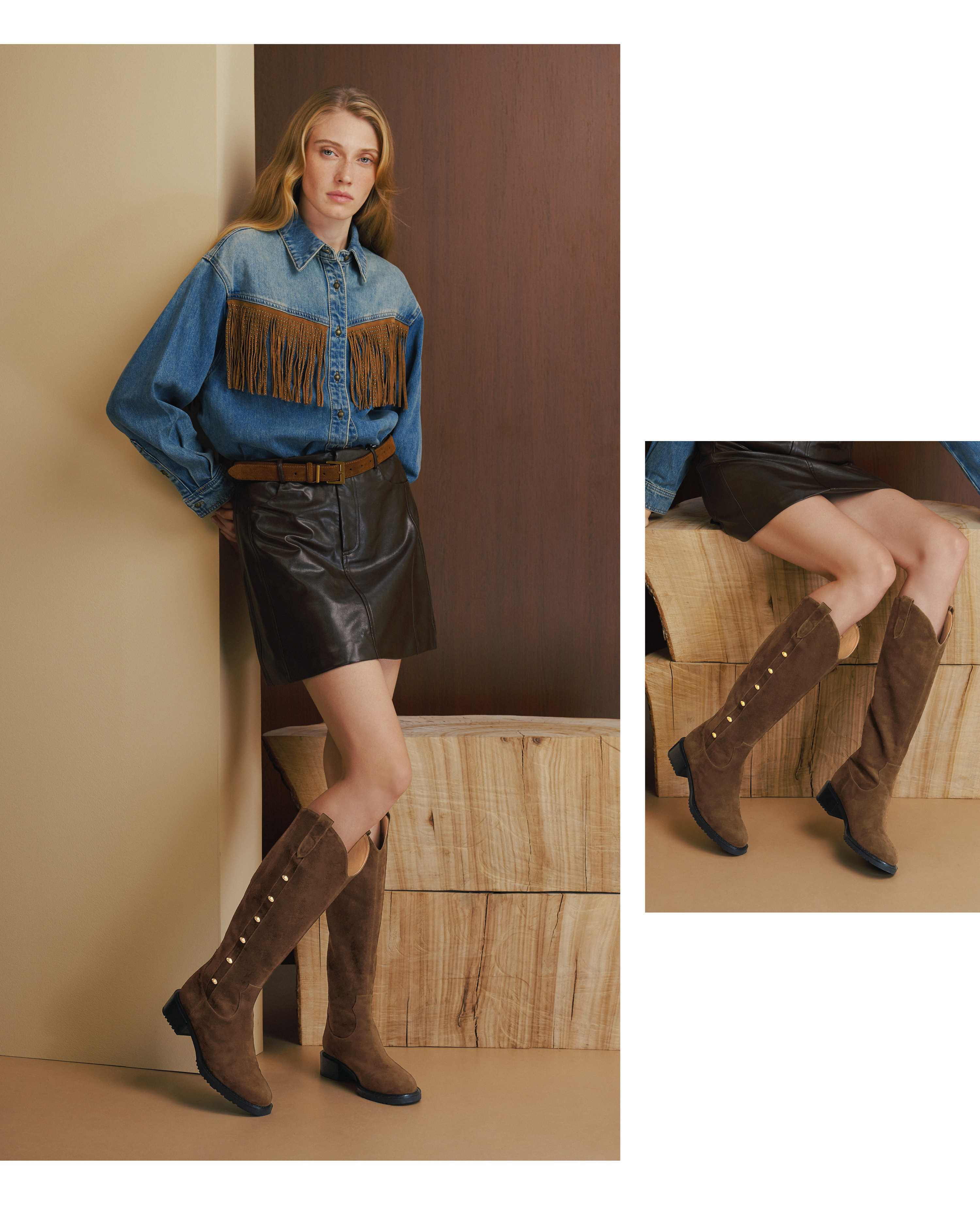 | 风格:帅气 | 鞋面内里材质:织物 | 色系:咖啡色 | 跟高数值:4CM | 筒高数值:41CM |