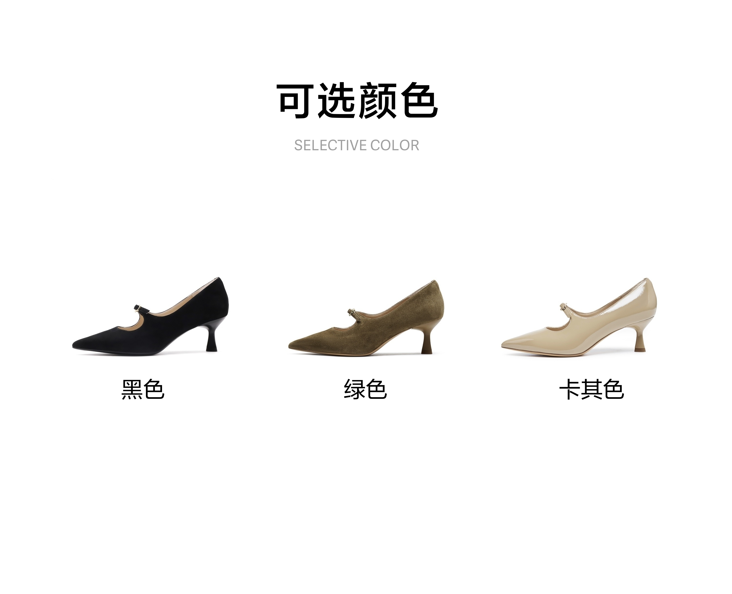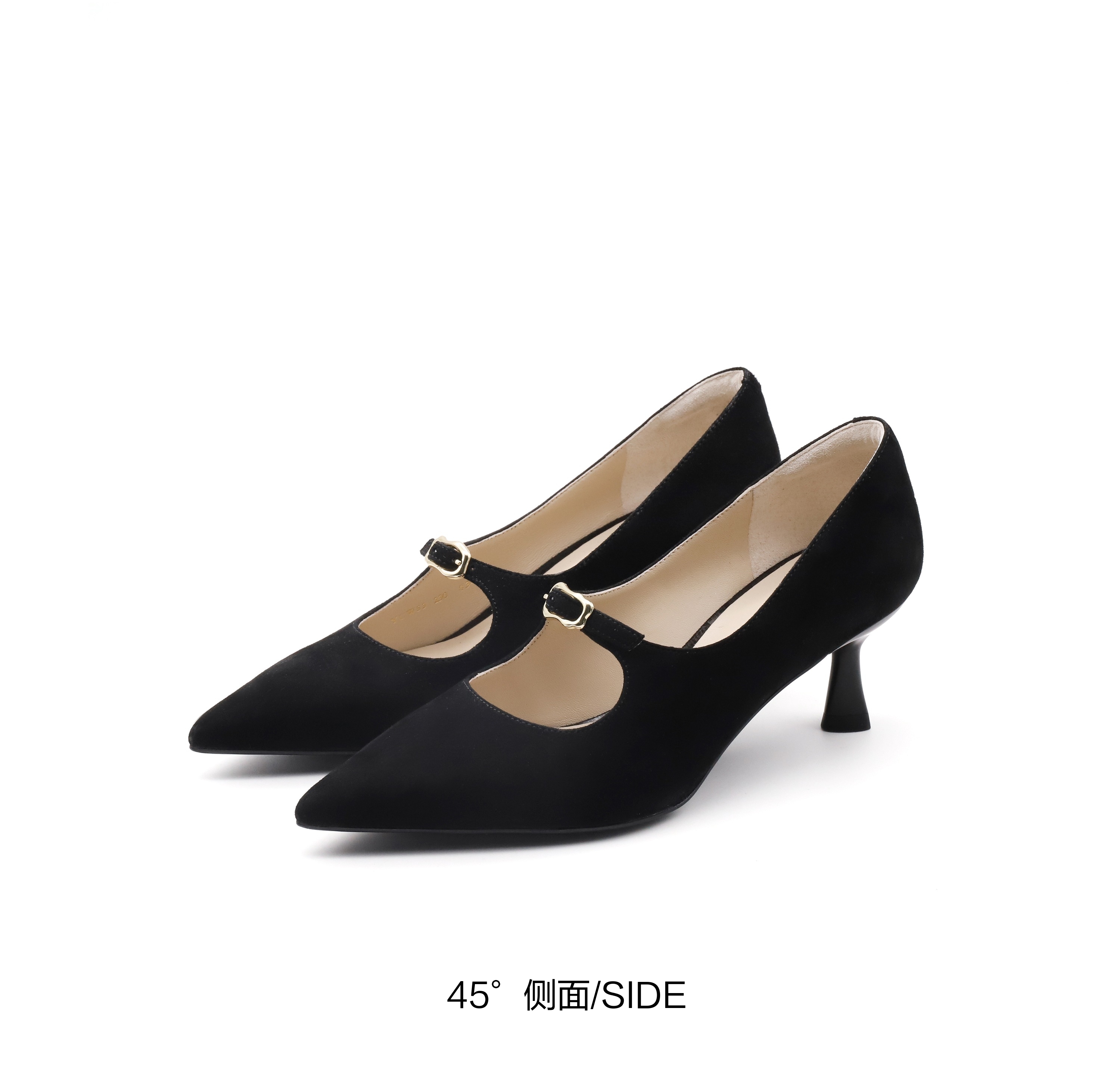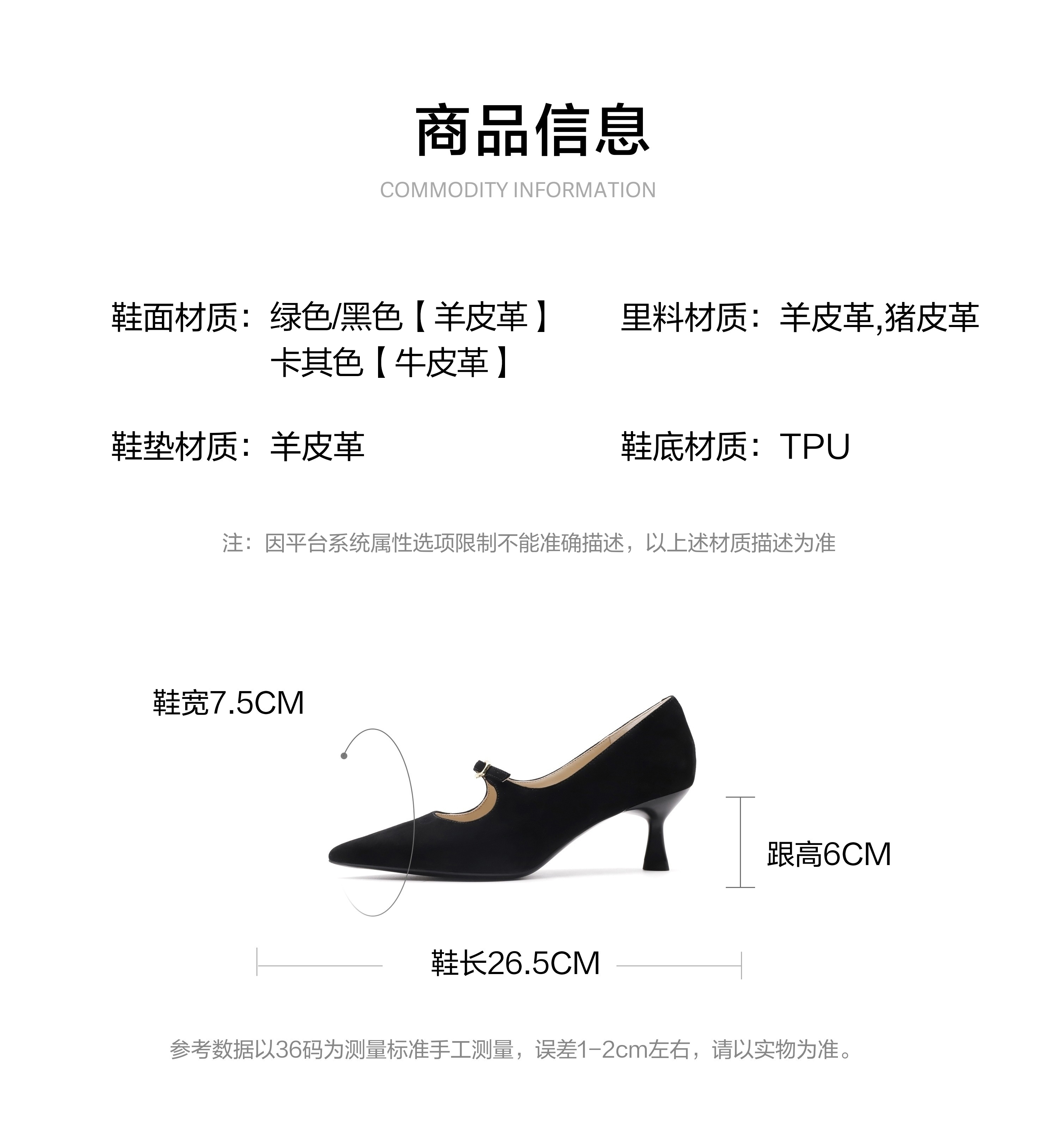 | 鞋类流行款式:玛丽珍鞋 | 鞋头款式:尖头 | 鞋面图案:纯色 | 鞋跟形状:细跟 | 参考鞋长(女):26.5CM |