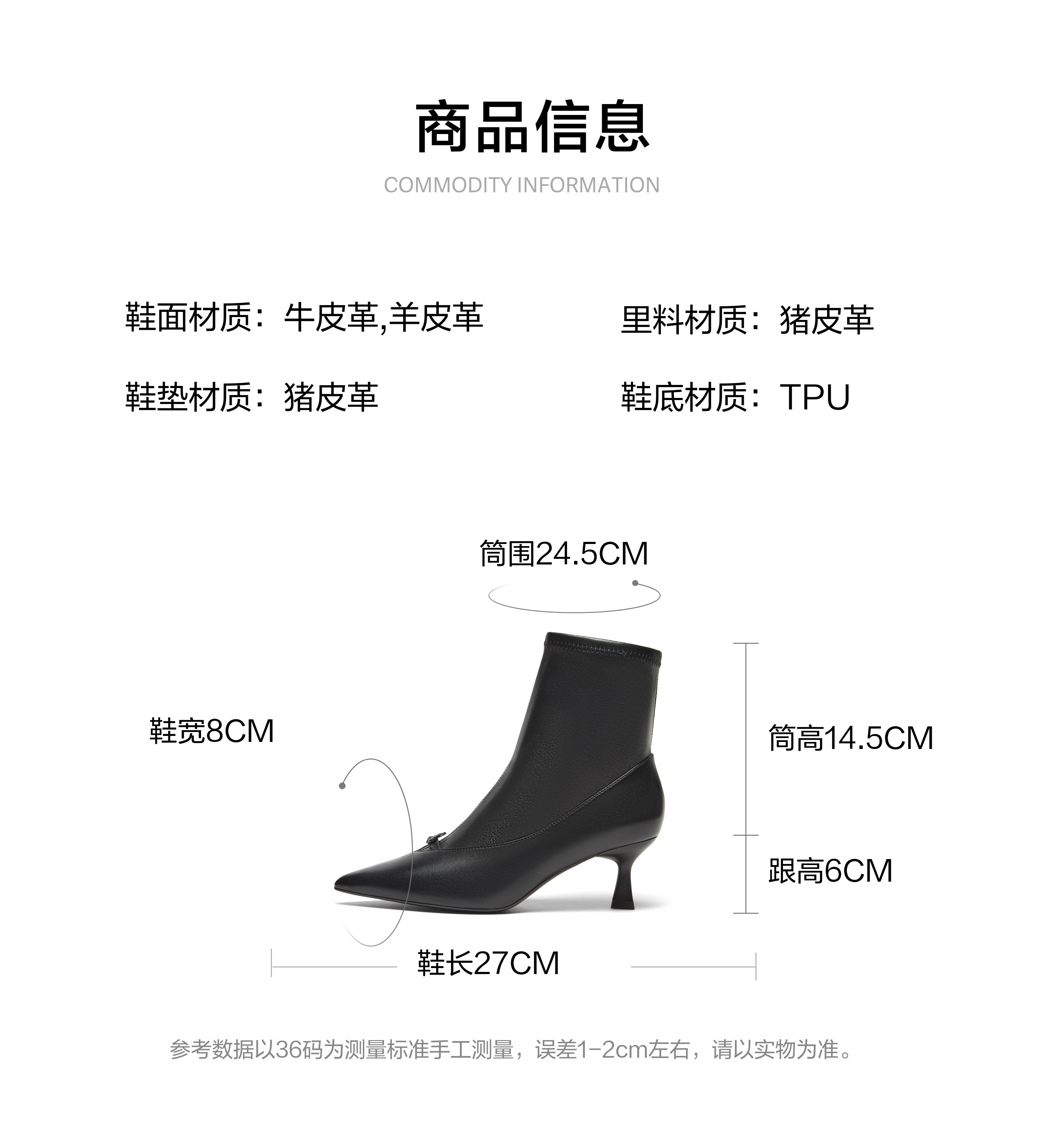 | 参考鞋宽(女):8CM | 风格:优雅 | 色系:黑色 | 跟高数值:6CM | 筒高数值:14.5CM |
