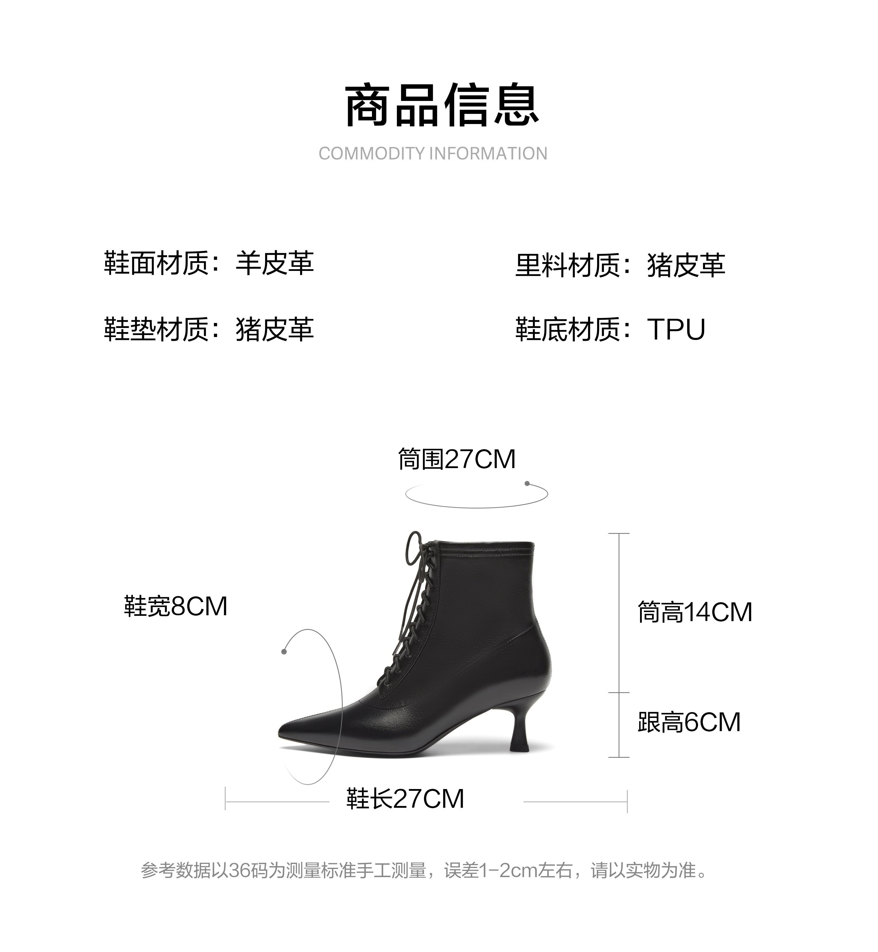 | 鞋底材质:TPU | 靴筒内里材质:猪皮革 | 内增高:无 | 鞋面材质:羊皮革 | 闭合方式:侧拉链 |