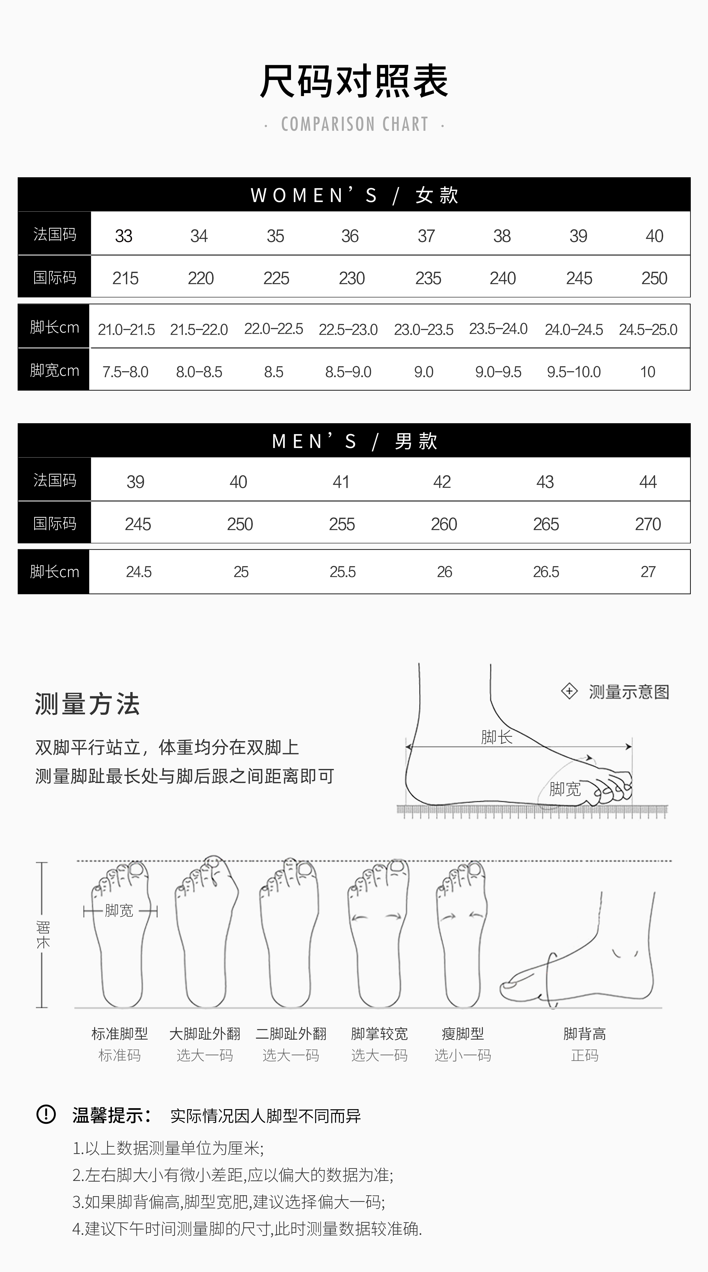 | 法国码 | 32 | 33 | 34 | 35 | 36 | 37 | 38 | 39 | 40 | 41 | 42 |